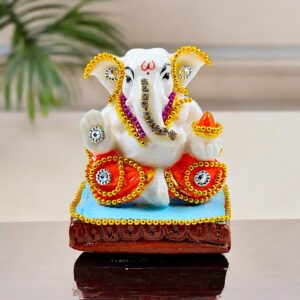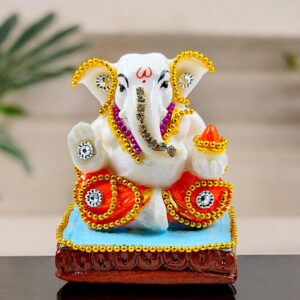 Unique Exquisite White Resin Ganesha Figure | Embellished Lord Ganpati Figure with Colorful Accents for Festive Home Decor & Lucky Gifting – Decorative Piece