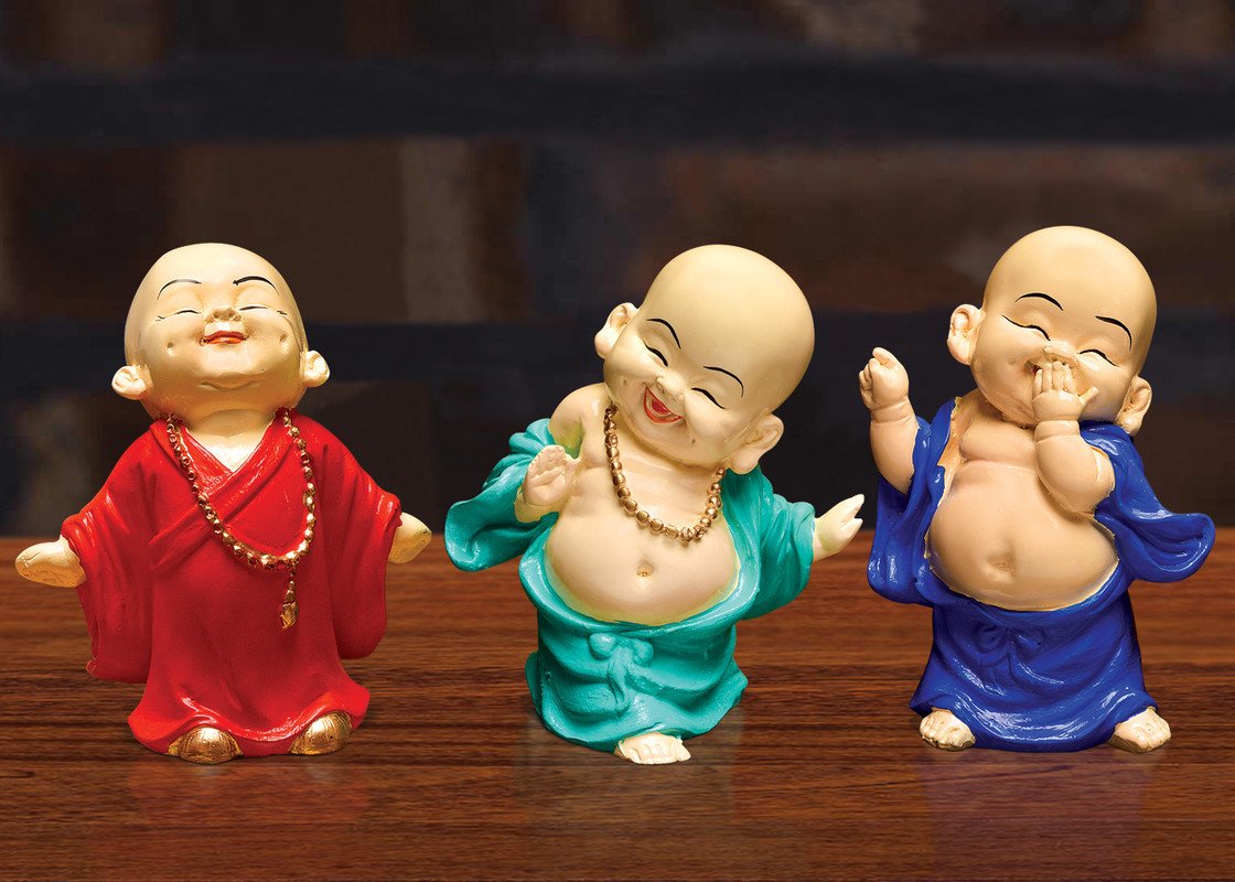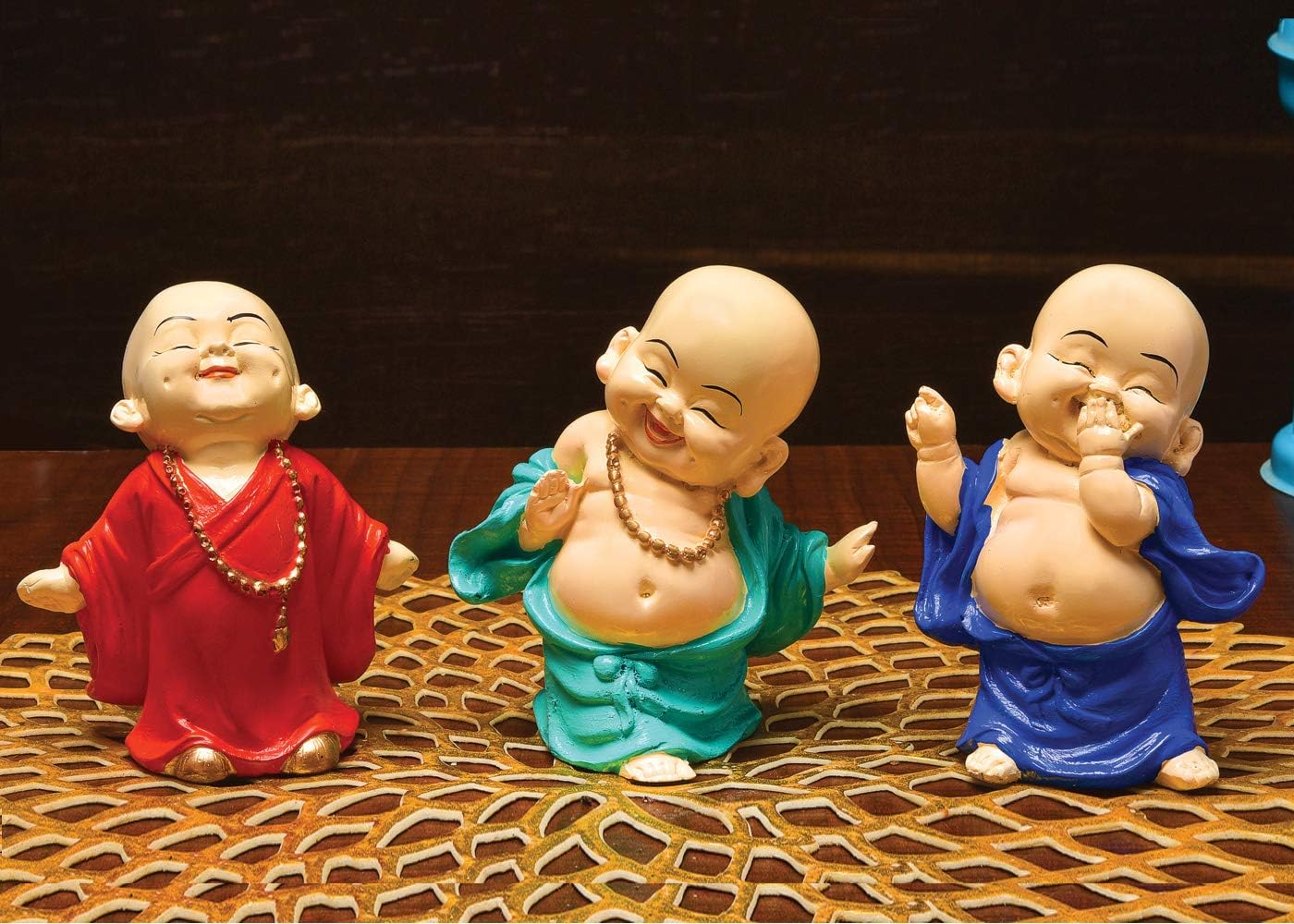 Artistic Artisan Ployresin Three Pieces Standing And Sitting, Laughing ,Happy Lord Buddha Idol Decor Piece Home Decoration/Office Decor/Spiritual Gift, Green, Orange And Blue Colour – Decorative Piece