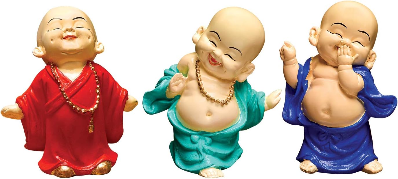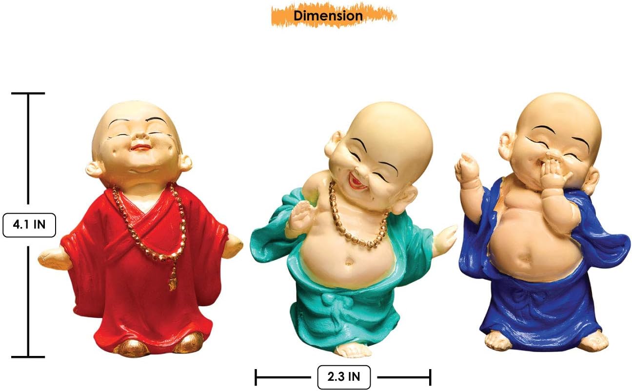 Creative and divine, this Buddha statue is exquisitely crafted from premium resin. A lovely gift for holidays, birthdays or spiritual moments, complementing your living space, study or prayer area. Set of Three Laughing Little Monks: This delightful set includes three charming resin-crafted figurines of little Buddha monks in vibrant robes, each depicting a different aspect of the "Three Wise Monkeys" proverb: Hear No Evil, See No Evil, Speak No Evil. Adorable and Whimsical Design: These adorable little monks with their joyful expressions add a touch of playfulness and innocence to any space. Emblem of Wisdom and Mindfulness: The "Hear No Evil, See No Evil, Speak No Evil" proverb encourages mindfulness and discerning one' influences. Crafted in Durable Resin-Crafted: Made from high- resin-crafted with vibrant, hand- details. Thoughtful and One-Of-A-Kind Gift Set: A heart warming and meaningful gift for housewarmings, little showers, or anyone who appreciates adorable and symbolic home decor. Vibrant and Eye- Colours: Each monk is dressed in a brightly coloured robe (red, turquoise, blue), adding a cheerful touch. Compact and Displayable: Their small size makes them easy to arrange and display in various settings. Bring Joy and Positive Energy: These laughing little monks are sure to bring a smile to your face and create a positive atmosphere. An elegant addition to your home or workspace.