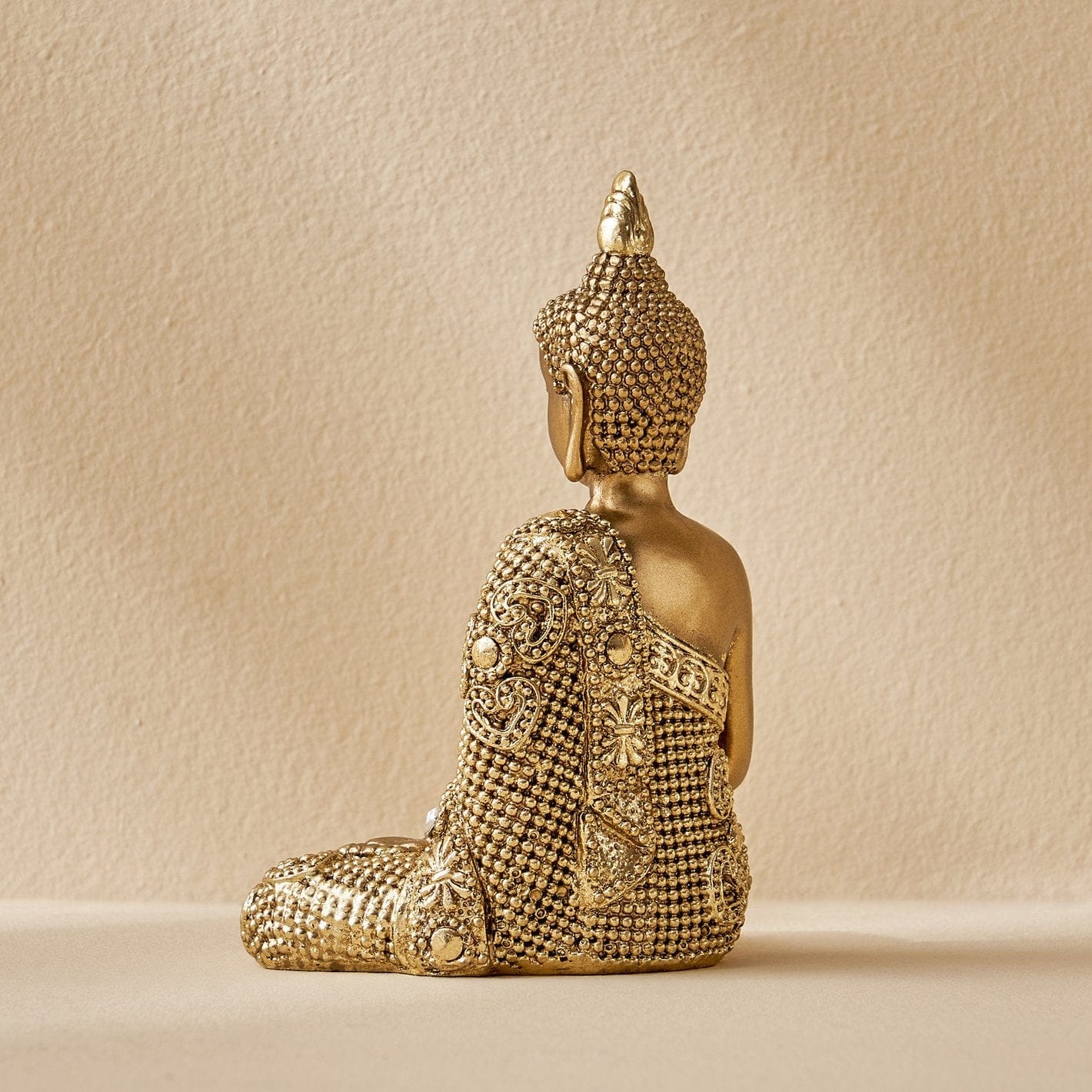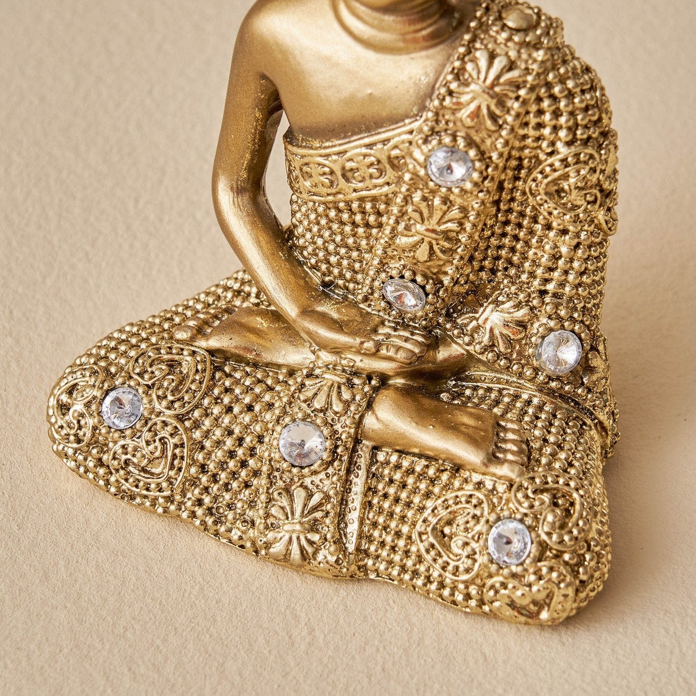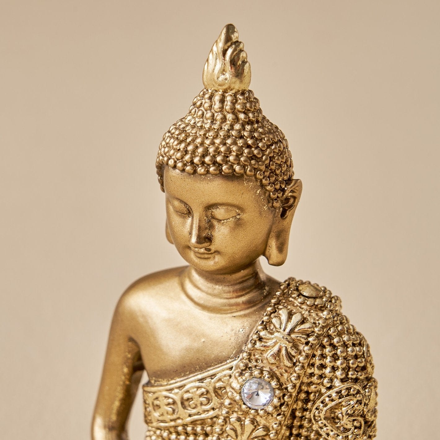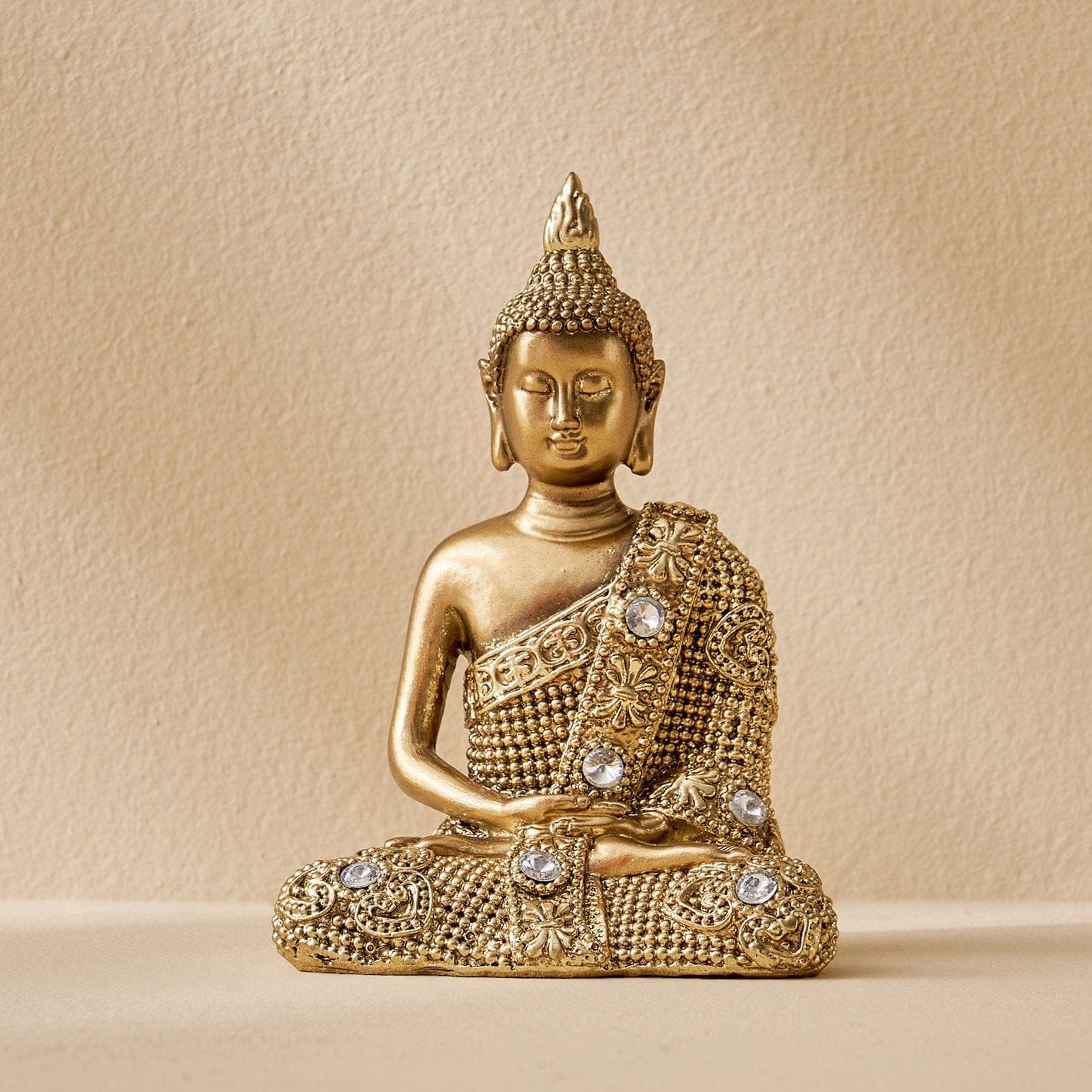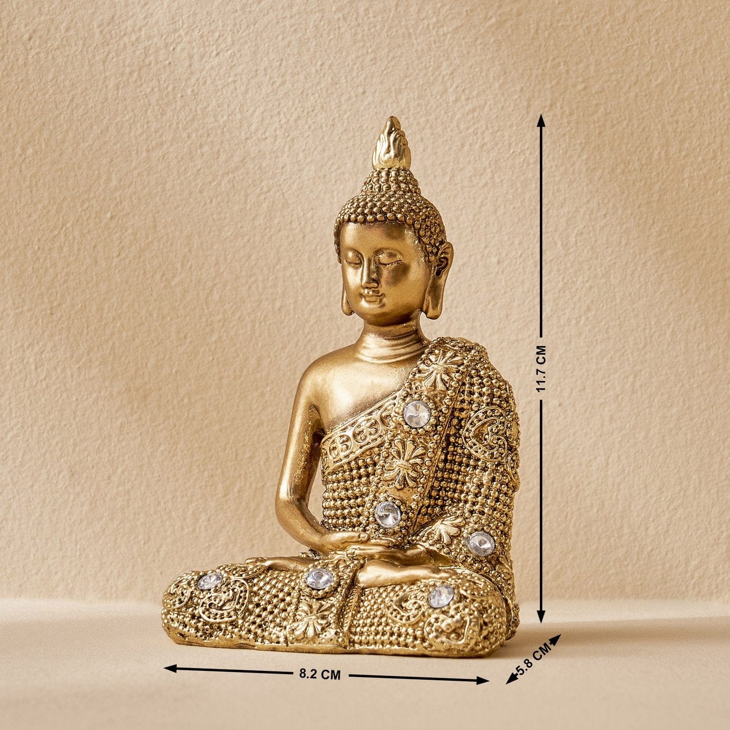 Stylish and exquisite, this Buddha statue is exquisitely crafted from premium resin. A lovely gift for holidays, birthdays or spiritual moments, complementing your living space, study or prayer area. Buddha Figurine in Dhyana Mudra: Featuring the meditative Dhyana Mudra (gesture of meditation), this figurine embodies deep serenity, mindfulness, and inner peace Antique Gold Finish with Crystal Embellishments: Gracefully finished in a rich antique gold tone and adorned with decorative faux crystals that enhance its divine presence and luxurious appeal. High-Quality Resin-Crafted Build: Crafted from top- resin-crafted that is both lightweight and long- ensuring it stays lovely for years to come. Refined Home Decor Accent: A timeless addition to your home, office, meditation room, or entryway. Adds a spiritual and artistic touch to any home decor styleclassic or contemporary. Symbolizes blessings, calmness, and positive energy. Compact Yet Impactful: The size and posture of this Buddha make it Artisan Detailing: From the facial expression to the robe textures and sparkling embellishmentsthis figurine showcases detailed craftsmanship that draws attention and admiration. Perfect for adding a stylish accent to your living space.