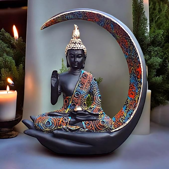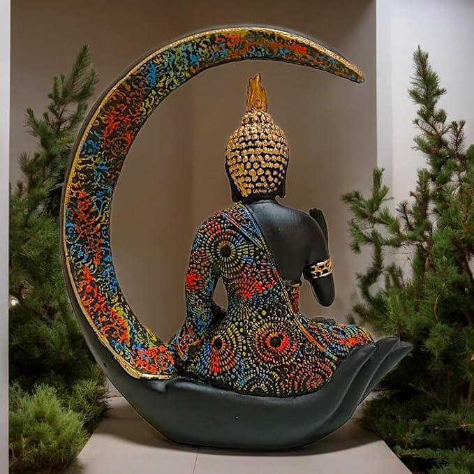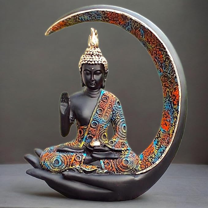 Graceful and spiritual, this Buddha statue is beautifully made from handcrafted resin. An excellent choice for spiritual and decorative gifting, gracefully decorating your table, shelf or altar. Serene Meditative Moon Buddha: This captivating resin-crafted figurine features a Buddha figure in a deep state of meditation, gracefully seated within a decorative crescent moon. Symbolic Hand and Moon Design: The Buddha rests in a symbolic hand, representing protection and offering, while the moon often signifies enlightenment and serenity. Detailed and Colourful Details: The figurine showcases detailed carvings and a rich, multi- pattern on the Buddha' robe and the moon. Crafted in Durable Resin-Crafted: Made from high- resin-crafted, ensuring lasting beauty and detailed detailing. Spiritual and Meaningful Gift: A thoughtful and inspiring gift for those seeking inner peace, spiritual growth, or Buddhist teachings. and Calming Presence: The meditative Buddha emanates a sense of calm and serenity, promoting relaxation and mindfulness. Makes an eye-catching addition to your office or home.