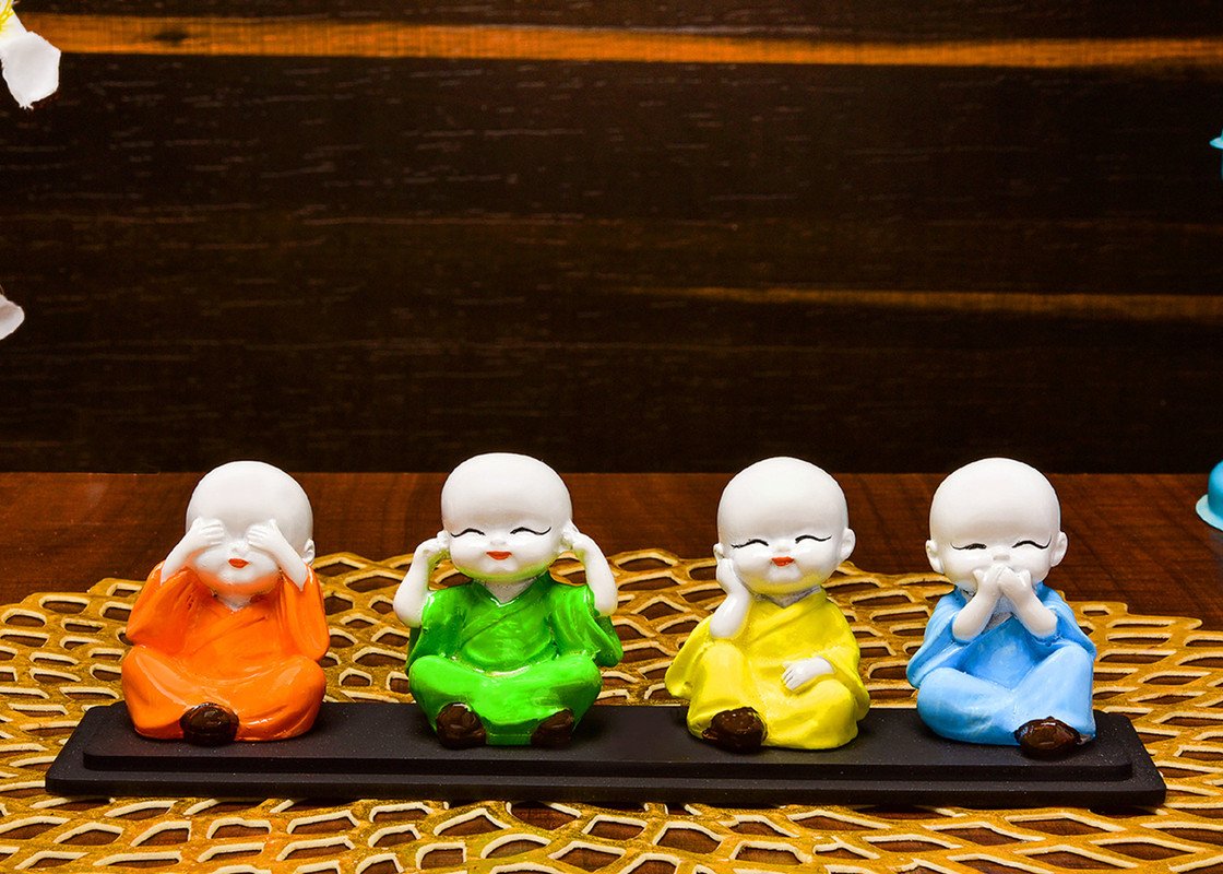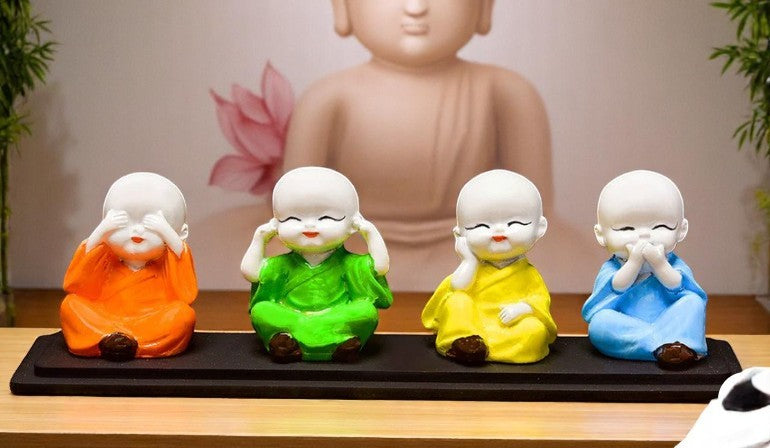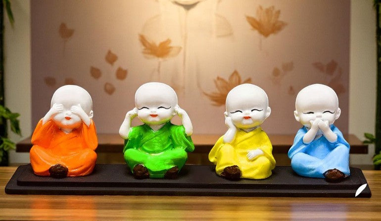 Elegant and sacred, this Buddha statue is meticulously crafted from resin-made. Perfect for festive gifting and celebrations, bringing beauty to your home temple, office desk or study. Mindful Expressions, Playful Charm Features the classic See No Evil, Hear No Evil, Speak No Evil poses with a adorable twist, plus a fourth monk for added fun! Vibrant, Joyful Colours Dressed in eye- orange, green, yellow, and blue robes that brighten up any corner of your space. Add Calm + Whimsy to Any Room A lovely blend of spirituality and playfulness, perfect for study desks, bookshelves, living rooms, or office dcor. Sturdy Resin-Crafted with Hand- Finish Lightweight, durable, and finely crafted with attention to detail. A Gift That Speaks From the Soul Compact Size, Big Impact Doesn' take much space but makes a fashionable spiritual statement wherever placed. Great for Kids and Adults Alike A thoughtful gift for anyone who loves playful yet meaningful home decoration. Makes an eye-catching addition to your office or home.