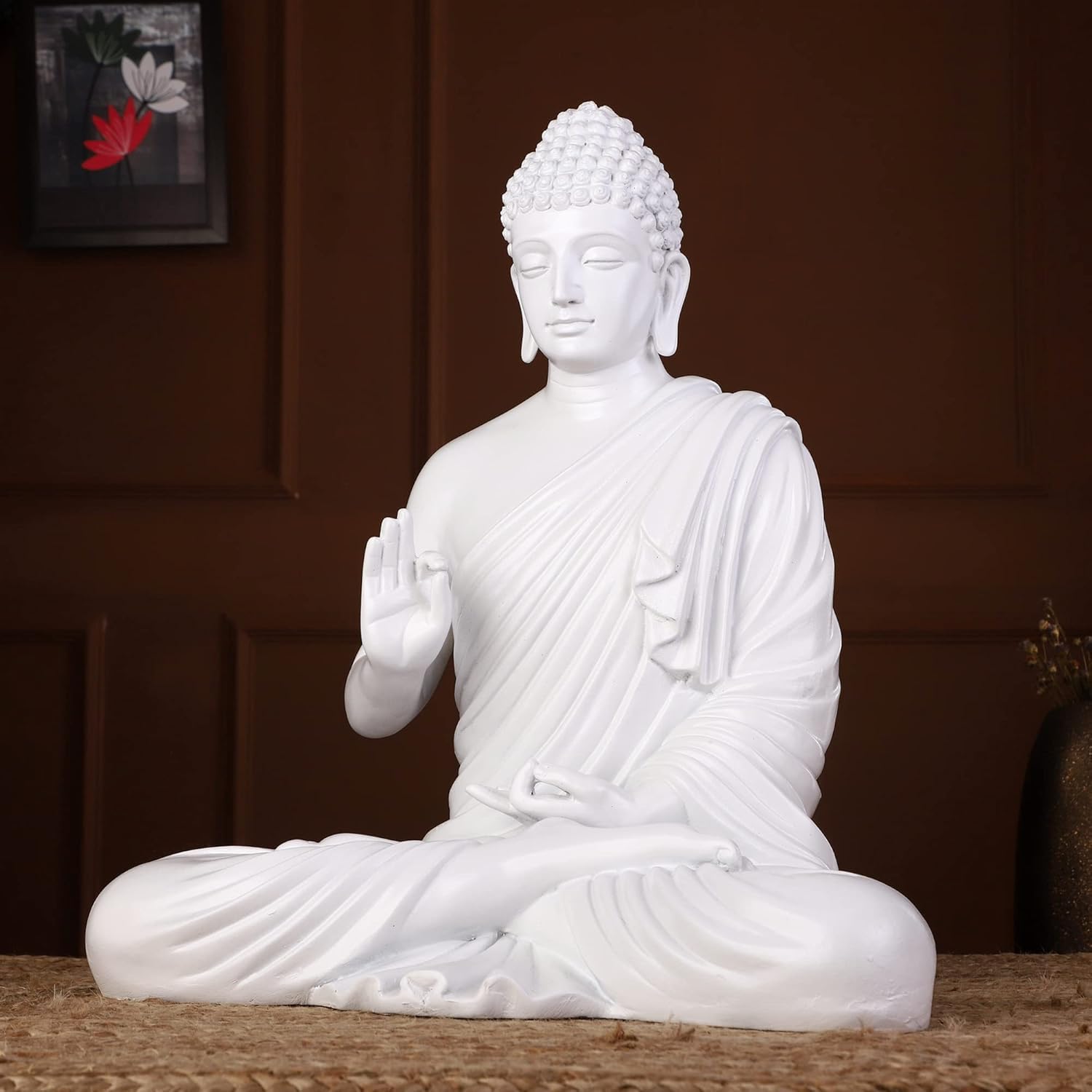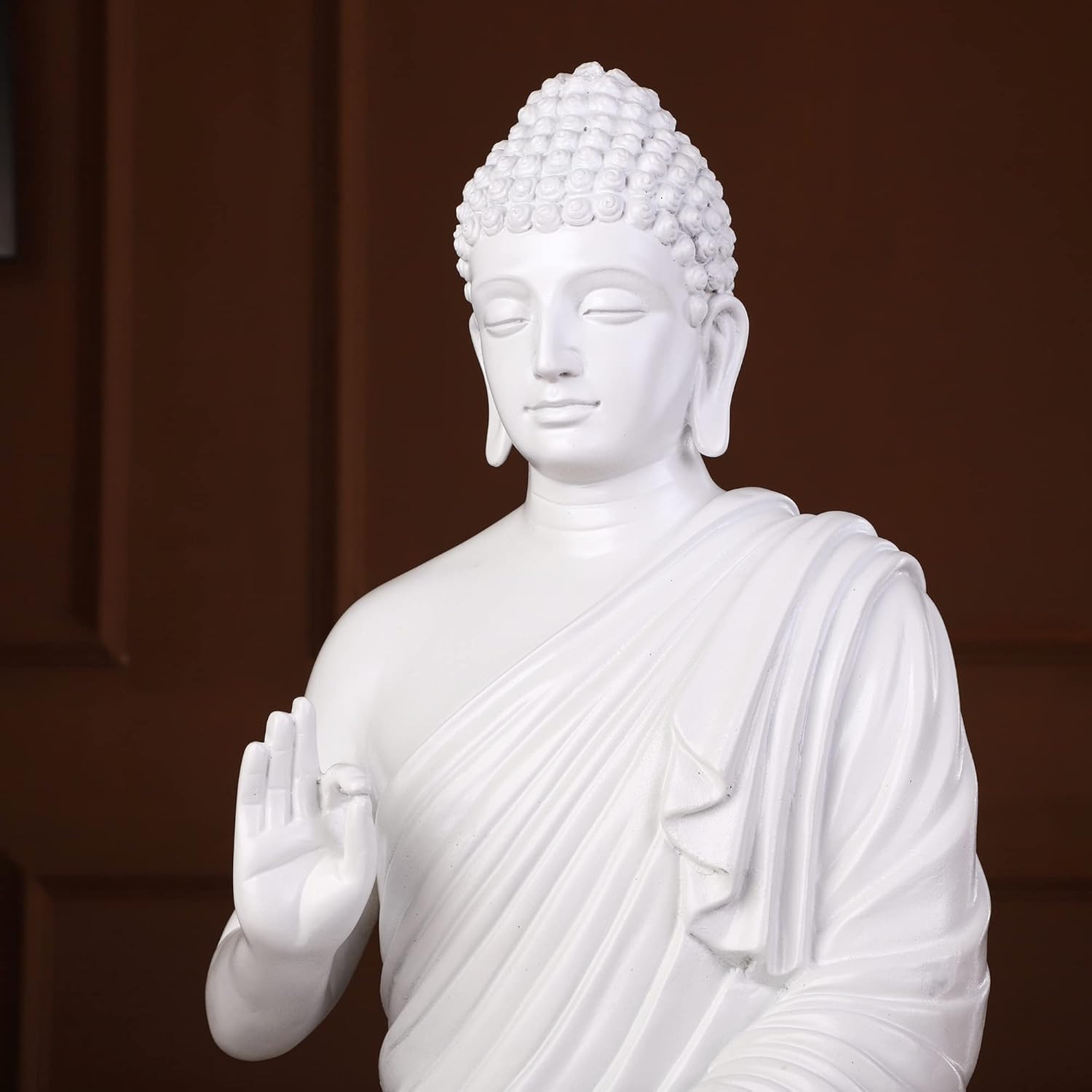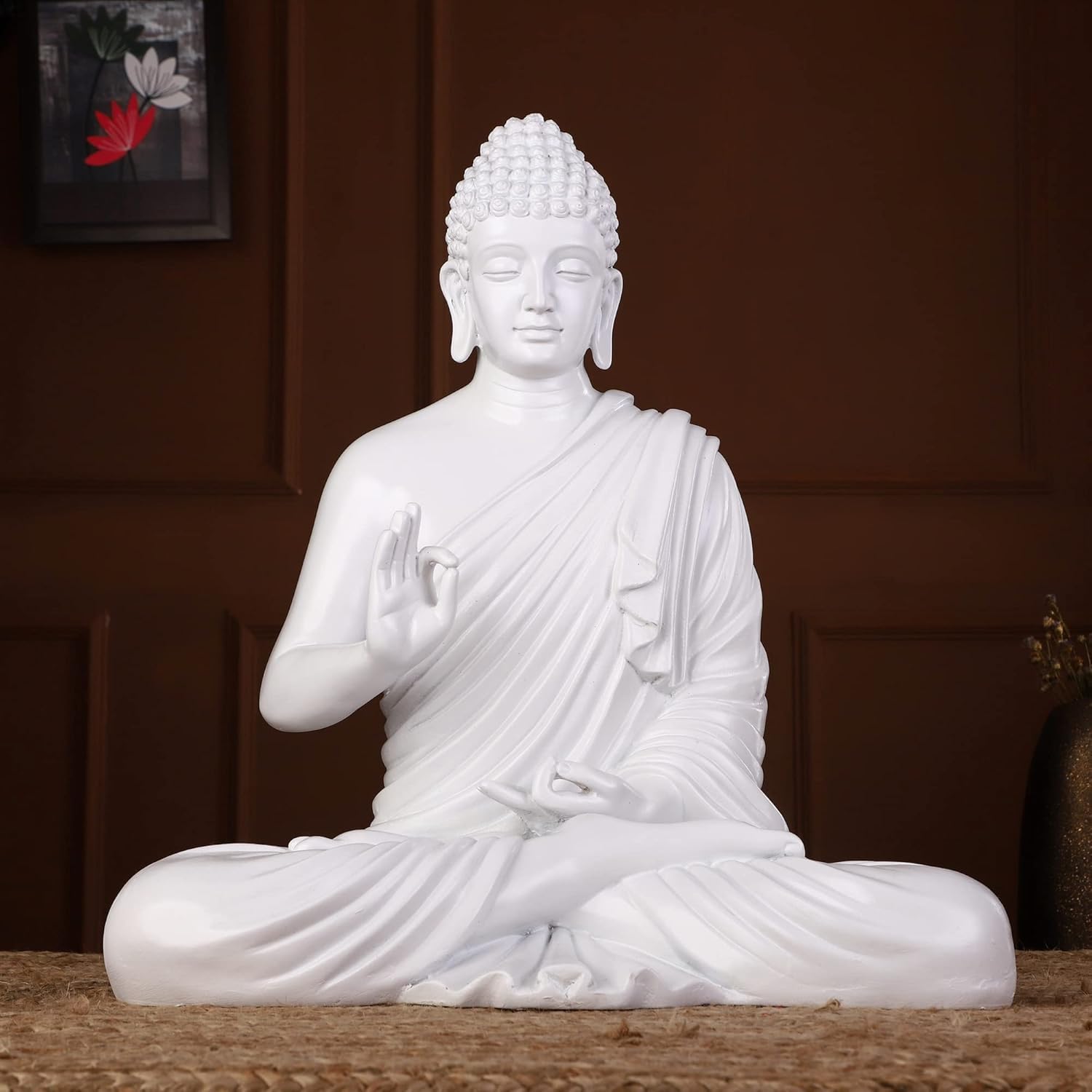 Luxurious and sophisticated, this Buddha statue is exquisitely crafted from premium resin. A lovely gift for holidays, birthdays or spiritual moments, complementing your living space, study or prayer area. Pure White Meditative Buddha Figurine: This exquisite resin-crafted figurine depicts Lord Buddha in a classic meditative posture, finished in a pristine white, radiating profound peace and purity. Emblem of Enlightenment and Calm: The tranquil expression and meditative pose encourage mindfulness and bring a sense of spiritual harmony to any space. Intricately Crafted Details: Showcases finely sculpted features, including the hair curls, serene facial expression, and the refined folds of his robes, highlighting superior craftsmanship. High- Resin-Crafted Material: Made from durable, high- resin-crafted, ensuring longevity and ease of display, maintaining its pristine appearance over time. Versatile Home and Office Decor: Perfect for enhancing the ambiance of your living room, meditation space, yoga studio, office desk, or as a sacred focal point. Meaningful Spiritual Gift: An ideal and thoughtful gift for housewarmings, weddings, spiritual occasions, or for anyone seeking peace and inner harmony. Stable and Graceful Design: Designed with a balanced posture and a sturdy base, making it easy to display securely on any flat surface. Makes an eye-catching addition to your office or home.