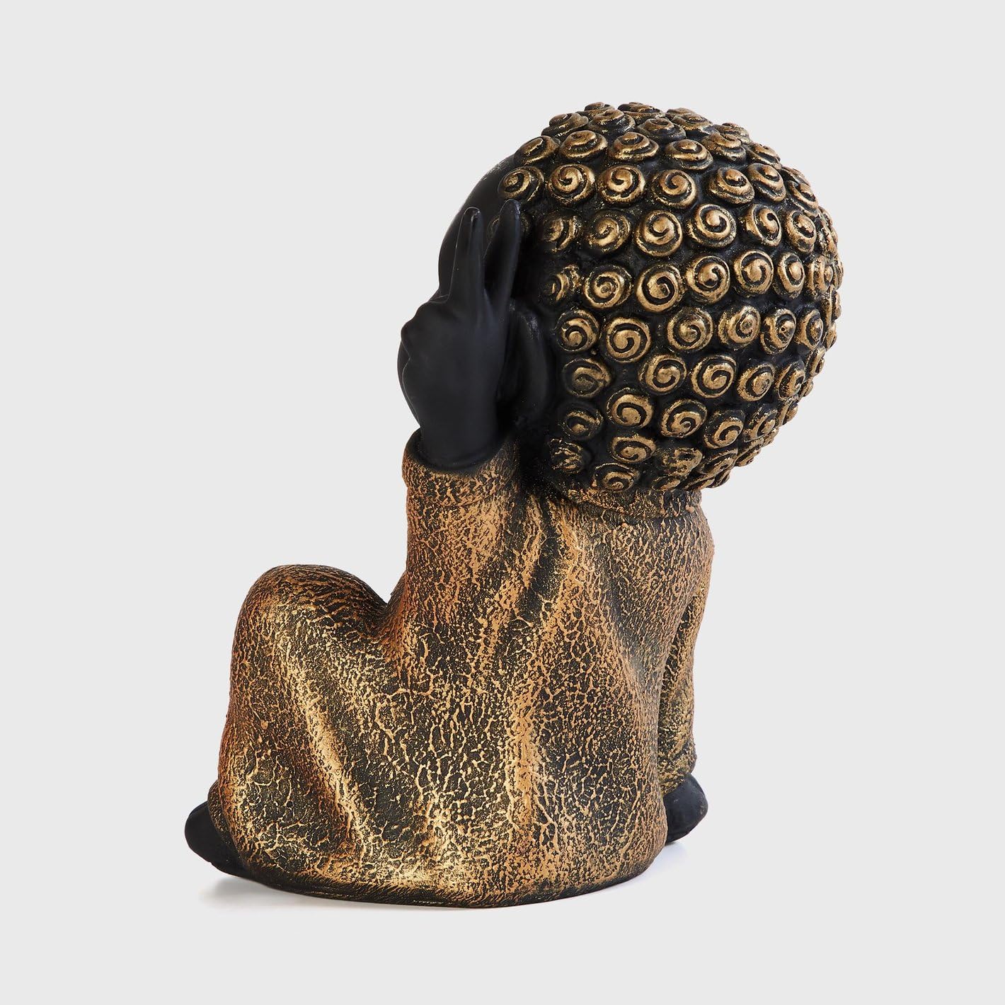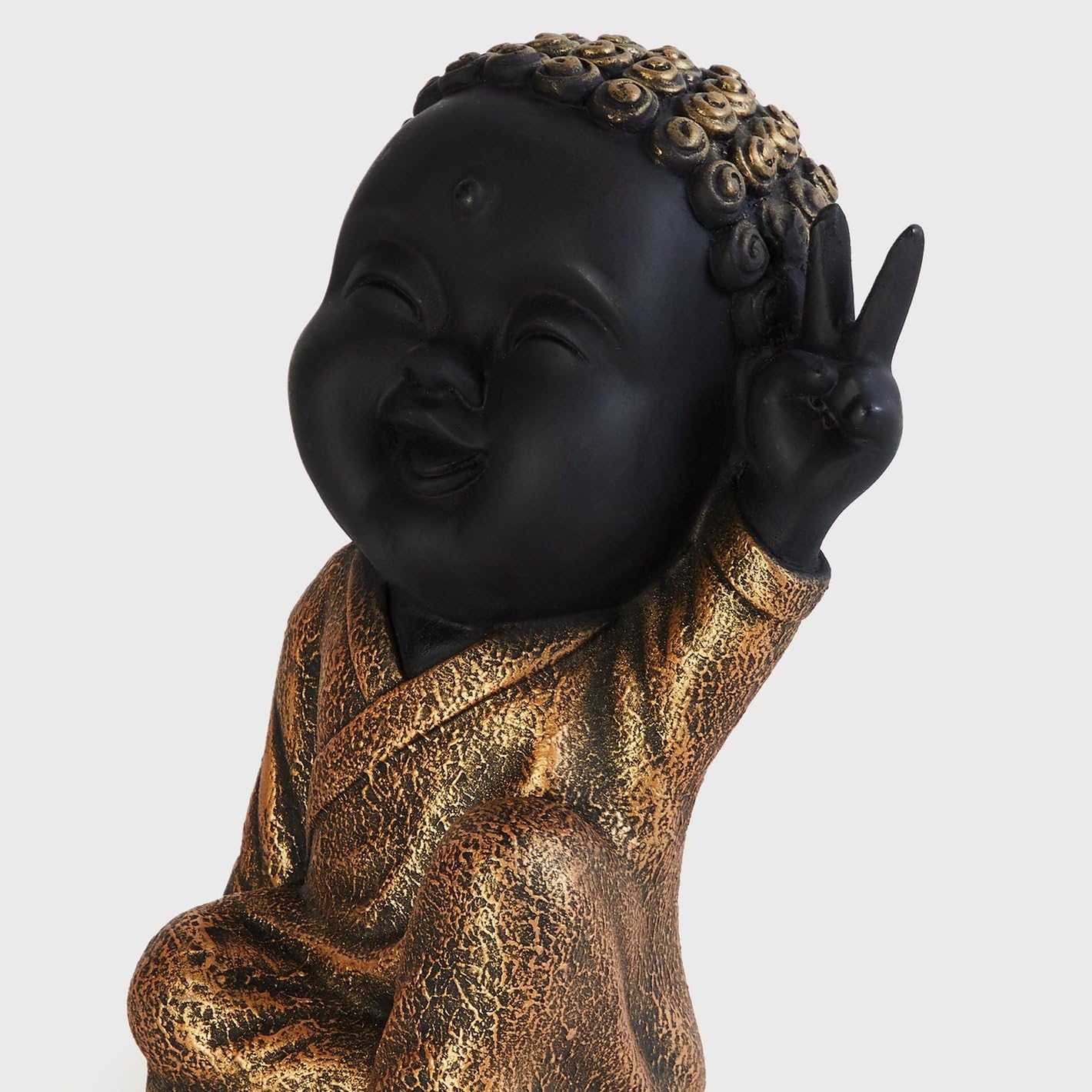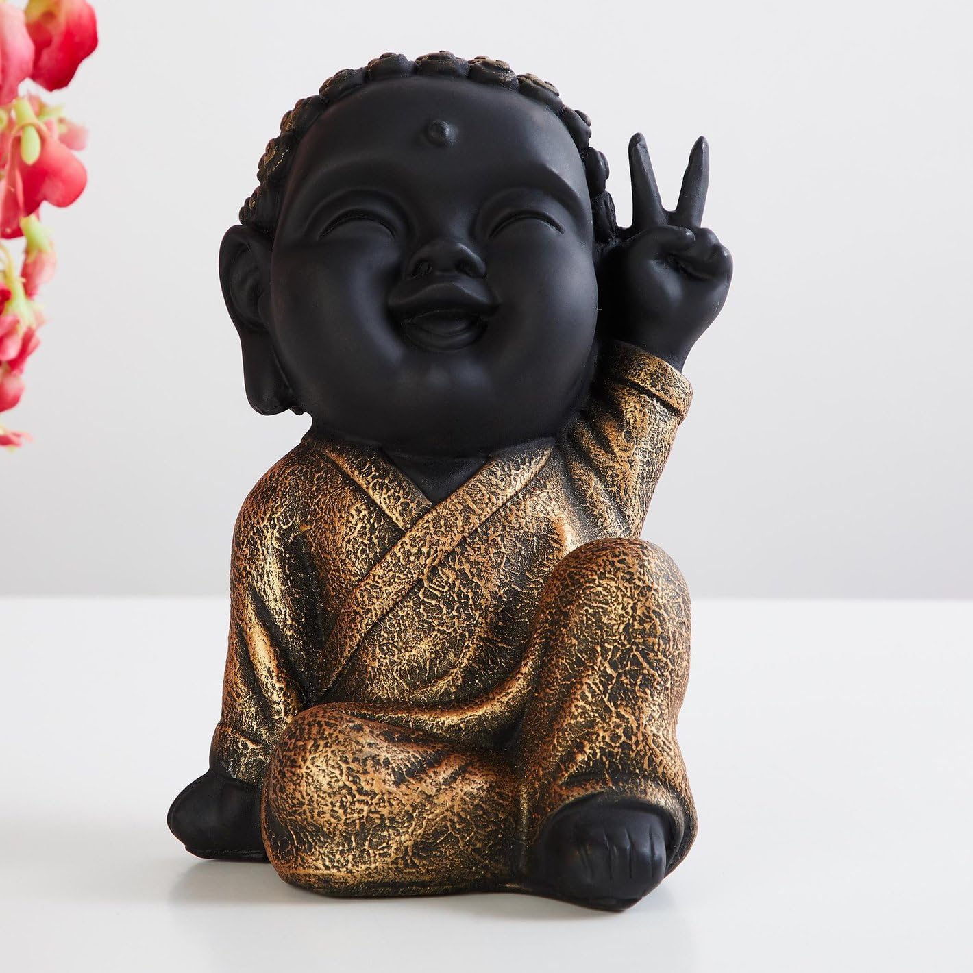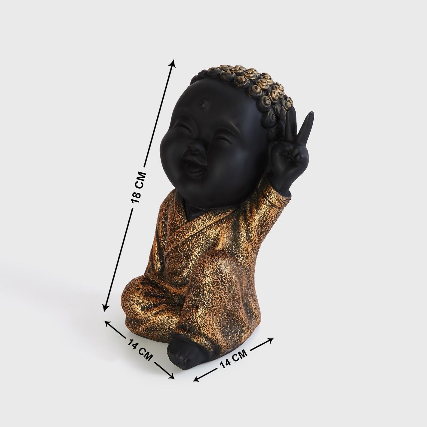Opulent and one-of-a-kind, this Buddha statue is exquisitely crafted from premium resin. A lovely gift for holidays, birthdays or spiritual moments, complementing your living space, study or prayer area. Showcase your style with this luxurious good vibes. Emblem of Happiness and Peace: This delightful Happy Buddha, depicting a joyful expression and the "peace" sign, embodies excellent fortune, contentment, and tranquility. Versatile Home Decoration: Perfect Gifting Solution: A thoughtful and meaningful gift for housewarmings, birthdays, anniversaries, festivals, or for anyone seeking peace and positivity in their lives. Luxury Resin Material: Expertly crafted from durable and long- resin, ensuring the statue retains its beauty for years to come. Graceful Finish: Features a sophisticated black body with detailed golden detailing on the robe, creating a visually striking contrast. Compact and Lightweight: Easy to place and move, making it a flexible decoration item. Suitable for display on shelves, mantels, or desks.