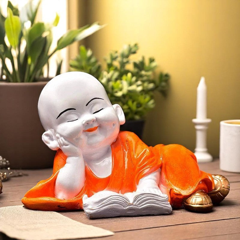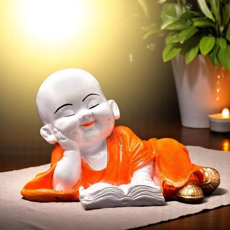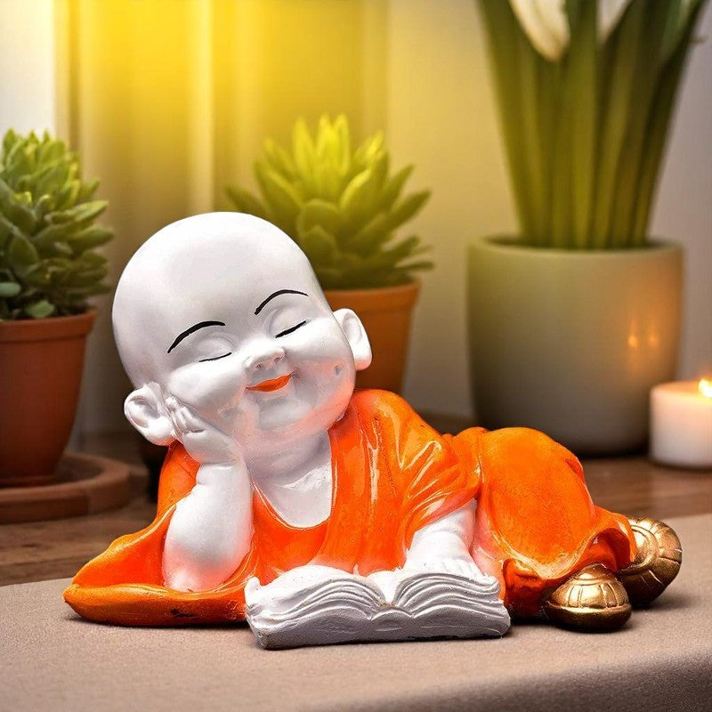 Luxurious and sacred, this Buddha statue is expertly crafted from resin-crafted. A thoughtful gift for any occasion, accentuating your living room, office or prayer space. Showcase your style with this luxurious handmade ployresin. Spread Joy and Serenity: This delightful little monk Buddha figure with its serene, smiling face brings an instant sense of peace and happiness to any space. Vibrant and Playful: Dressed in charming orange robes, this figure adds a touch of color and whimsy to your home home decor. Reflective Pose: Depicting a serene, reclining posture with a book, it subtly inspires calm and the pursuit of knowledge. Luxury Resin Craftsmanship: Meticulously crafted from high- resin, ensuring durability and a fine finish for long- enjoyment. Versatile Home Decor Accent: Heartwarming Gift Idea: A perfect present for housewarmings, birthdays, spiritual occasions, or for anyone who appreciates distinctive and uplifting home decor. Emblem of Peace and Wisdom: Represents innocence, wisdom, and inner calm, making it a meaningful addition to your spiritual home decor collection. Compact and Charming: Perfectly sized to fit on shelves, mantels, side tables, or office desks without overcrowding. Suitable for display on shelves, mantels, or desks.