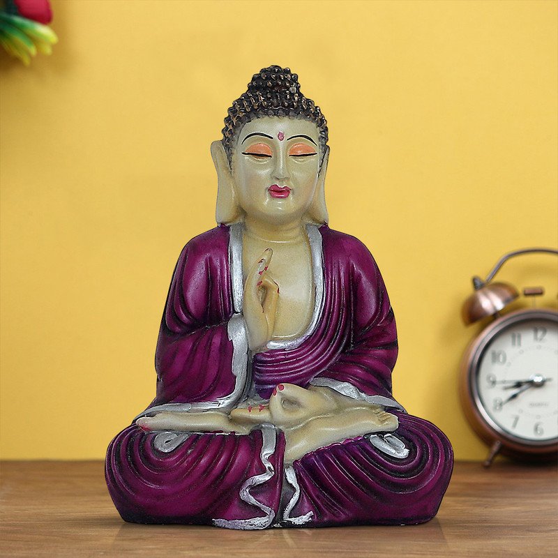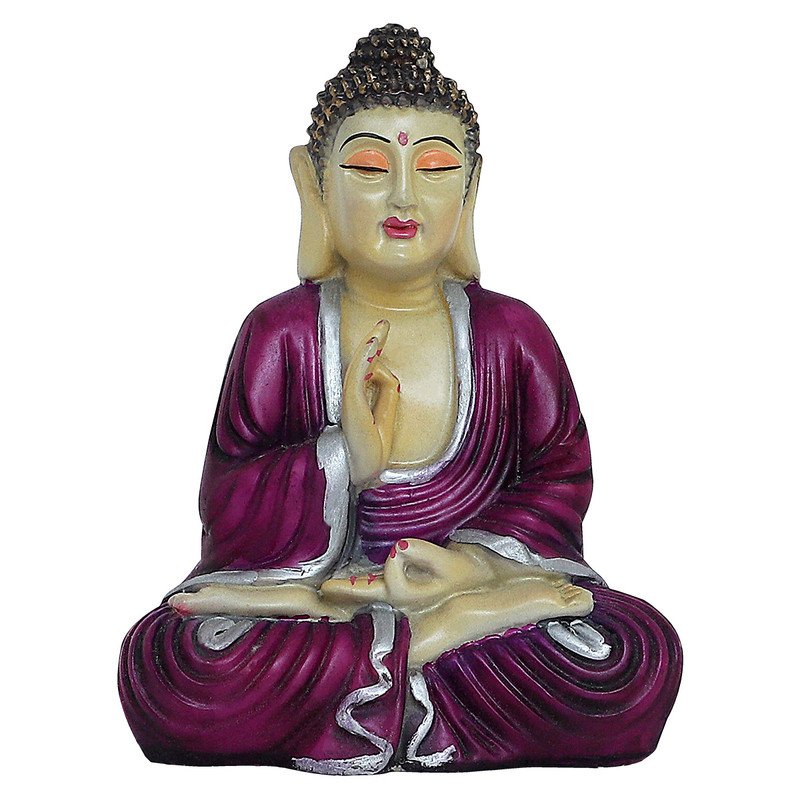 Lavish and spiritual, this Buddha statue is exquisitely crafted from premium resin. A lovely gift for holidays, birthdays or spiritual moments, complementing your living space, study or prayer area. Showcase your style with this luxurious handmade ployresin. Exquisite Meditative Lord Buddha: This captivating resin statue portrays Lord Buddha in a classic meditative posture, with eyes gently closed and a serene expression, radiating deep peace, wisdom, and spiritual calm. Vibrant Purple/ Robe with Silver Accents: Features a light- body exquisitely contrasted by a rich and eye- purple/ robe, detailed with subtle silver accents, creating a visually harmonious and inspiring presence. Emblem of Enlightenment and Serenity: The Buddha' serene countenance and meditative posture inspire mindfulness, introspection, and foster an atmosphere of spiritual harmony and inner peace in any environment. Luxury Quality Polyresin Craftsmanship: Made from durable, high- polyresin, ensuring the detailed details and graceful finish are perfectly preserved for lasting beauty and durability. Versatile Home and Office Decor: Meaningful Spiritual Gift: An exceptionally thoughtful and inspiring gift for housewarmings, religious ceremonies, spiritual occasions, or for anyone who appreciates sacred art and tranquil decor. Cultivates Positive Energy: Allow the profound presence of this Buddha figure to fill your surroundings with balance, tranquility, and positive vibrations, fostering a serene atmosphere. A Touch of Ancient Wisdom: Brings the timeless beauty and spiritual depth of classic Eastern artistry directly into your contemporary space. Suitable for display on shelves, mantels, or desks.