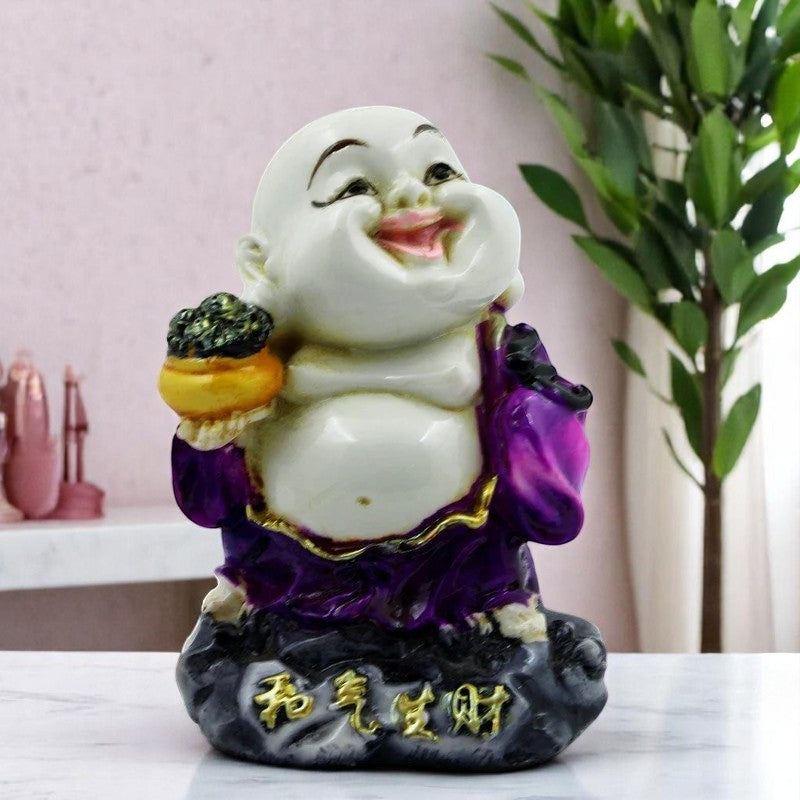 Luxurious and sacred, this Buddha statue is expertly crafted from premium materials. A meaningful gift for diwali or special occasions, enhancing your office desk, bookshelf or meditation area. Showcase your style with this luxurious handmade ployresin. Bring an abundance of joy, wealth, and excellent fortune into your life with this delightful Laughing Buddha figure! This vibrant statue depicts the popular emblem of prosperity with a wide, infectious grin, holding a bountiful pot of gold in one hand, signifying endless riches and blessings. Dressed in striking purple robes, he radiates positivity and cheerfulness. The base of the figure features graceful Chinese characters, typically translating to "Harmony Brings Wealth" or "Peace Generates Riches," further enhancing its fortunate symbolism. It' a perfect gift for housewarmings, business openings, festivals, or for anyone you wish to bless with happiness and financial well- Let this cheerful Buddha fill your space with positive energy and endless opportunities! Suitable for display on shelves, mantels, or desks.