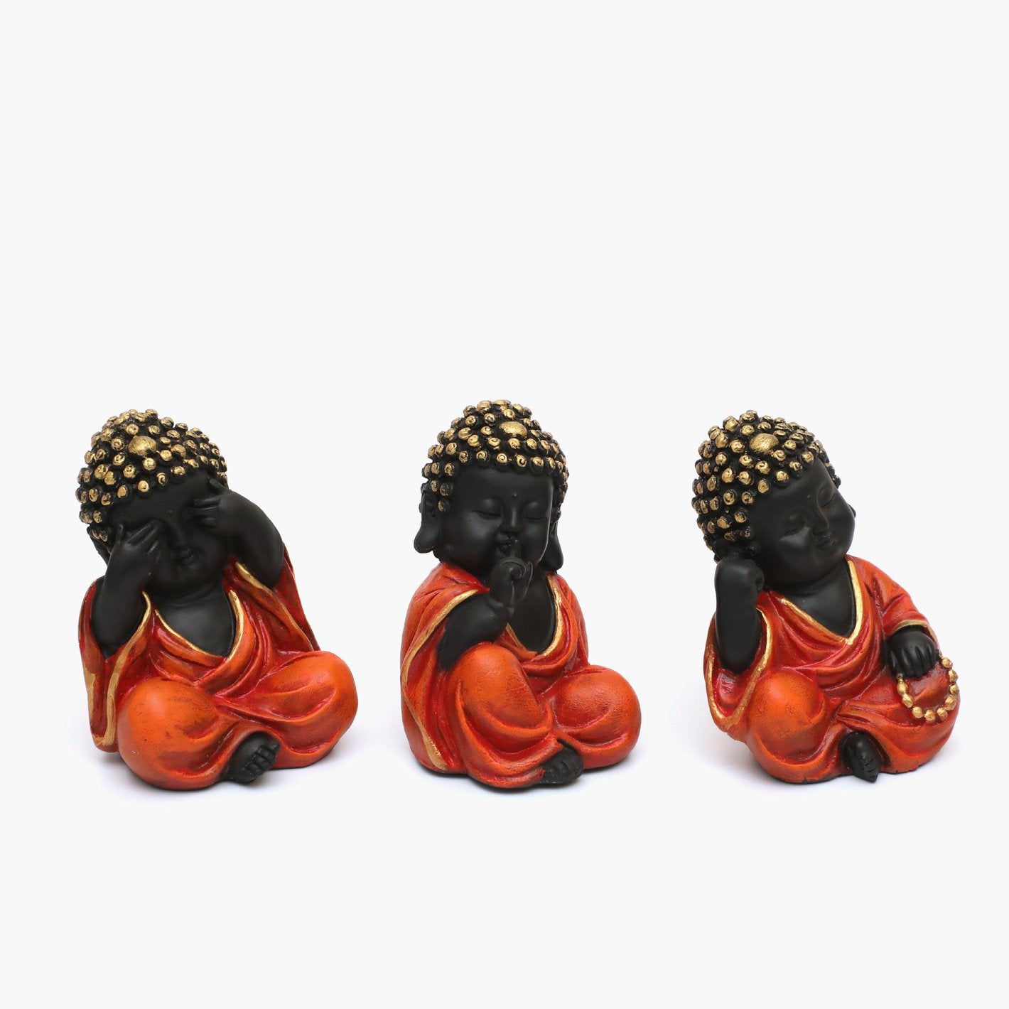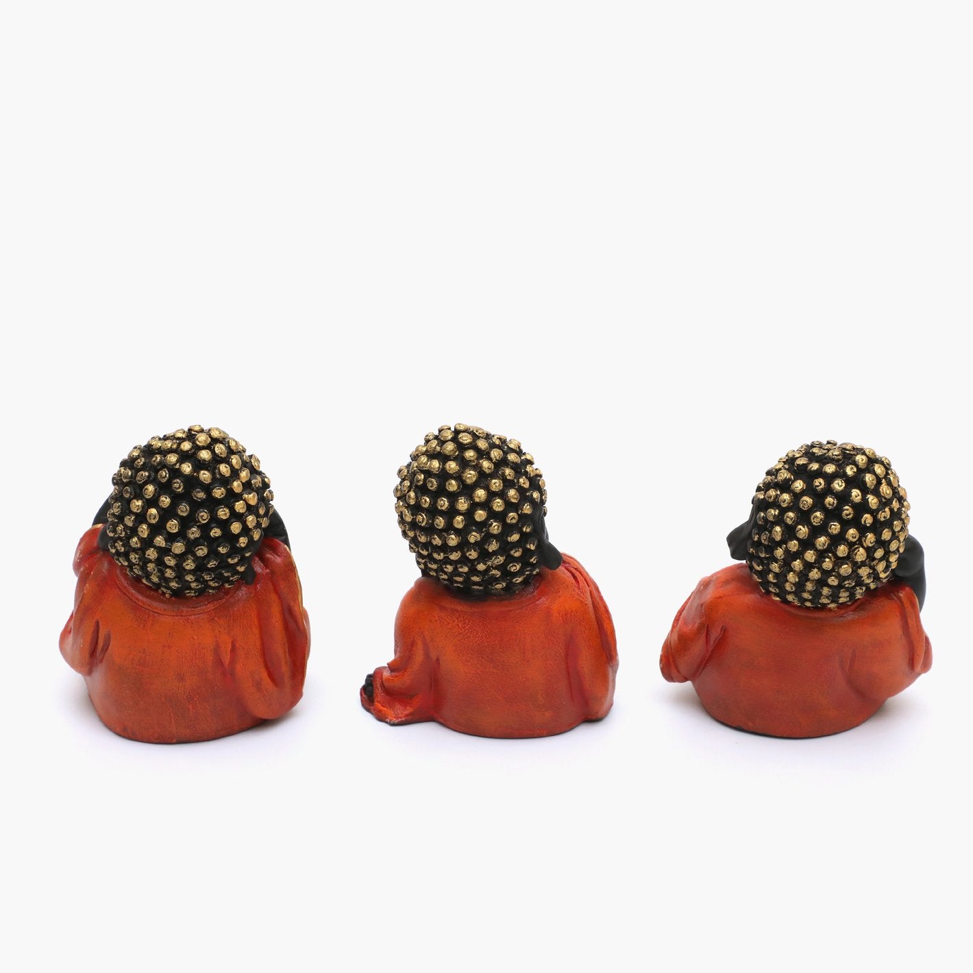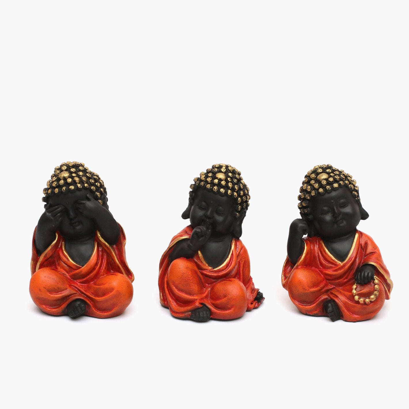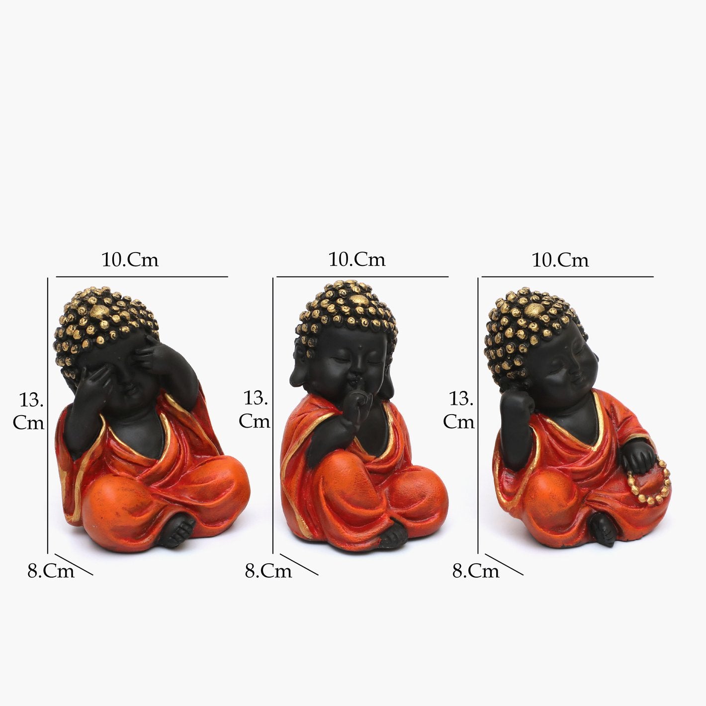 Premium and elegant, this Buddha statue is expertly crafted from premium materials. A meaningful gift for diwali or special occasions, enhancing your office desk, bookshelf or meditation area. Embody Ancient Wisdom: This charming set of three monk figurines represents the timeless principle of "See No Evil, Hear No Evil, Speak No Evil," guiding towards peace and mindfulness. Perfect Home and Office Decor: Thoughtful and Meaningful Gift: An excellent present for spiritual seekers, housewarmings, birthdays, or anyone looking to infuse their space with positive energy and wisdom. Vibrant Design: Crafted with striking red robes and detailed details, these figurines add a pop of color and artistic flair to any decor style. Emblem of Tranquility: Each pose promotes a powerful message of inner peace, self- and the avoidance of negativity, inspiring a harmonious environment. Compact and Versatile: Their small size makes them easy to place in various spots, enhancing your decor without overwhelming the space. Spiritual Reminder: Serve as a daily reminder to choose positivity and discernment in a world full of distractions, fostering a calm mind. Enhances the ambiance of living rooms, bedrooms, and offices.
