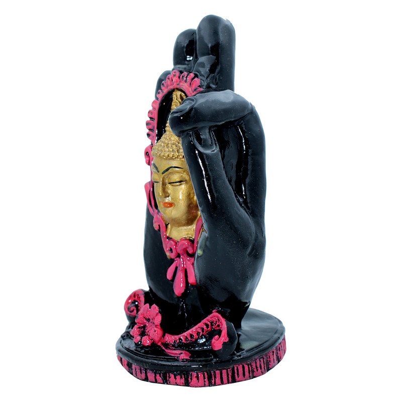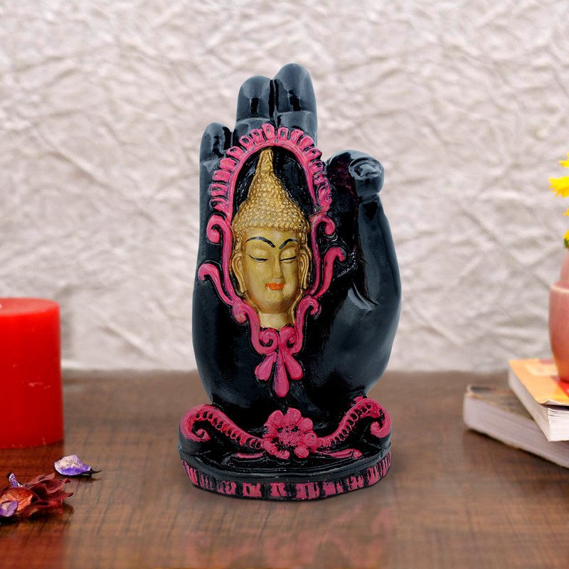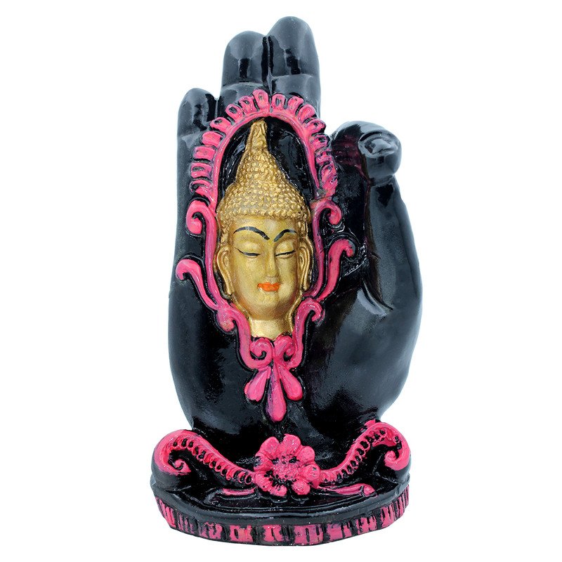 High-quality and divine, this Buddha statue is exquisitely crafted from premium resin. An ideal gift for housewarmings and festivals, suiting any living room, meditation area or office. Symbolic Hand Gesture (Mudra): This distinctive resin figure exquisitely depicts a Buddha head set within an upright hand, likely representing the Abhaya Mudra, a gesture of fearlessness, protection, and blessing, inviting peace and security into your space. Enclosed Buddha Head: A serene golden Buddha head is intricately framed in vibrant pink within the palm, symbolizing enlightened consciousness and inner tranquility, nestled safely within universal protection. Striking Color Palette: Features a sophisticated black finish for the hand, elegantly contrasted by rich pink decorative accents and the luminous golden Buddha head, creating a visually compelling and artistic piece. Luxury Quality Resin Craftsmanship: Meticulously sculpted from durable, high- polyresin, ensuring crisp details, a smooth finish, and lasting vibrant colours for enduring beauty. Detailed Decorative Details: The base and surrounding frame of the Buddha head are adorned with delicate, classic- patterns, adding to the figure' artistic value and charm. Versatile Spiritual and Contemporary Decor: Meaningful and Distinctive Gift: An exceptionally thoughtful and spiritually uplifting present for housewarmings, birthdays, graduations, or for anyone seeking to add wisdom, protection, and distinctive artistry to their environment. Distinctive Design Element: Its distinctive form, combining the hand and Buddha head, makes it a truly distinctive piece that stands out in any collection.