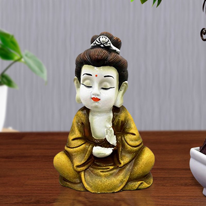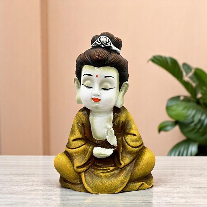 Premium and sacred, this Buddha statue is expertly crafted from resin-crafted. A meaningful gift for diwali or special occasions, enhancing your office desk, bookshelf or meditation area. Small Serene Yellow Meditative Buddha: This charming resin figure features a small Buddha in a deep state of mindfulness, seated in the lotus position with a calming yellow robe and serene white skin. Emblem of Peace and Inner Calm: The meditative Buddha is a powerful emblem of inner peace, tranquility, and spiritual harmony. Detailed Yellow Design: The figure showcases detailed carvings on the robe. Crafted in Durable Resin: Made from high- resin, ensuring lasting beauty and detailed details. Spiritual and Thoughtful Small Gift: A meaningful and calming gift for those seeking peace, mindfulness, or a touch of spiritual charm. Serene Meditative Pose: The Buddha is seated in the classic lotus position, promoting relaxation and inner balance. Calming Yellow Hues: The yellow colour adds a touch of warmth and serenity.