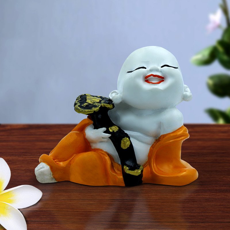 High-quality and divine, this Buddha statue is exquisitely crafted from premium resin. A lovely gift for holidays, birthdays or spiritual moments, complementing your living space, study or prayer area. Joyful White and Orange Little Monk: This charming resin figure depicts a small little Buddha monk with a wide smile, holding a decorative black and gold staff or vase. Adorable and Whimsical Design: The monk' happy expression and the distinctive accessory add a touch of playfulness and charm to any space. Emblem of Joy and Blessings: The laughing little Buddha represents happiness, contentment, and excellent fortune. Crafted in Durable Resin: Made from high- resin with a smooth finish and vibrant, hand- details. Thoughtful and Distinctive Gift: A heart warming and delightful gift for housewarmings, birthdays, or anyone who appreciates adorable and symbolic decor. Smiling and Holding Accessory: The monk' joyful face and the interesting staff or vase make it a distinctive piece.
