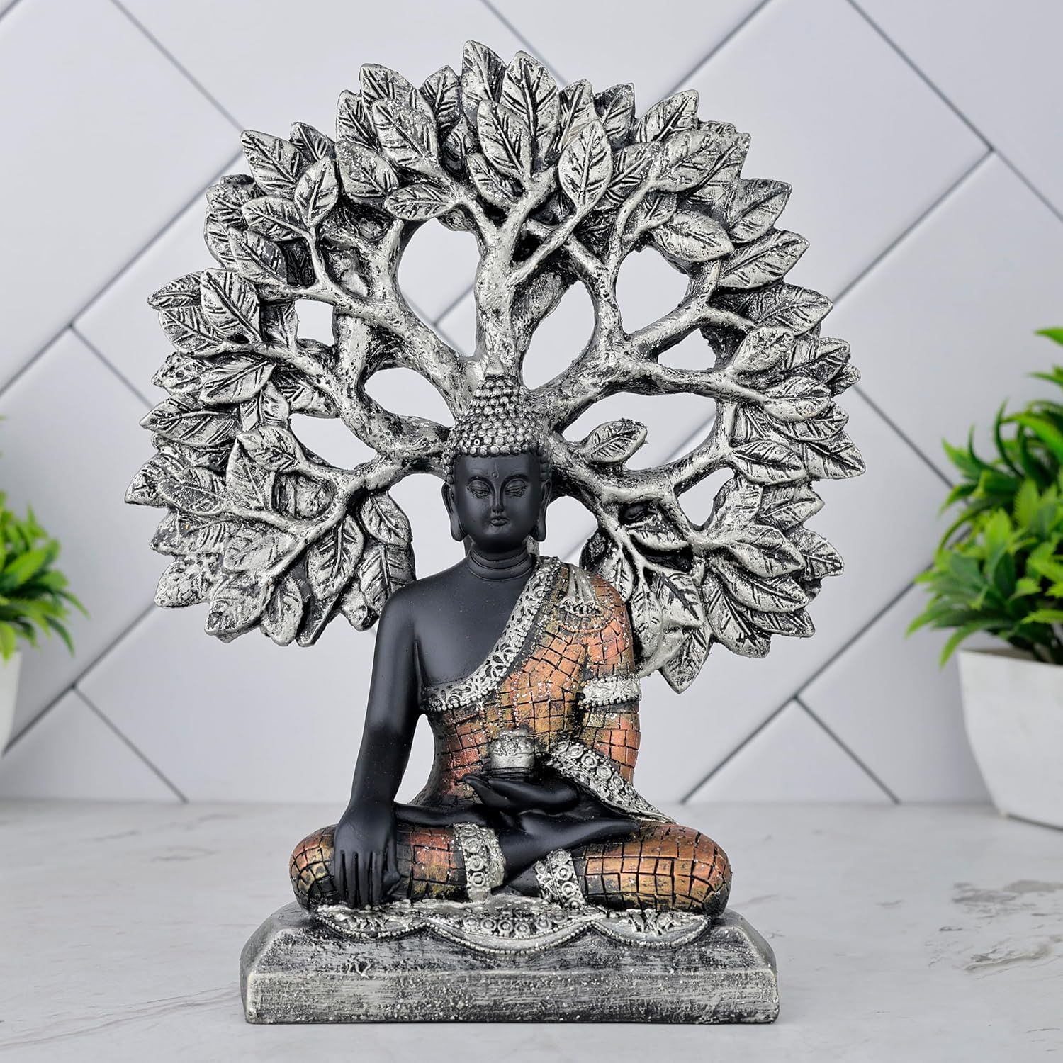 Premium and contemporary, this Buddha statue is skillfully crafted from durable resin. A heartwarming gift for family and friends, brightening up any nook, workspace or spiritual corner. Symbolic Buddha Under Bodhi Tree: This exquisite resin statue captures the iconic moment of Lord Buddha' enlightenment under the sacred Bodhi tree, radiating profound peace and spiritual awakening. Distinctive Black and Bronze Finish: Showcases a striking black body with detailed bronze- robes and a contrasting silver/ Bodhi tree, creating a visually compelling and ancient aesthetic. Detailed Details and Superior Craftsmanship: Features finely sculpted details on both the meditative Buddha and the expansive, symbolic tree canopy, highlighting meticulous artistry. Quality Resin Material: Made from durable, high- resin, ensuring the detailed details are preserved and the figure remains a lasting piece of decor. Versatile Home and Office Decor: Perfect for enhancing the ambiance of your living room, mindfulness space, yoga studio, office desk, or as a sacred focal point. Meaningful Spiritual Gift: An ideal and thoughtful gift for housewarmings, weddings, spiritual occasions, or for anyone seeking peace, mindfulness, or enlightenment.