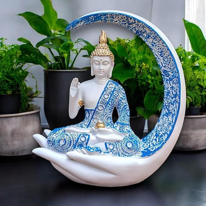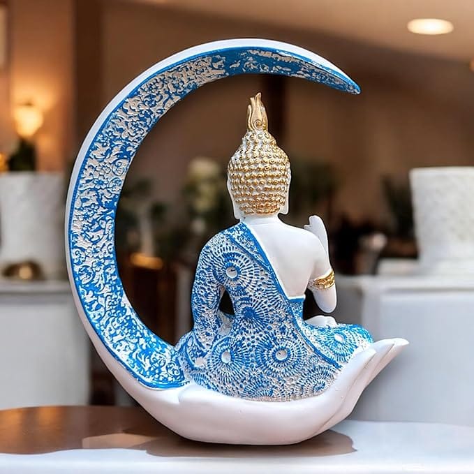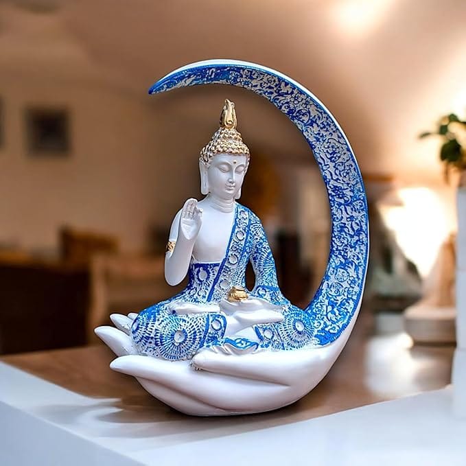 Stylish Blue Cresent Moon Buddha Meditating Resin-Crafted Figure – Premium Home Decor