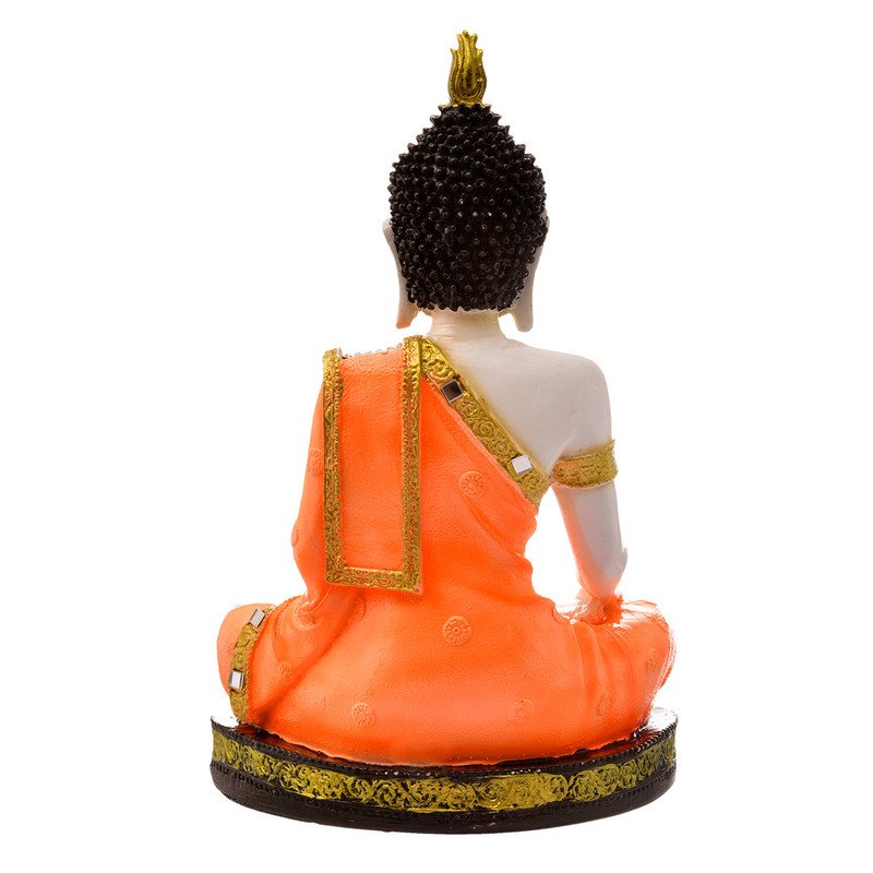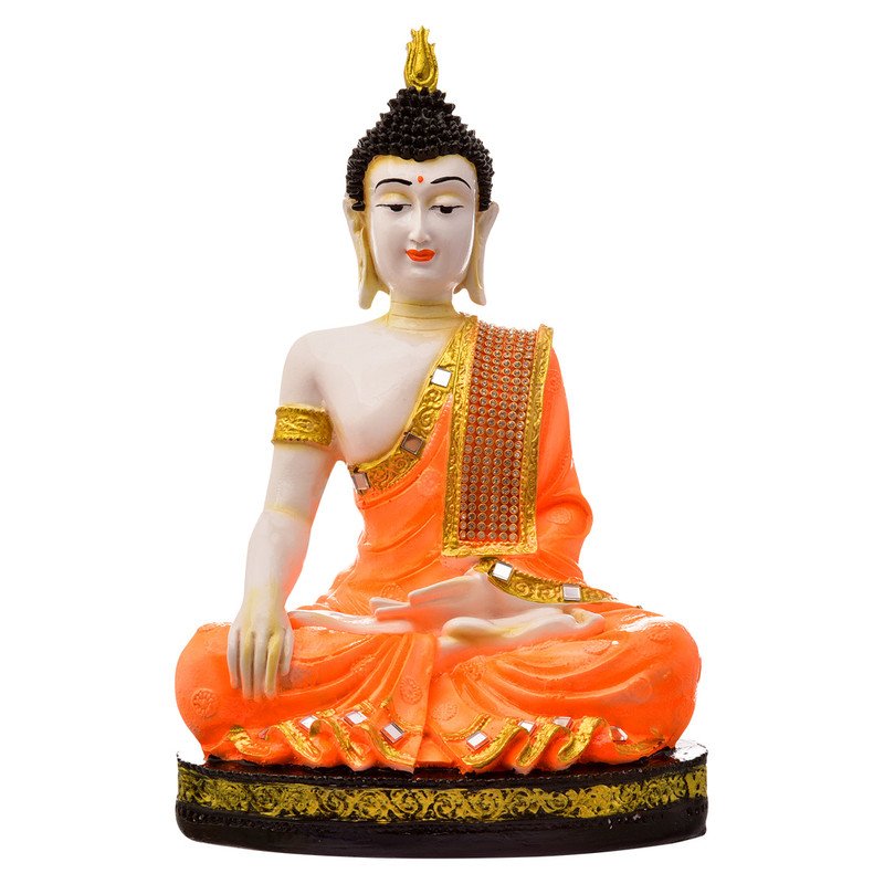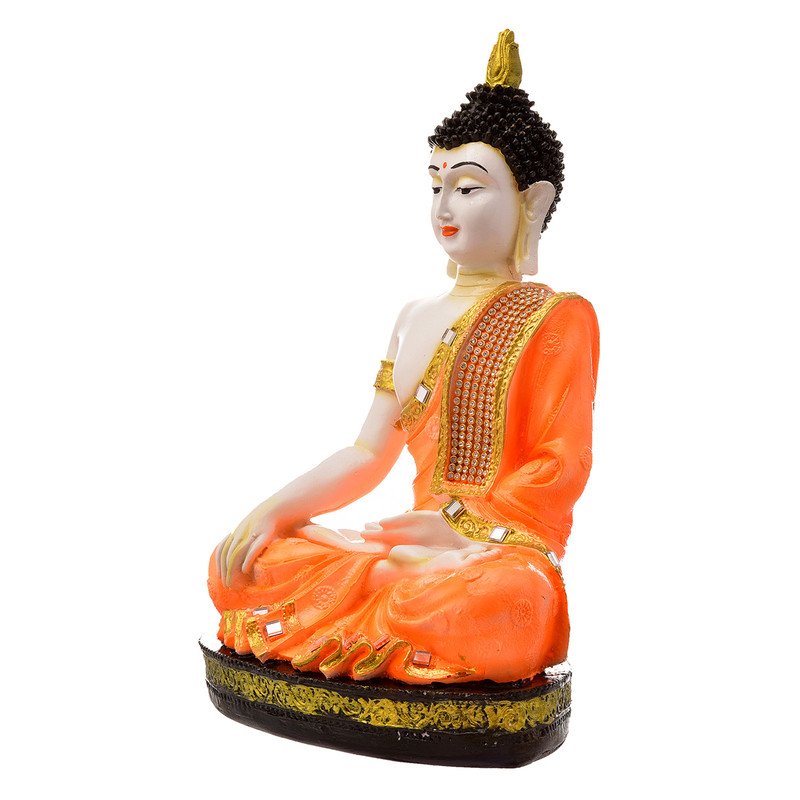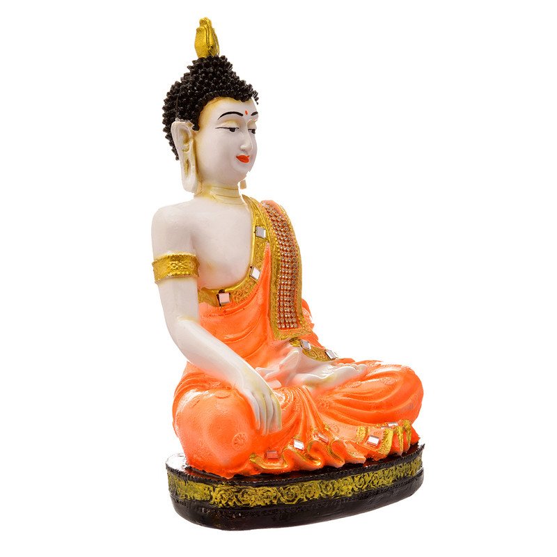 Stylish Handmade Ployresin Lord Buddha Meditating Idol Sitting On Golden Colour Table Display Piece Home Decor/Office Home Decor/Spiritual Gift, Orange Colour – Luxurious Accent