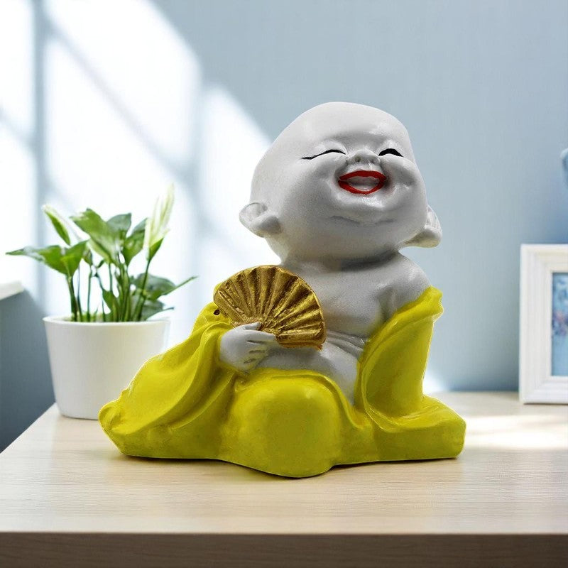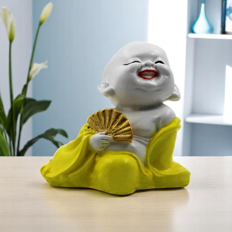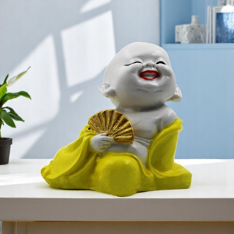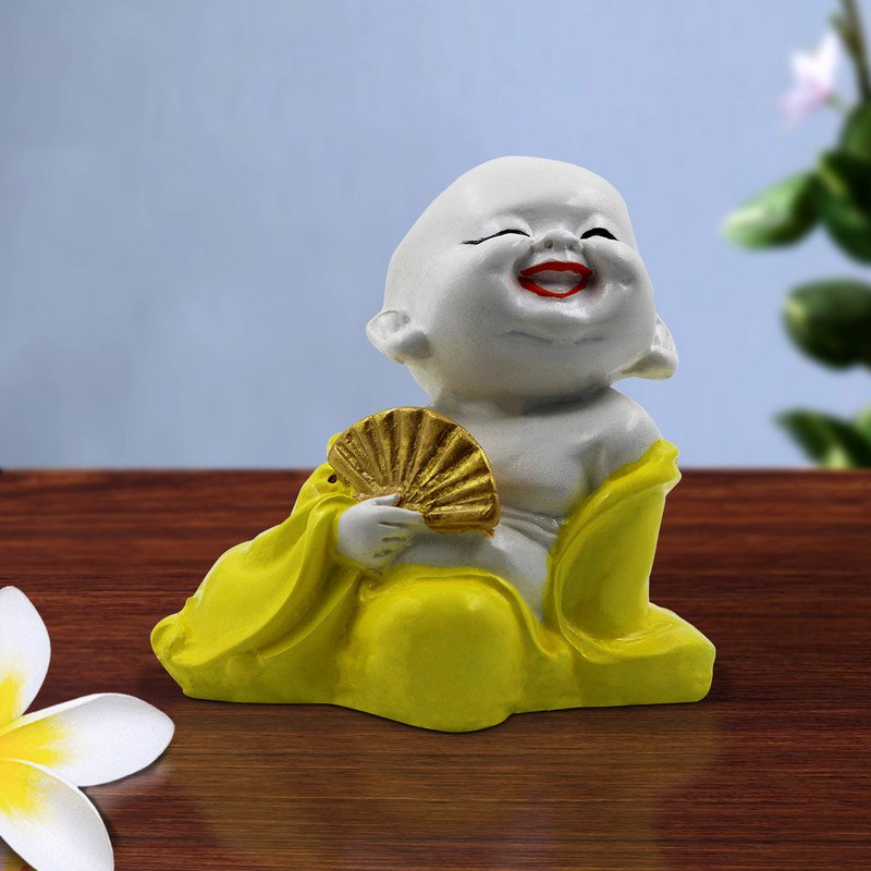 Stylish Handmade Ployresin Lord Buddha Sitting Laughing Figurine Display Piece Home Decor/Office Home Decor/Spiritual Gift, White And Yellow – Home Decor Accent
