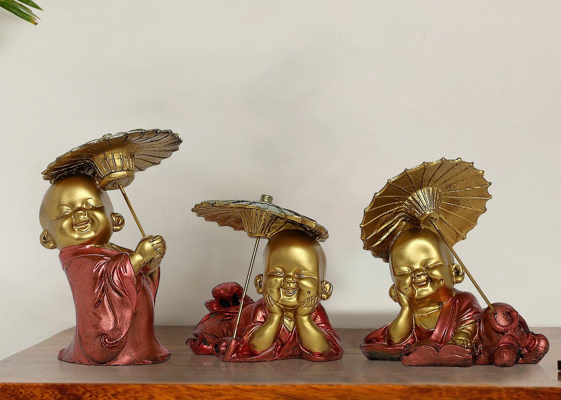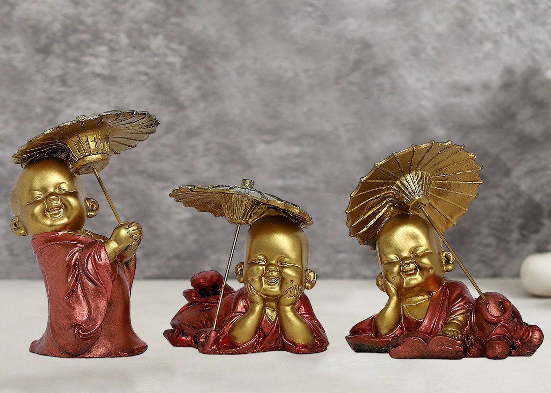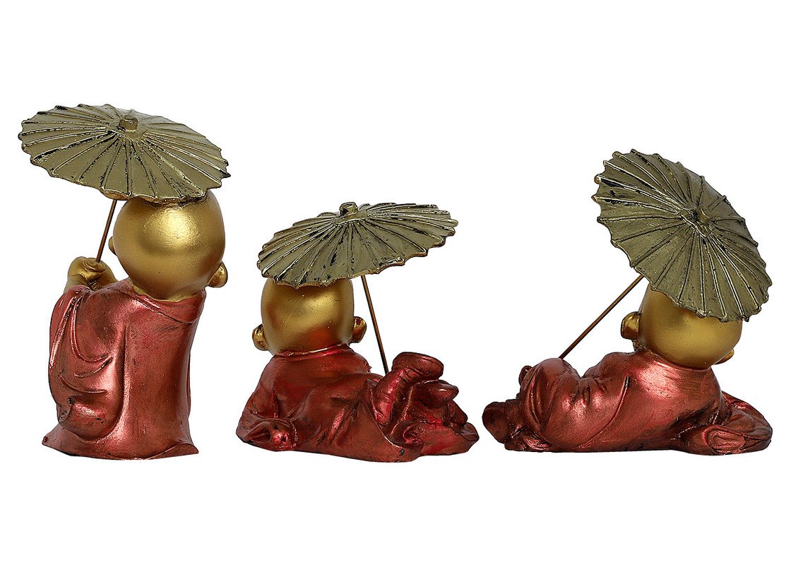 Everlasting and spiritual, this Buddha statue is exquisitely crafted from premium resin. A lovely gift for holidays, birthdays or spiritual moments, complementing your living space, study or prayer area. Set of Three Laughing Little Monks with Umbrellas: This delightful set includes three charming resin figurines of little Buddha monks with joyful expressions, each uniquely posed with a decorative golden umbrella. Adorable and Whimsical Design: These adorable little monks with their infectious laughter and playful umbrellas add a touch of light heartedness and charm to any space. Emblem of Joy and Protection: The Laughing Buddha represents happiness, while the umbrella can symbolize protection and shelter. Crafted in Durable Resin: Made from high- resin with vibrant, hand- details and golden umbrella accents. Thoughtful and Cheerful Gift Set: A heart warming and delightful gift for housewarmings, little showers, or anyone who appreciates adorable and whimsical decoration. Distinctive Poses with Umbrellas: Each monk has a different playful pose interacting with their golden umbrella. Bring charm and elegance to your décor.