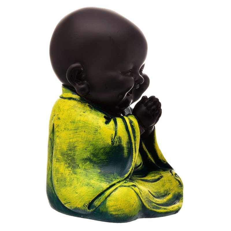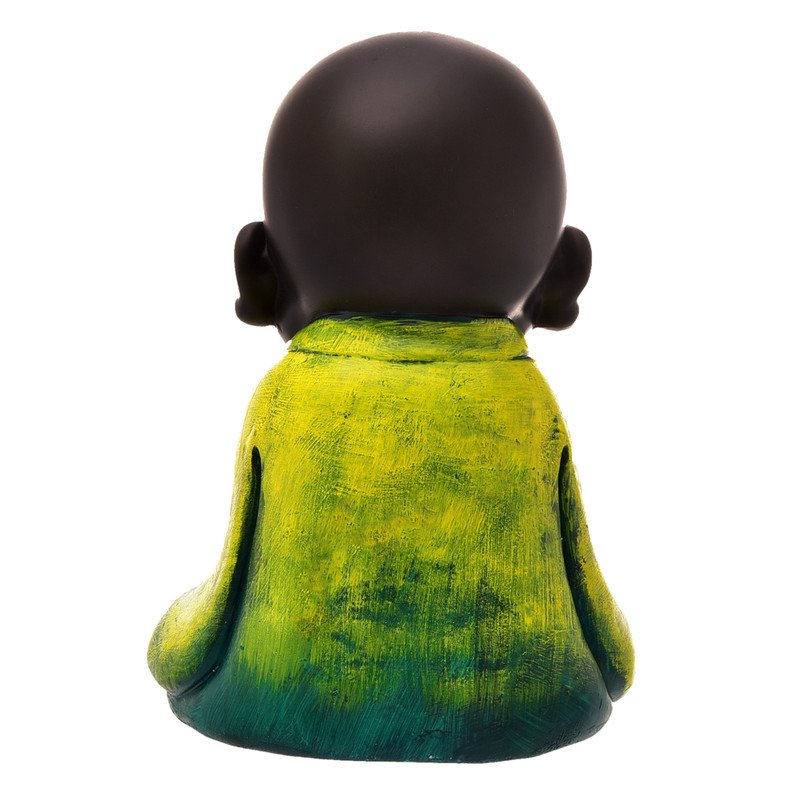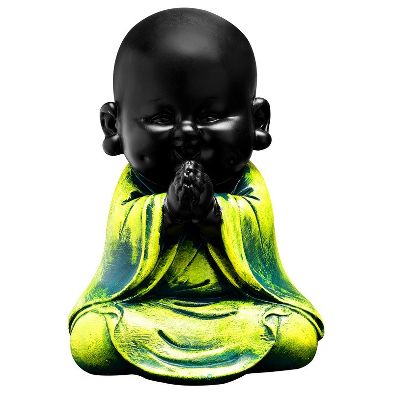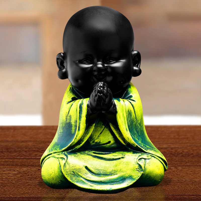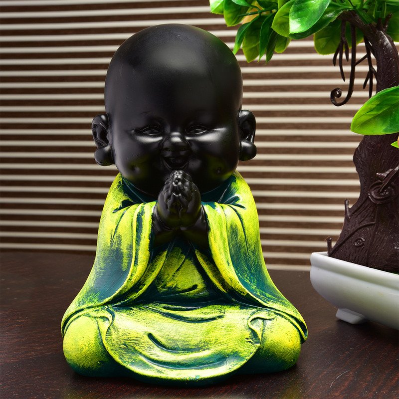One-of-a-kind and spiritual, this Buddha statue is beautifully made from handcrafted resin. Perfect for gifting on birthdays, anniversaries or festivals, fitting effortlessly into your pooja room, living area or workspace. Serene Praying Little Buddha Monk: This delightful resin-crafted figurine depicts a young Lord Buddha or monk in a serene prayer (Namaste) pose with eyes closed, radiating innocence and profound calm. Striking Black and Green Design: Features a smooth black body contrasted by a vibrant green and yellow textured robe, creating a visually harmonious and striking presence. Emblem of Peace and Mindfulness: The tranquil expression and prayerful posture inspire introspection, encouraging moments of quiet reflection and fostering a sense of inner peace. High-Quality Durable Resin-Crafted Craftsmanship: Made from durable, high- polyresin, ensuring the detailed details and vibrant colors are perfectly preserved for lasting enjoyment and durability. warming Spiritual Gift: An exceptionally thoughtful and inspiring gift for housewarmings, birthdays, festivals, or for anyone who appreciates symbols of peace, spirituality, and wisdom. Your Daily Dose of Calm: A gentle reminder to pause, breathe, and find a moment of peace amidst your busy day. Instantly Elevates Your Ambiance: Transform any room into a more harmonious and inviting sanctuary with this refined addition. Designed to complement modern and traditional interiors.