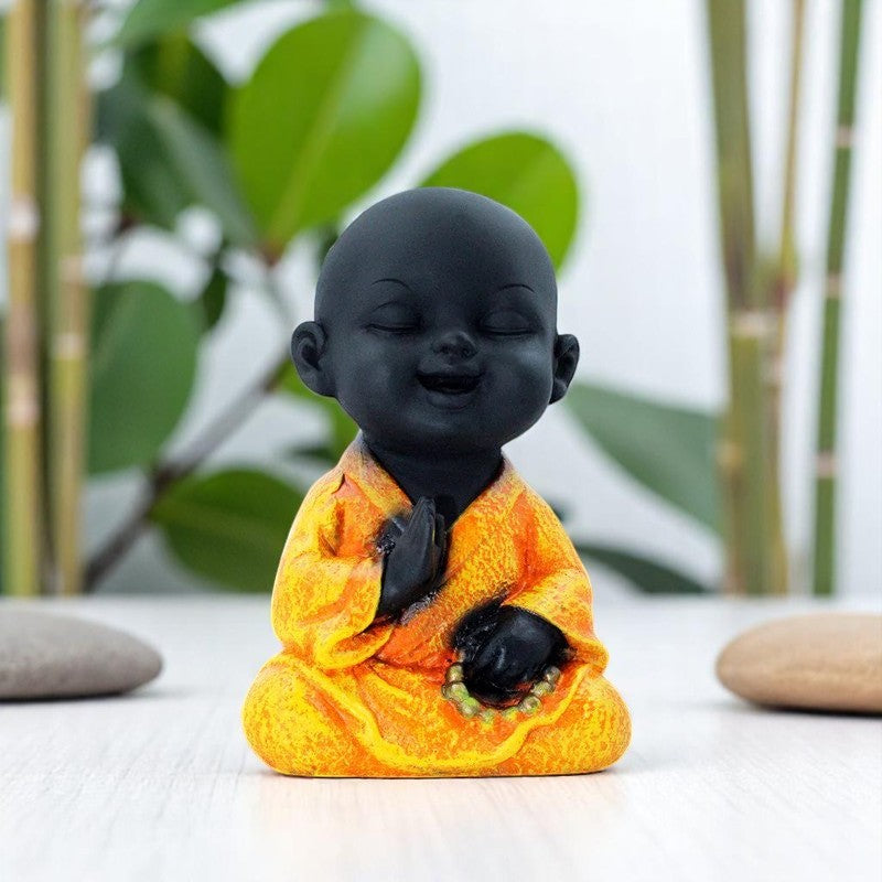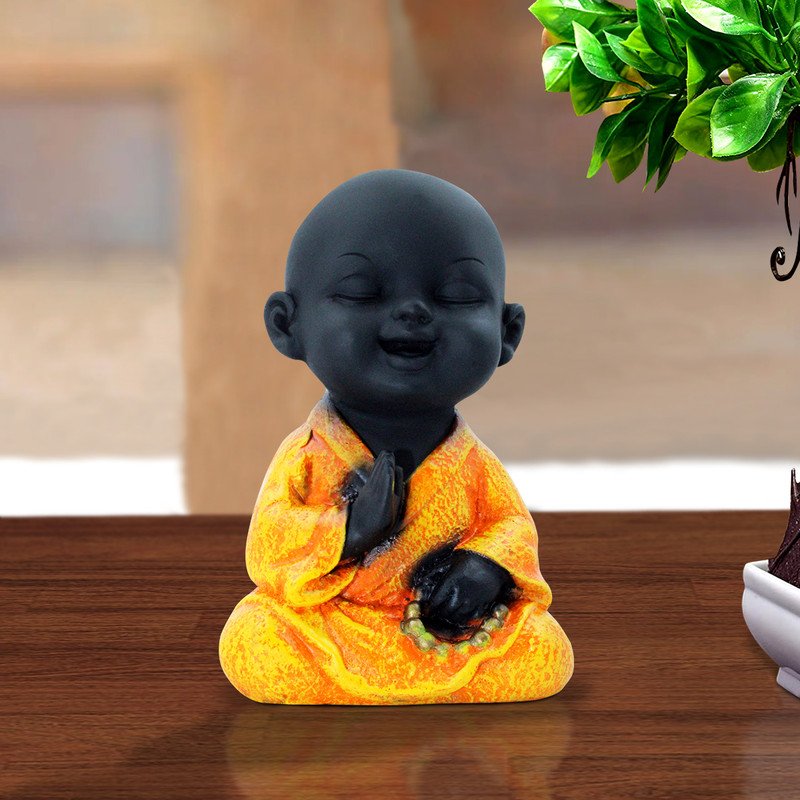 Unique and sacred, this Buddha statue is meticulously crafted from resin-made. Perfect for festive gifting and celebrations, bringing beauty to your home temple, office desk or study. Symbolism and Meaning: Highlight the symbolism of a meditative monk - peace, tranquility, mindfulness, inner harmony, spiritual awakening. Mention its association with Buddhist practices. Aesthetic Appeal and Design: Describe the visual contrast between the dark head and the vibrant orange robe, emphasizing the serene expression and the meditative pose (e. lotus position, hands in mudra). Mention the presence of prayer beads (mala) and their significance. Material and Craftsmanship: Briefly mention the likely material (resin-crafted, ceramic, etc.) and the durable of the craftsmanship that brings out the serene details. Placement and Versatility: Suggest suitable locations for display such as meditation corners, yoga studios, living rooms, bedrooms, or office desks to create a calming atmosphere. Gift Potential: Position it as a thoughtful and meaningful gift for those interested in spirituality, meditation, mindfulness, or seeking a sense of calm and peace. Emotional Connection and Benefits: Focus on the feelings it can inspire: tranquility, focus, relaxation, and its role as a visual reminder to practice mindfulness in daily life. Designed to complement modern and traditional interiors.