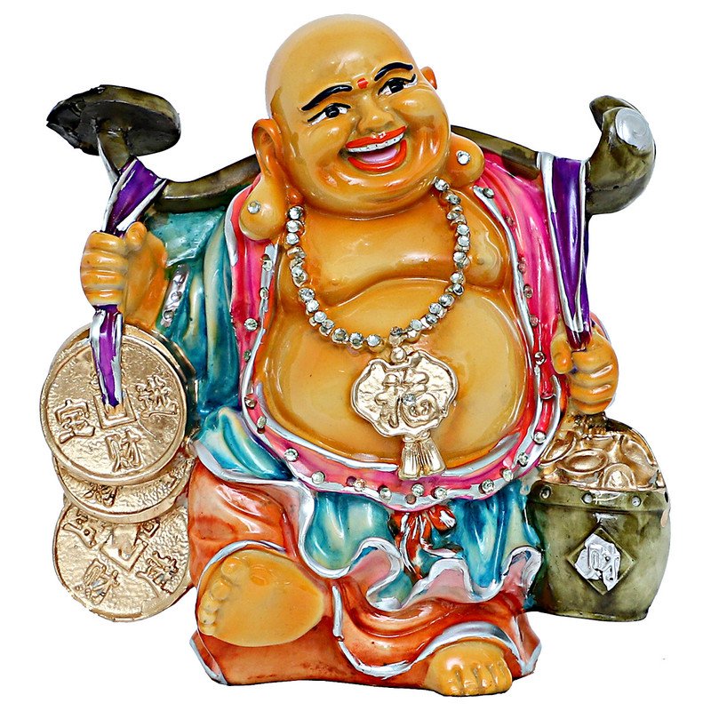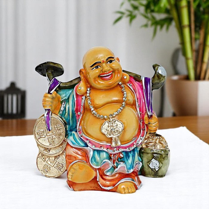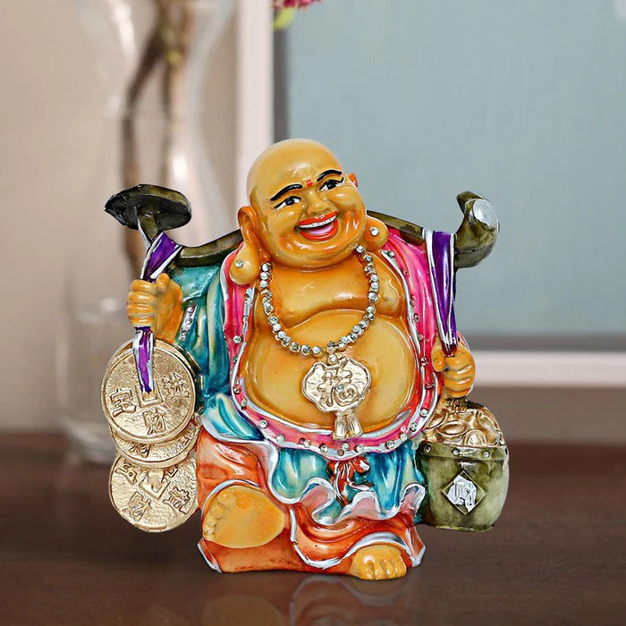Distinctive and divine, this Buddha statue is beautifully made from handcrafted resin. An excellent choice for spiritual and decorative gifting, gracefully decorating your table, shelf or altar. Embodiment of Joy: This cheerful Laughing Buddha with his radiant smile brings an immediate sense of happiness and positivity to any space. Vibrant Colours: Adorned in a striking palette of pink, blue, orange, and green, making it a lively and eye- decoration piece. Symbols of Prosperity: Holding a large golden ingot, coins, and a staff, symbolizing wealth, excellent fortune, and success. High- Resin-Crafted: Expertly crafted from durable resin-crafted with detailed details and a polished finish, ensuring long- beauty. Fortunate Gift: An ideal and meaningful present for housewarmings, business openings, festivals, or for anyone wishing for prosperity and well- Positive Energy Decoration: Enhances the positive flow of energy (Feng Shui) in your living room, office, entryway, or business premises. Inspires Contentment: Believed to attract excellent fortune and promote a sense of contentment and abundance in daily life. Designed to complement modern and traditional interiors.