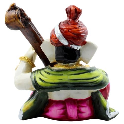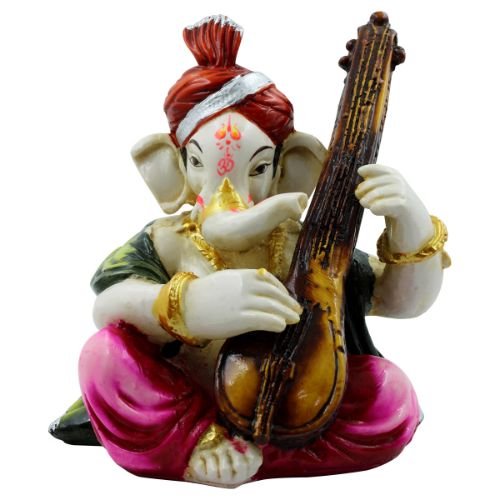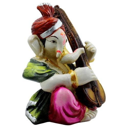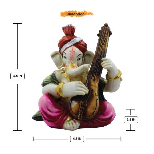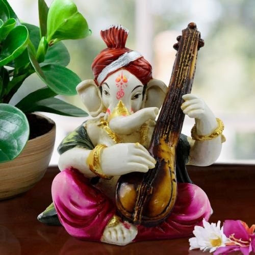 Creative, this Ganesha idol is exquisitely crafted from premium materials. A lovely gift for holidays, birthdays or spiritual moments, complementing your living space, study or prayer area. Our beautiful Ganesh idol adds spiritual grace to your home décor and makes an ideal Diwali or housewarming gift. Musical Ganesha Depiction: This figurine gracefully captures Lord Ganesha in a seated pose, deeply engrossed in playing a classic Indian string instrument, symbolizing harmony, artistic expression, and the rhythm of life. Vibrant Classic Attire: Adorned with a striking red turban with silver accents and vibrant pink dhoti, contrasted with a serene white body, the figurine showcases a visually appealing blend of classic colours that enhance its divine presence. Emblem of Wisdom and Obstacle Removal: As the Vighnaharta, the remover of obstacles, and the deity of wisdom and intellect, this Ganesha figurine is believed to usher in excellent fortune, success, and positive energy into your space. Versatile Decoration Accent: Perfect for your puja room, living room, office desk, or any quiet corner, this figurine serves as a lovely reminder of spiritual calm and cultural richness. Thoughtful and One-Of-A-Kind Gift: An ideal present for housewarmings, Indian festivals like Ganesh Chaturthi and Diwali, or for music lovers and art enthusiasts in Mumbai, conveying blessings and warm wishes. Detailed Detailing: The figurine features meticulous craftsmanship, visible in the delicate rendering of Ganesha' features, the folds of his attire, and the realistic portrayal of the musical instrument, highlighting superior artistry. Durable and Easy Care: Crafted from high- materials, this Ganesha figurine is built for lasting beauty and can be easily maintained by wiping it with a soft, dry cloth, ensuring its radiant appearance remains pristine. An elegant addition to your home or workspace. Perfect for devotees looking for orange colour ganesh murti, orange colour ganpati and ganesha with laptop, this Ganesh statue brings blessings and elegance to your space.