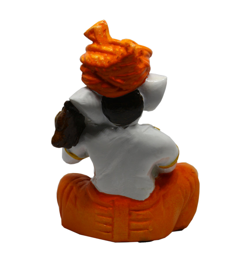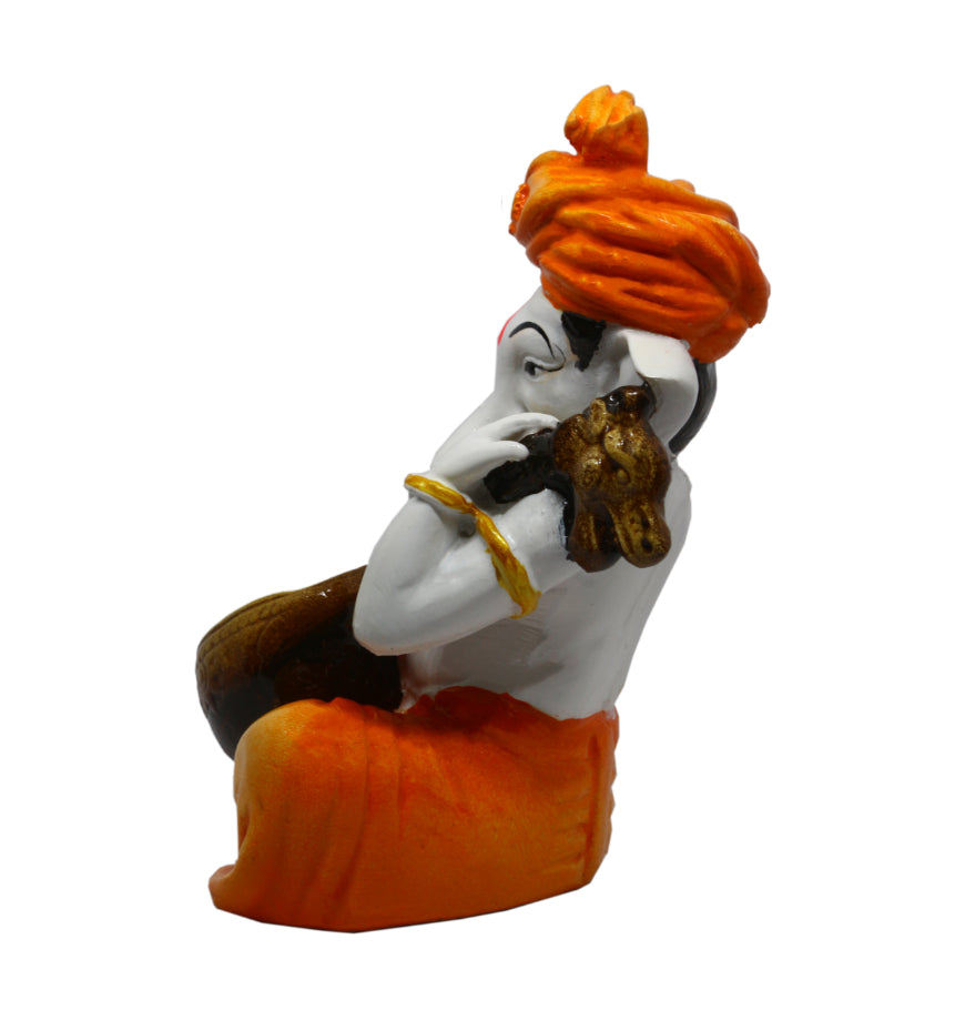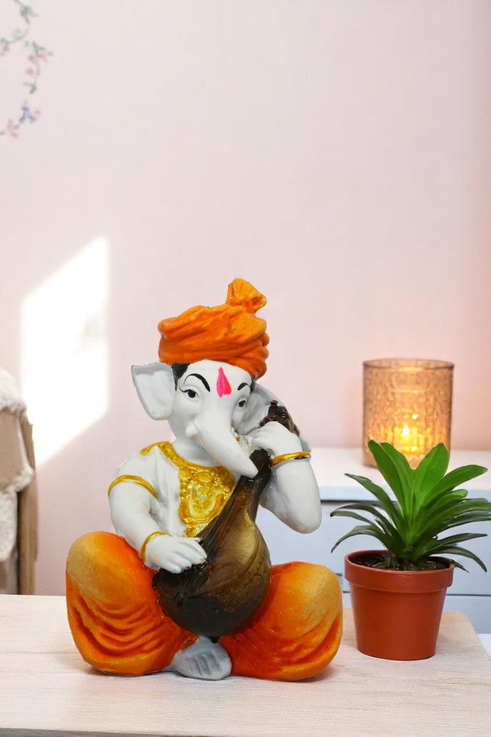 Stylish, this Ganesha idol is exquisitely crafted from premium resin. An ideal gift for housewarmings and festivals, suiting any living room, meditation area or office. Our beautiful Ganesh idol adds spiritual grace to your home décor and makes an ideal Diwali or housewarming gift. Musical Divine Presence: Depicts Lord Ganesha in a rare and serene pose, playing a classical Indian string instrument, symbolizing harmony, arts, and knowledge. Refined Orange and White: Showcases a harmonious colour palette of white with vibrant orange accents on the turban and dhoti, creating a calming visual appeal. Detailed Craftsmanship: Exhibits detailed details on the instrument and Ganesha' attire, reflecting the artisan' skill and dedication. Versatile and Inspiring Decoration: Thoughtful Artistic Gift: A perfect and one-of-a-kind gift for musicians, artists, students, or anyone seeking to infuse their space with divine blessings and melody. Emblem of Wisdom and Arts: Invokes blessings for success in artistic endeavors, wisdom, and the removal of obstacles through the power of divine sound. Durable Polyresin Material: Crafted from high- polyresin, ensuring longevity and easy maintenance with just a soft, dry cloth. Perfect for adding a stylish accent to your living space. Perfect for devotees looking for orange colour ganesh murti, orange colour ganpati and ganesha with laptop, this Ganesh statue brings blessings and elegance to your space.