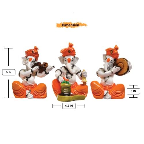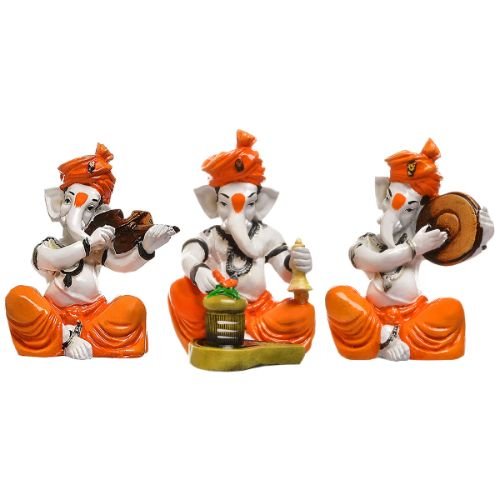 Stylish and lavish, this Ganesha idol is exquisitely crafted from polyresin. An ideal gift for housewarmings and festivals, suiting any living room, meditation area or office. Our beautiful Ganesh idol adds spiritual grace to your home décor and makes an ideal Diwali or housewarming gift. Trio of Musical Ganeshas: This delightful set features three distinct Ganesha idols, each gracefully playing a classic musical instrument, bringing a symphony of divine energy to your space. Vibrant Orange and White Hues: Adorned in charming orange dhotis and turbans against white bodies, these idols exude a cheerful and fortunate ambiance, enhancing any home decor. Emblem of Arts and Prosperity: Lord Ganesha, the patron of arts and remover of obstacles, blesses your home with creativity, wisdom, excellent fortune, and harmonious vibrations. High-Quality Polyresin Craftsmanship: Each figurine is meticulously crafted by hand from high- durable polyresin, ensuring lasting beauty and detailed detailing. Versatile Home Decor Set: Arrange them together as a captivating centrepiece or place them individually in your puja room, living room, music studio, or office for varied charm. Inspires Joy and Positivity: The playful and musical postures of these Ganeshas are designed to infuse your surroundings with happiness, enthusiasm, and positive energy. Perfect for adding a stylish accent to your living space. Perfect for devotees looking for orange colour ganesh murti, orange colour ganpati and ganesha with laptop, this Ganesh statue brings blessings and elegance to your space.