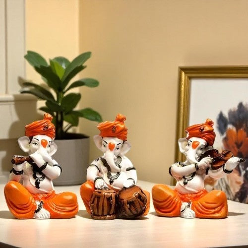 Fashionable, this Ganesha idol is beautifully made from premium materials. An excellent choice for spiritual and decorative gifting, gracefully decorating your table, shelf or altar. Our beautiful Ganesh idol adds spiritual grace to your home décor and makes an ideal Diwali or housewarming gift. Set of Three Musical Ganeshas: This listing features a delightful set of "three" Ganesha figurines, each uniquely portraying Lord Ganesha in an endearing childlike form, passionately playing a different musical instrument (flute, drum, and violin- instrument). This collection radiates artistic joy and spiritual harmony. "One-Of-A-Kind Little Three Lord Ganesha": The description "One-Of-A-Kind Little Three Lord Ganesha Playing Instruments Figurine" highlights the distinctiveness of this set, making it an exclusive choice for those seeking charming and rare Ganesha collectibles. Vibrant Orange and White Aesthetic: Each figurine features a crisp white body, gracefully contrasted with vibrant orange turbans, dhotis, and instrument details. This cheerful colour palette symbolizes energy, enthusiasm, and celebration. Expressive and Playful Facial Features: The Ganeshas have charming, expressive faces with large, innocent eyes and a slight smile, conveying a sense of pure joy and absorption in their music, adding warmth and personality to your home decor. Emblem of Art, Harmony and Creativity: This set powerfully symbolizes the importance of music and arts in spiritual life, promoting harmony, creativity, and the removal of obstacles through joyous expression. It' an ideal inspiration for artists and music lovers. "Best for Home Home Decor" Versatility: This versatile set is perfect for displaying together on a mantelpiece, shelf, or music room, or individually across different rooms, bringing blessings and aesthetic appeal throughout a Mumbai home. Thoughtful and One-Of-A-Kind Gift Set: A perfect and meaningful gift for musicians, artists, housewarmings, birthdays, festivals like Ganesh Chaturthi, or for anyone who cherishes spiritual and uniquely charming home decor. Perfect for adding a stylish accent to your living space. Perfect for devotees looking for orange colour ganesh murti, orange colour ganpati and ganesha with laptop, this Ganesh statue brings blessings and elegance to your space.