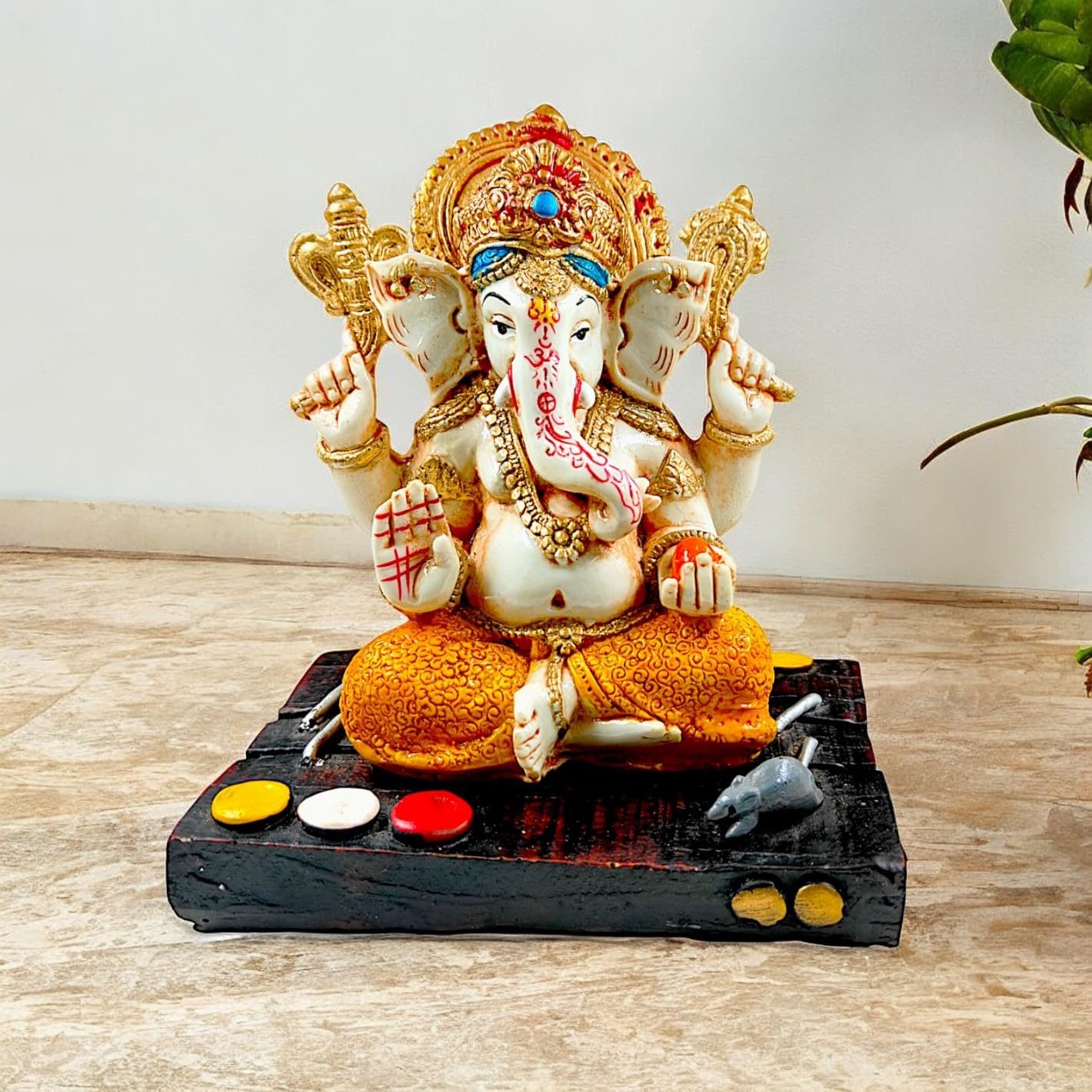 Chic and opulent, this Ganesha idol is expertly crafted from resin-crafted. A meaningful gift for diwali or special occasions, enhancing your office desk, bookshelf or meditation area. Our beautiful Ganesh idol adds spiritual grace to your home décor and makes an ideal Diwali or housewarming gift. Majestic Ganesha Presence: This impressive figurine features Lord Ganesha in a grand form, radiating wisdom, auspiciousness, and immense positive energy. His serene expression brings peace to any environment. Detailed Resin-Crafted Craftsmanship: Expertly crafted from high- durable resin-crafted, allowing for exceptionally fine details on Ganesha' attire, jewelry, crown, and the one-of-a-kind textured base. This ensures a long- and exquisite finish. Distinctive Ornate Base: The figurine rests on a substantial, intricately designed base with a dark, textured finish and what appears to be decorative gaming pieces or counters (potentially representing fortune/ This adds one-of-a-kind character and stability. Emblem of Prosperity and New Beginnings: Lord Ganesha, the Vighnaharta (remover of obstacles) and bestower of success, wisdom, and excellent fortune, makes this figurine a powerful emblem for fortunate starts and prosperity in all endeavors. Vibrant Gold and Orange Accents: Adorned with rich golden jewelry, a gracefully decorated crown with a prominent blue jewel, and a striking orange dhoti, the figurine boasts a vibrant yet refined aesthetic that captures attention. Accompanied by Mushak and Modak: Ganesha is depicted with his beloved modak (sweet), symbolizing spiritual rewards and abundance, and his loyal vehicle, Mushak (the mouse), representing humility and swiftness. Thoughtful Fortunate Gift: A profoundly meaningful and cherished gift for significant occasions like housewarmings, weddings, festivals (Ganesh Chaturthi, Diwali), or as a blessing for new ventures and loved ones. Creates a Serene Ambiance: Beyond its aesthetic appeal, this Ganesha figurine is believed to create an atmosphere of peace, harmony, and positivity, fostering a spiritual haven in your home. Perfect for adding a stylish accent to your living space. Perfect for devotees looking for orange colour ganesh murti, orange colour ganpati and ganesha with laptop, this Ganesh statue brings blessings and elegance to your space.