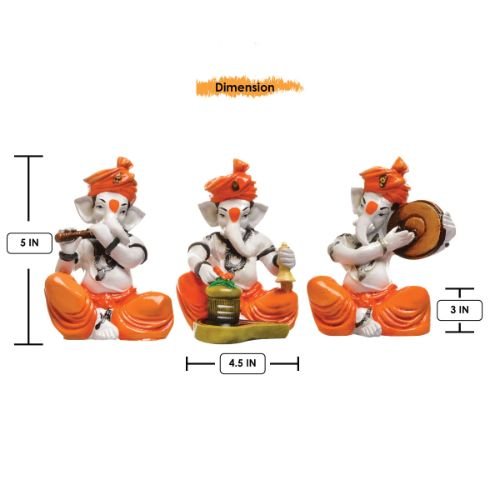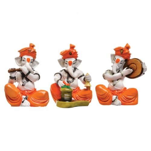 Stylish and lavish, this Ganesha idol is exquisitely crafted from premium materials. An ideal gift for housewarmings and festivals, suiting any living room, meditation area or office. Our beautiful Ganesh idol adds spiritual grace to your home décor and makes an ideal Diwali or housewarming gift. Musical Ganesha Ensemble: A charming set of three Lord Ganesha figurines, each bringing a one-of-a-kind musical vibe to your space. Vibrant and Adorable: Dressed in classic orange and white attire, these adorable Ganesha idols are designed to captivate hearts. Flute Player: One Ganesha is depicted gracefully playing a flute, symbolizing serenity and enchanting melodies. Harmonium Maestro: The central Ganesha is shown with a harmonium- instrument, representing devotion and spiritual harmony. Rhythmic Tabla Player: The third Ganesha is dynamically playing a tabla or similar percussion instrument, adding a lively rhythm to the trio. Serene Seated Pose: All three idols are seated in a meditative and serene posture, exuding tranquility and excellent vibes. Versatile Home Decor: Perfect Gift Idea: A thoughtful and fortunate gift for housewarmings, festivals like Ganesh Chaturthi, weddings, or any special occasion, bringing blessings and joy to loved ones. Emblem of Auspiciousness: These idols not only decorate your space but also invite prosperity, wisdom, and obstacle removal into your home. Perfect for adding a stylish accent to your living space. Perfect for devotees looking for orange colour ganesh murti, orange colour ganpati and ganesha with laptop, this Ganesh statue brings blessings and elegance to your space.