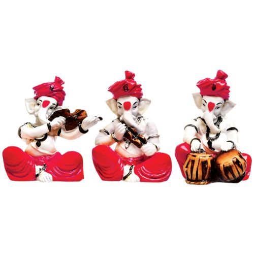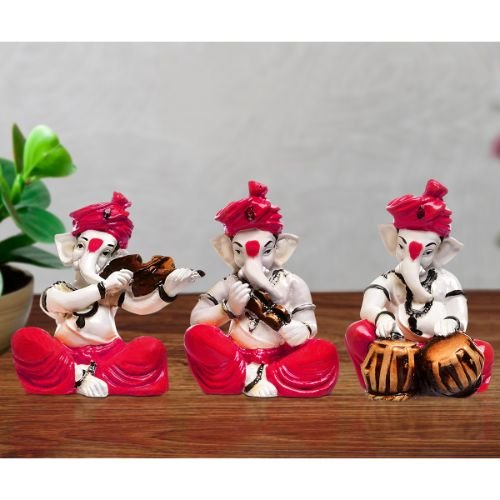 Sophisticated, this Ganesha idol is expertly crafted from premium materials. A thoughtful gift for any occasion, accentuating your living room, office or prayer space. Our beautiful Ganesh idol adds spiritual grace to your home décor and makes an ideal Diwali or housewarming gift. Vibrant Musical Trio: This exquisite offering presents a charming set of 3 Ganesha idols, each uniquely poised to play a different classic musical instrument one with a violin/ one with a flute, and another with a drum (tabla/ This trio embodies the complete symphony of divine rhythm and artistic expression. Striking Red and White Palette: Each captivating Ganesha figurine features a pristine white body, gracefully contrasted with vibrant red turbans and dhotis, creating a lively, energetic, and culturally rich aesthetic that truly stands out. Charming and Expressive Sizes: As adorable different types of Ganesha idols, they are perfectly sized for intimate spaces, shelves, music rooms, study areas, office desks, or personal altars, bringing powerful blessings and an artistic touch in a compact and adorably expressive form. Emblem of Arts, Wisdom and Joy: This musical ensemble highlights Lord Ganesha' profound patronage of arts, music, and knowledge. They symbolize creativity, intellectual pursuit, the removal of obstacles for artistic endeavors, and the bringer of pure joy, making them Detailed Details: Each figurine showcases fine craftsmanship, visible in the detailed sculpting of their expressive faces, the refined folds of their red attire, and the realistic rendering of the one-of-a-kind musical instruments they hold. Versatile Decor Accent: Invites Positive Vibrations and Serenity: The presence of these delightful musical Ganesha idols is believed to attract harmonious vibrations, deep peace, and an abundance of positive energy into your surroundings, filling your space with a serene and uplifting atmosphere. Thoughtful and Fortunate Gift Set: A perfect and meaningful gift for musicians, artists, housewarmings, weddings, festivals like Ganesh Chaturthi and Diwali, birthdays, or for anyone who cherishes spiritual decor, cultural artistry, and the performing arts. Makes an eye-catching addition to your office or home. Perfect for devotees looking for orange colour ganesh murti, orange colour ganpati and ganesha with laptop, this Ganesh statue brings blessings and elegance to your space.