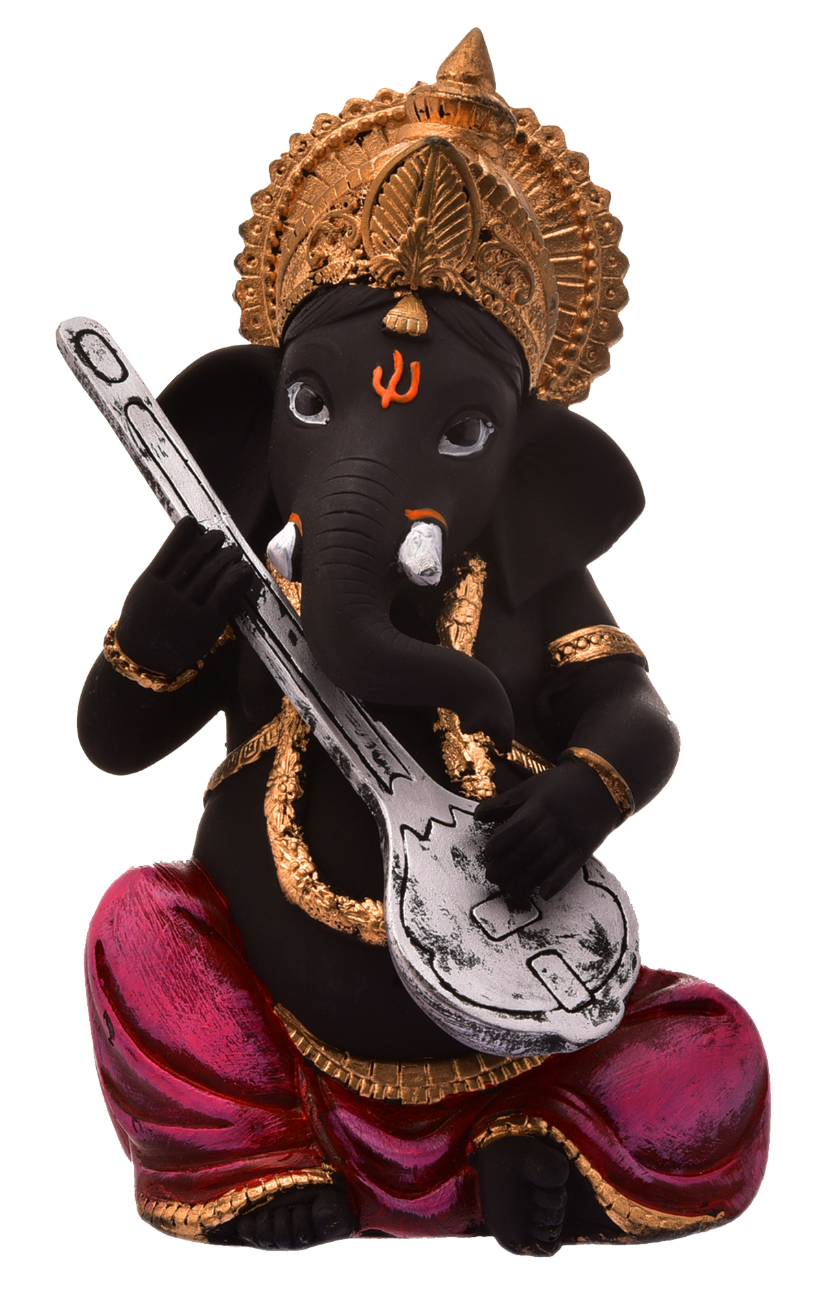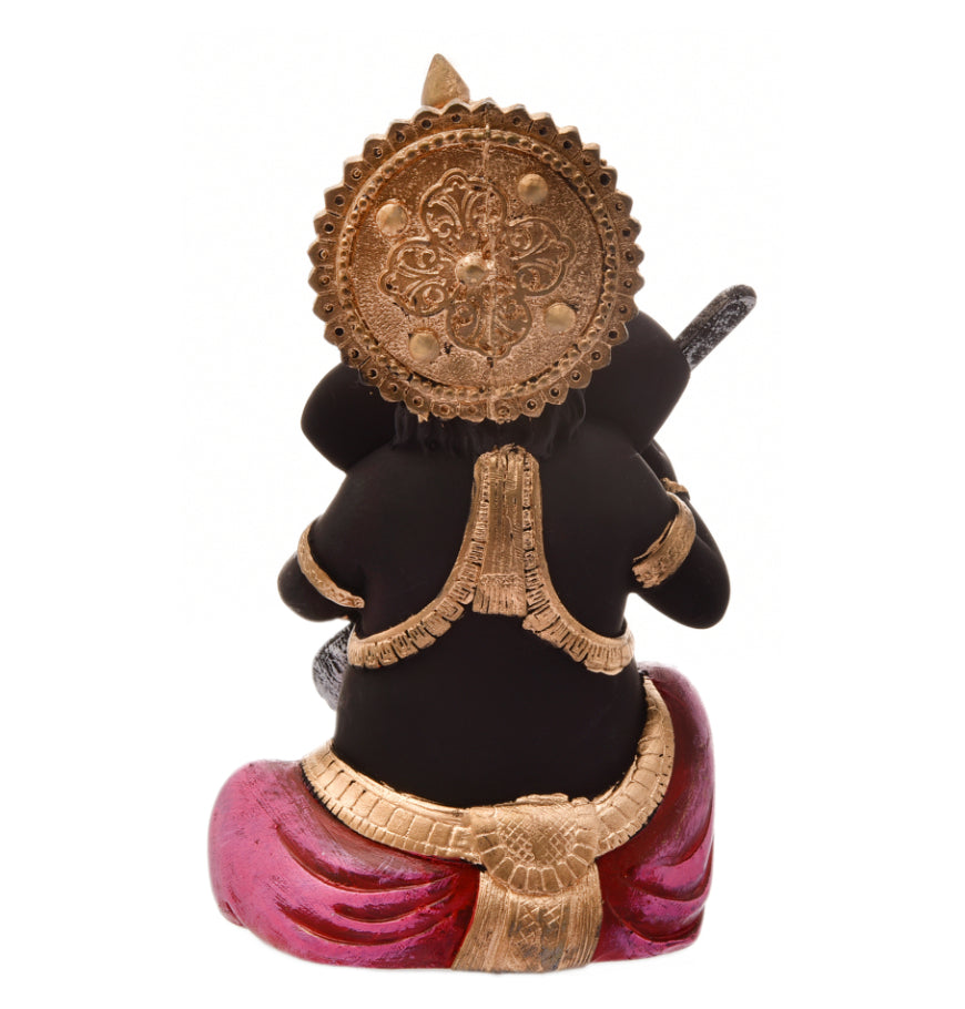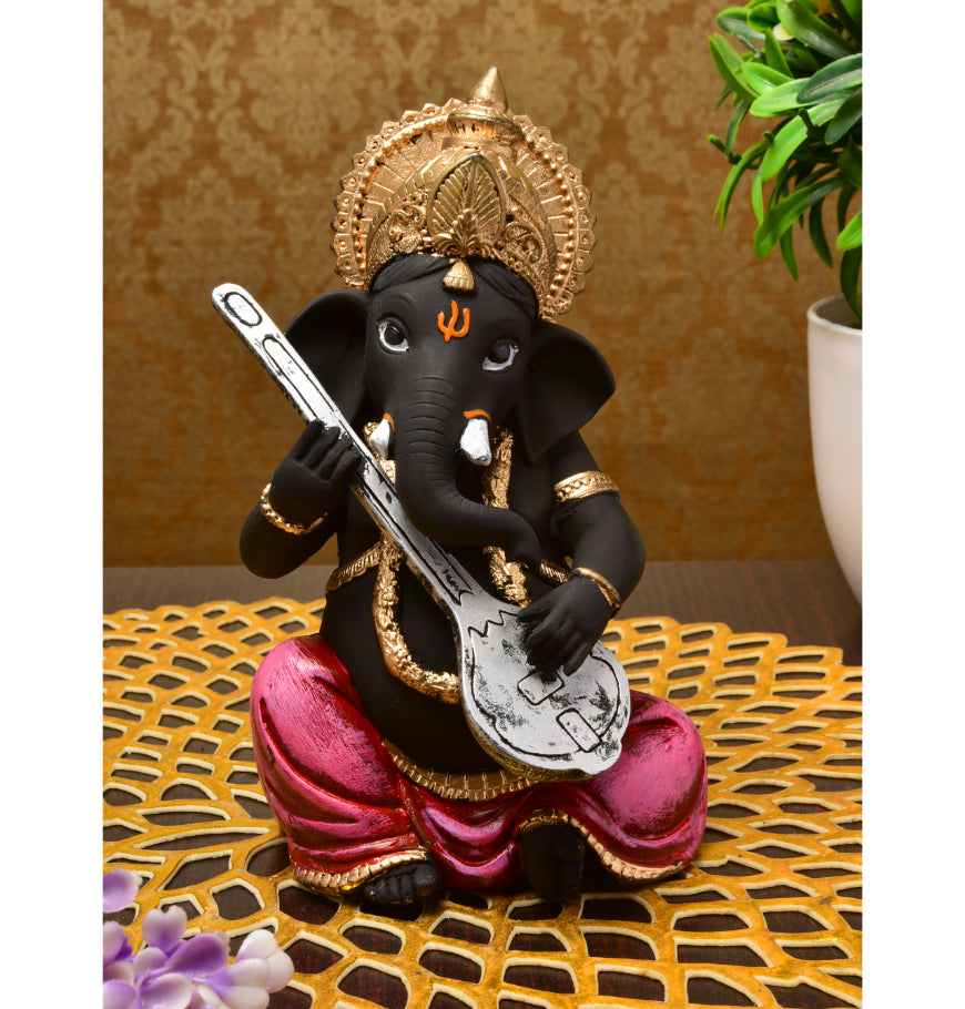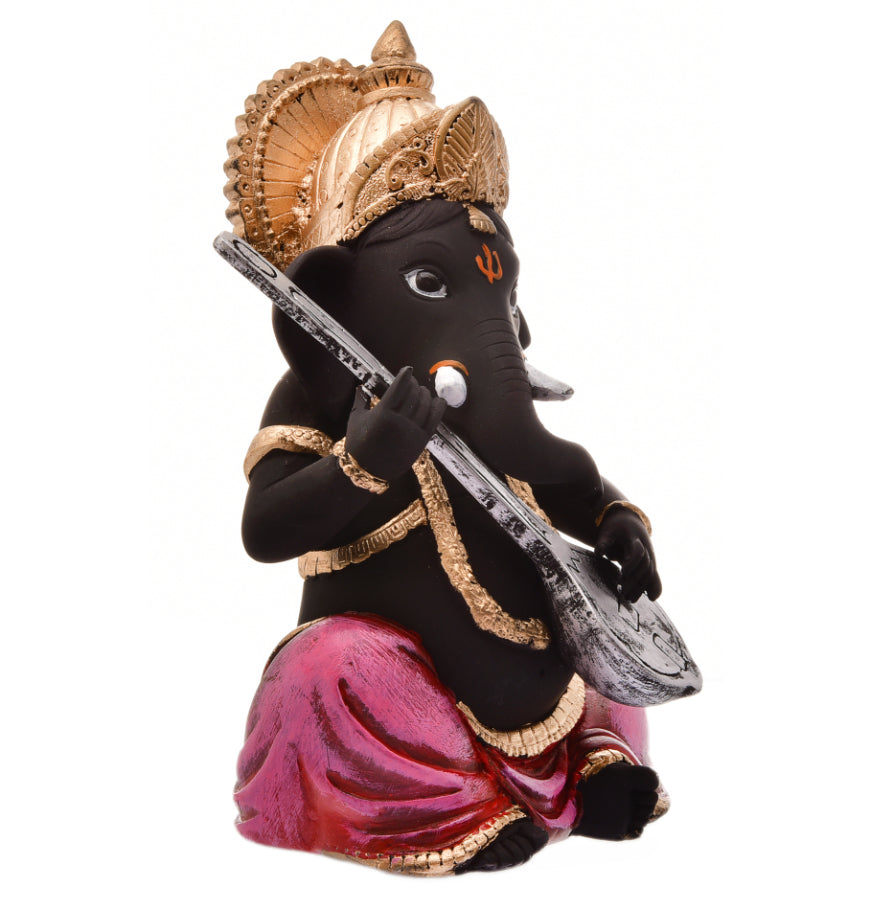 Elegant and fashionable, this Ganesha idol is expertly crafted from resin-crafted. A thoughtful gift for any occasion, accentuating your living room, office or prayer space. Our beautiful Ganesh idol adds spiritual grace to your home décor and makes an ideal Diwali or housewarming gift. Striking Black and Gold with Pink Accents: This exquisite Ganesha figurine features a rare and powerful black body, gracefully complemented by a vibrant pink dhoti and opulent golden accents on his detailed crown, jewelry, and attire. This one-of-a-kind colour combination adds a touch of contemporary elegance to classic spirituality. Master of Melody (Playing Sitar/ Lord Ganesha is gracefully depicted playing a stringed instrument, identified as either a Sitar or Veena. This pose symbolizes the infusion of divine music, creative energy, and harmonious vibrations into your environment, inspiring artistic endeavors. Authentic Crafted By Hand Durable: This is a " India Crafted By Hand Resine Playing Sitar Ganesha Figurine Statue", highlighting superior Indian craftsmanship and attention to detail, ensuring a high- and one-of-a-kind collectible. Made from durable polyresin. Emblem of Wisdom and Obstacle Removal: As the remover of obstacles, Lord Ganesha brings blessings of excellent fortune, intellectual pursuits, and success in all endeavors, making this figurine a powerful addition to your home or office. Detailed Details: The figurine showcases meticulous craftsmanship, visible in the detailed carving of the instrument, the ornate crown, and the classic orange tilak on his forehead and trunk. Versatile Decor Accent: Radiates Calm and Creative Energy (New Pointer): The serene expression of Ganesha combined with the symbolism of music is believed to promote a calm, focused, and creatively inspiring atmosphere in any space. Meaningful and Artistic Gift: A perfect and memorable gift for musicians, artists, housewarmings, birthdays, festivals like Ganesh Chaturthi, or for anyone who appreciates one-of-a-kind spiritual art and decor. Makes an eye-catching addition to your office or home. Perfect for devotees looking for orange colour ganesh murti, orange colour ganpati and ganesha with laptop, this Ganesh statue brings blessings and elegance to your space.