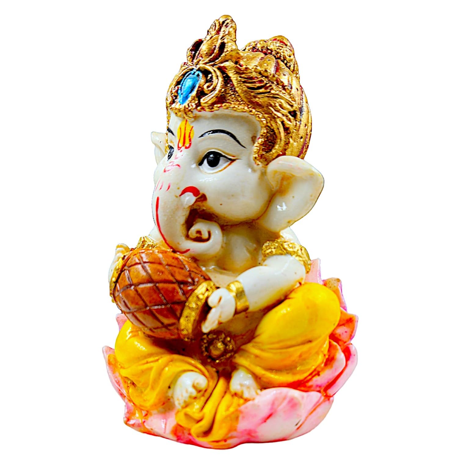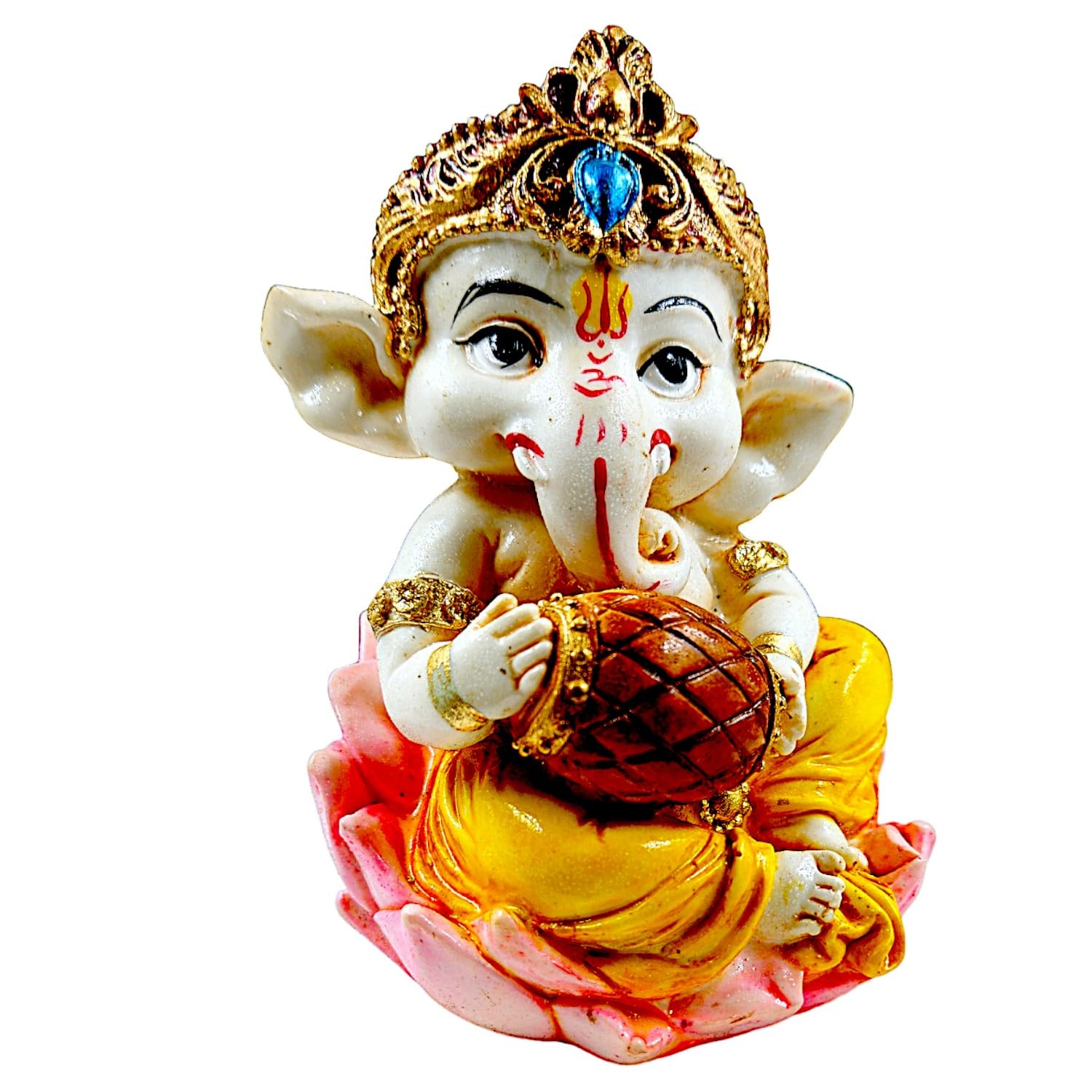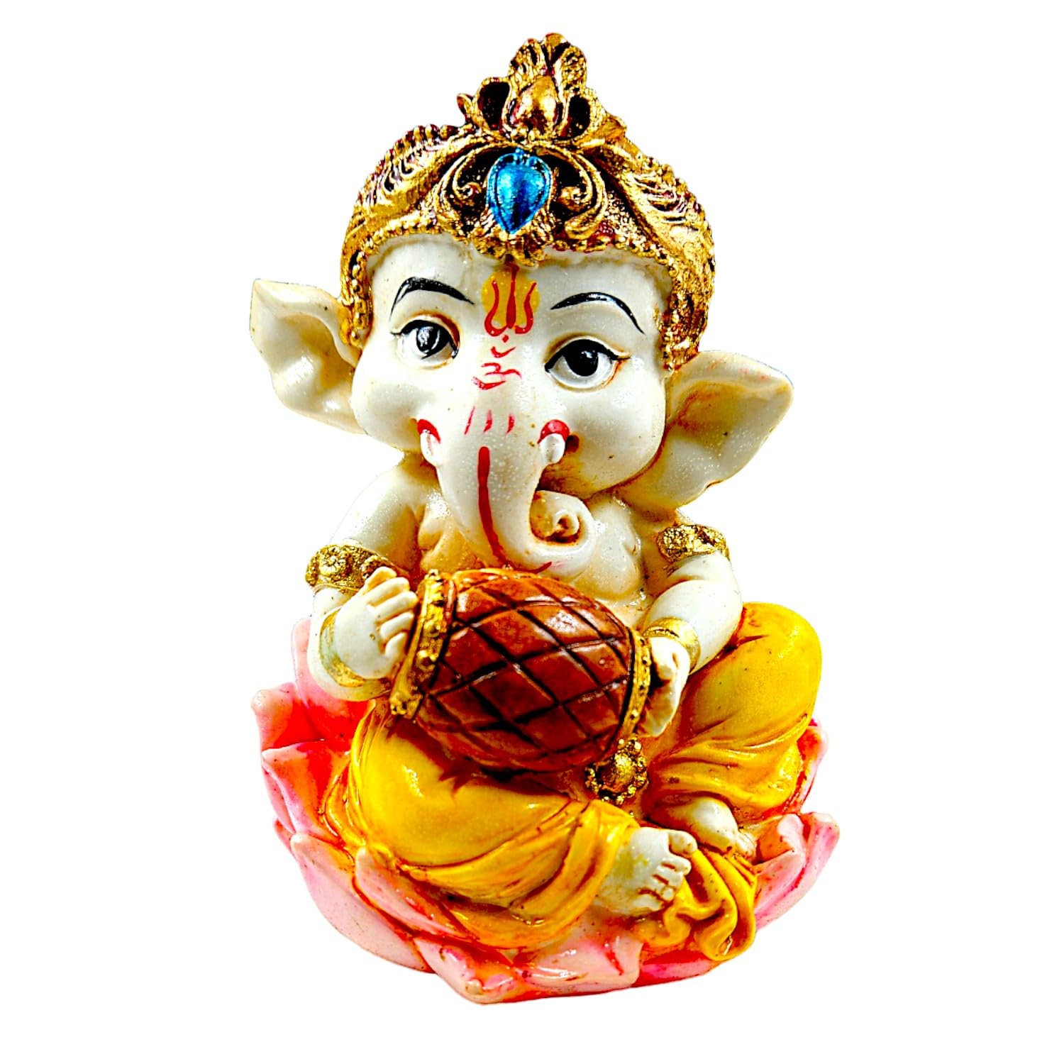 Graceful and captivating, this Ganesha idol is beautifully made from handcrafted resin. An excellent choice for spiritual and decorative gifting, gracefully decorating your table, shelf or altar. Our beautiful Ganesh idol adds spiritual grace to your home décor and makes an ideal Diwali or housewarming gift. Charming Little Ganesha Form: This delightful figurine features Lord Ganesha in his endearing little form, radiating innocence, joy, and wisdom. His sweet demeanor makes him a beloved presence in any home. Emblem of Excellent Fortune: Ganesha, the remover of obstacles, brings excellent fortune, prosperity, and success. Placing this figurine in your home or office is believed to invoke his blessings for new beginnings and ventures. High- Resin-Crafted Craftsmanship: Meticulously crafted from durable and lightweight resin-crafted, allowing for detailed details and a vibrant, long- finish. The fine artistry is evident in every curve and embellishment. Seated on a Lotus and Holding Modak: Depicts Ganesha seated gracefully on a pink lotus, symbolizing purity and spiritual growth, while holding his favorite sweet, the modak, representing rewards and abundance. Vibrant and Detailed Home Decor: Adorned with rich colors, a majestic crown with a blue jewel, and classic markings (tilak), making it a visually appealing piece that brightens any room. Versatile Home and Office Home Decor: Perfect for various settings place it on your puja (prayer) altar, office desk, living room shelf, bedside table, or as a decorative accent in any serene corner. Easy to Maintain: The resin-crafted material ensures this figurine is easy to clean. Simply wipe gently with a soft, dry cloth to keep its luster and beauty intact for years. Inspires Peace and Positivity: His benevolent presence is known to create an atmosphere of peace, harmony, and positivity, fostering a serene environment for your familial and guests. Enhances the ambiance of living rooms, bedrooms, and offices. Perfect for devotees looking for orange colour ganesh murti, orange colour ganpati and ganesha with laptop, this Ganesh statue brings blessings and elegance to your space.