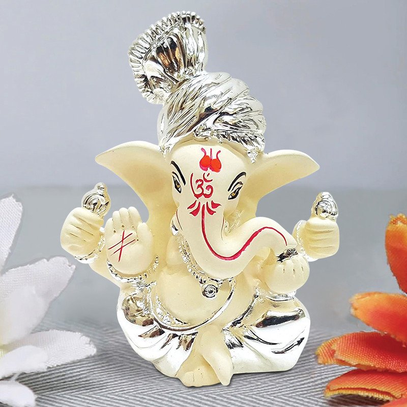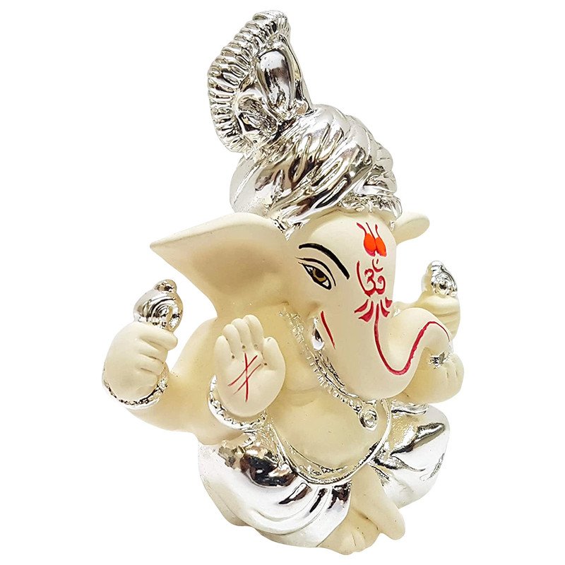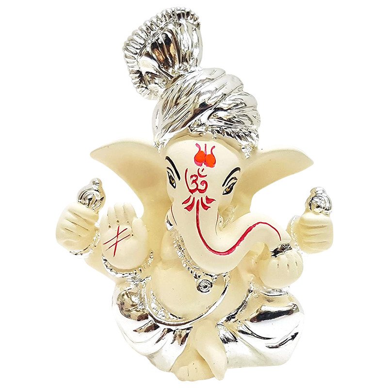 Current, this Ganesha idol is skillfully crafted from durable resin. A heartwarming gift for family and friends, brightening up any nook, workspace or spiritual corner. Our beautiful Ganesh idol adds spiritual grace to your home décor and makes an ideal Diwali or housewarming gift. Distinctive Silver and Chandan Finish: This captivating "Ganesha" statue boasts a rare and graceful aesthetic, combining lustrous silver plating on his turban and lower body with a serene chandan (sandalwood) colour for his skin. This blend offers a sophisticated and classic look. Regal Silver Turban: Ganesha' head is adorned with a meticulously crafted silver turban, symbolizing royalty, wisdom, and honour, adding a distinctive majestic touch to his appearance. "Gold Art India" Craftsmanship: As a product from "Gold Art India", this "Silver Chandan Ceramic Ganesh Statue" reflects exceptional artistry and attention to detail, ensuring a high- crafted by hand piece that embodies cultural richness. Prominent Red Tilak and Om Emblem: A vibrant red tilak graces his forehead, alongside a clear red "Om" emblem on his trunk, signifying auspiciousness, spirituality, and the universal sound of creation, highly revered in Hindu traditions. Classic Blessing Pose: Lord Ganesha is depicted in a classic seated posture, with one hand raised in a gesture of blessing (Abhaya Mudra) and the other holding a modak, signifying prosperity, fearlessness, and the fulfillment of desires. Ideal "Ganesh Statue for Car Dashboard": Its compact size and stable design make it an excellent "Ganesh Statue for car dashboard", providing blessings for safe travels and positive energy on busy Mumbai roads. Emblem of Purity and Calm: The chandan and silver combination evokes purity, tranquility, and a cooling effect, making this statue a wonderful emblem for attracting peace, harmony, and serenity into your surroundings. Thoughtful and Fortunate Gift: A perfect and meaningful gift for new car owners, housewarmings, weddings, festivals like Ganesh Chaturthi and Diwali, or for anyone who cherishes spiritual and graceful decor. to Maintain: Keep this stunning statue pristine by simply wiping it with a soft, dry cloth, ensuring its radiant appearance is maintained effortlessly. A wonderful gift for loved ones and collectors. Perfect for devotees looking for orange colour ganesh murti, orange colour ganpati and ganesha with laptop, this Ganesh statue brings blessings and elegance to your space.