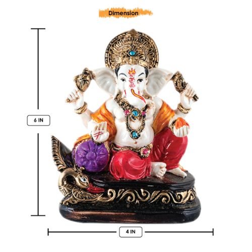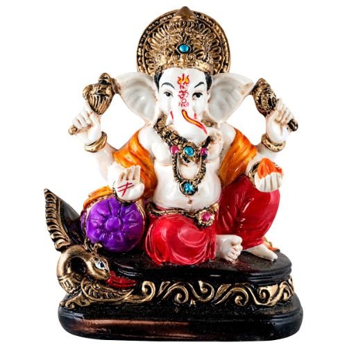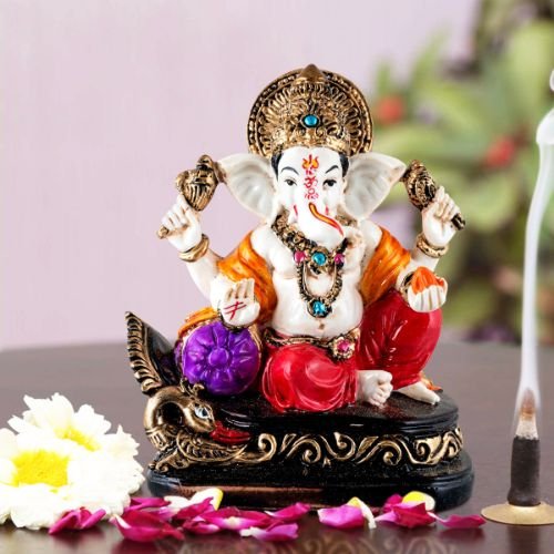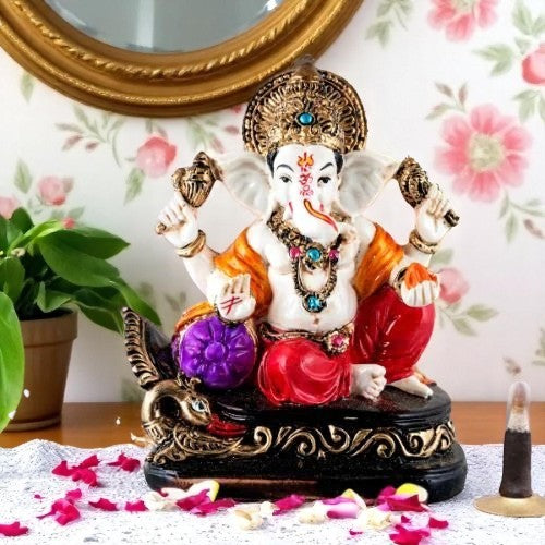 Contemporary and one-of-a-kind, this Ganesha idol is skillfully crafted from premium materials. A heartwarming gift for family and friends, brightening up any nook, workspace or spiritual corner. Our beautiful Ganesh idol adds spiritual grace to your home décor and makes an ideal Diwali or housewarming gift. Vibrant Multicolour Design: This "Lord Ganesha" figurine features a rich array of colors, including a white body, orange and red elements on his attire and accessories, and a striking purple modak, adding a vibrant and fortunate touch to any setting. Majestic Lotus- Base: Ganesha is seated on an intricately designed base that resembles a lotus, symbolizing purity, spiritual growth, and divinity. Classic Seated Posture: Lord Ganesha is depicted in a classic seated posture, with one hand raised in blessing (Abhaya Mudra) and the other holding a modak, signifying prosperity and obstacle removal. Versatile Home and Office Decoration: Emblem of Wisdom and Prosperity: As "ganesha idols online" are sought after, this figurine serves as a powerful emblem of wisdom, excellent fortune, and the removal of obstacles, attracting positive energy. Thoughtful and Fortunate Gift: A perfect and meaningful gift for housewarmings, weddings, festivals like Ganesh Chaturthi and Diwali, or for anyone who cherishes spiritual decoration. Durable Construction: Crafted with attention to detail and from durable materials (implied by typical figurine construction), ensuring its lasting beauty in your home. Easy to Maintain: Simply wipe with a soft, dry cloth to keep this lovely figurine looking pristine and vibrant. Designed to complement modern and traditional interiors. Perfect for devotees looking for orange colour ganesh murti, orange colour ganpati and ganesha with laptop, this Ganesh statue brings blessings and elegance to your space.