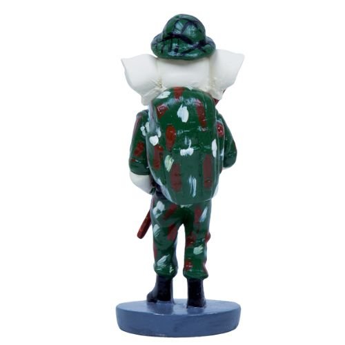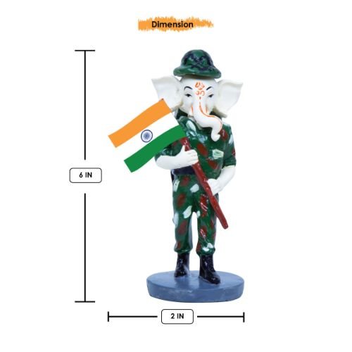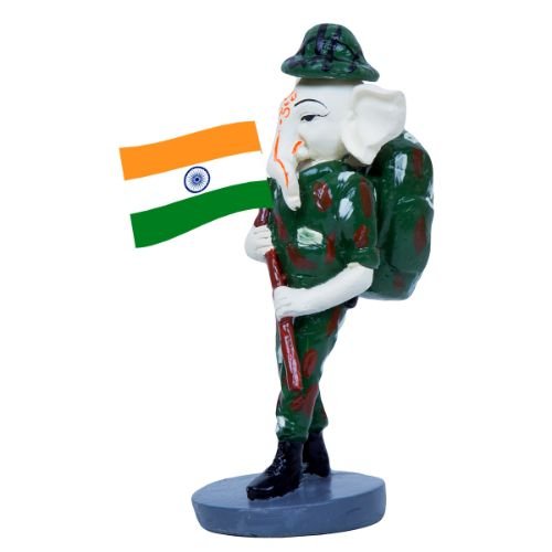 Premium and fashionable, this Ganesha idol is exquisitely crafted from premium materials. An ideal gift for housewarmings and festivals, suiting any living room, meditation area or office. Our beautiful Ganesh idol adds spiritual grace to your home décor and makes an ideal Diwali or housewarming gift. Patriotic Ganesha Avatar: This captivating "Ganesha" statue uniquely portrays Lord Ganesha as an Indian Army soldier, complete with camouflage attire and a helmet, embodying strength, courage, and dedication to the nation. Proudly Waving the Indian Flag: The statue features Lord Ganesha holding the vibrant Indian Tricolour flag with pride, symbolizing national spirit, unity, and respect for the country. Emblem of Protection and Valor (: Dressed as a soldier, this "Lord Ganesha" represents divine protection and the valor of the Indian armed forces, bringing a sense of security and inspiration to your space. Detailed Military Details: The figure showcases fine craftsmanship, visible in the detailed sculpting of his army uniform, helmet, and the precise depiction of the Indian flag. Inspires Patriotism and Respect: This distinctive statue serves as a constant reminder of the sacrifices made by soldiers and inspires a deeper sense of patriotism and respect for the nation. Thoughtful and Fortunate Gift: A perfect and meaningful gift for defense personnel, veterans, patriots, or for occasions like Republic Day, Independence Day, or for anyone who cherishes spiritual and patriotic decor. Perfect for devotees looking for orange colour ganesh murti, orange colour ganpati and ganesha with laptop, this Ganesh statue brings blessings and elegance to your space.