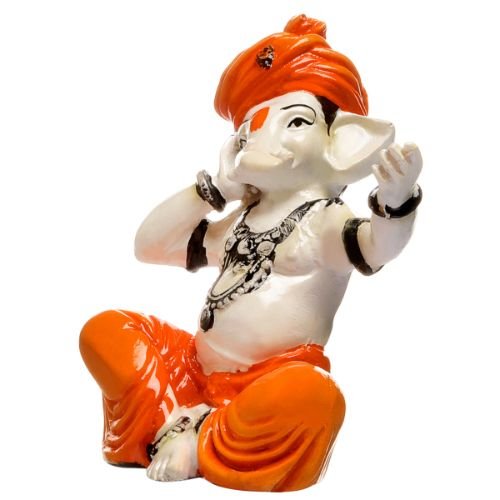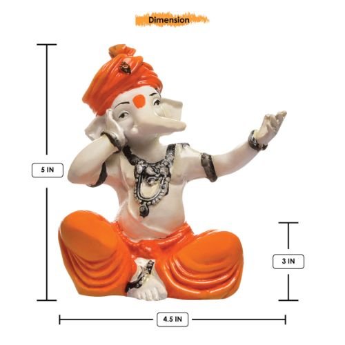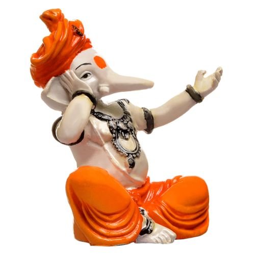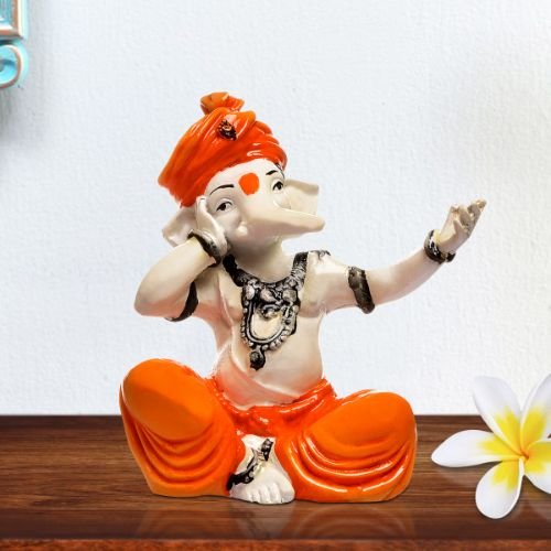 High-quality, this Ganesha idol is skillfully crafted from premium materials. A heartwarming gift for family and friends, brightening up any nook, workspace or spiritual corner. Our beautiful Ganesh idol adds spiritual grace to your home décor and makes an ideal Diwali or housewarming gift. Divine Depiction: A charming figure of Lord Ganesha, the elephant- Hindu deity, known as the remover of obstacles. Seated Pose: He is depicted in a comfortable, cross- seated posture, radiating tranquility. Melodious Ganesha? One hand is raised and cupped near his ear, suggesting he might be listening intently to music or perhaps even singing a devotional hymn. Expressive Gesture: The other hand is raised with the palm open, possibly in a gesture of blessing, welcoming, or even expressing joy and adoration. Vibrant Attire: He is adorned in striking orange dhoti- attire, symbolizing sacrifice, courage, and spirituality. Contrasting Colors: The white upper body and trunk provide a stunning contrast to the orange, highlighting the details of the statue. Classic Features: His iconic elephant head and trunk are clearly visible, though stylized for the figure. Perfect Decoration: This statue would make a lovely addition to a home temple, living room, or office space, bringing positive vibes and blessings. Ideal Gift: A wonderful gift for religious occasions, housewarmings, or anyone who appreciates Hindu culture and spirituality. Perfect for devotees looking for orange colour ganesh murti, orange colour ganpati and ganesha with laptop, this Ganesh statue brings blessings and elegance to your space.