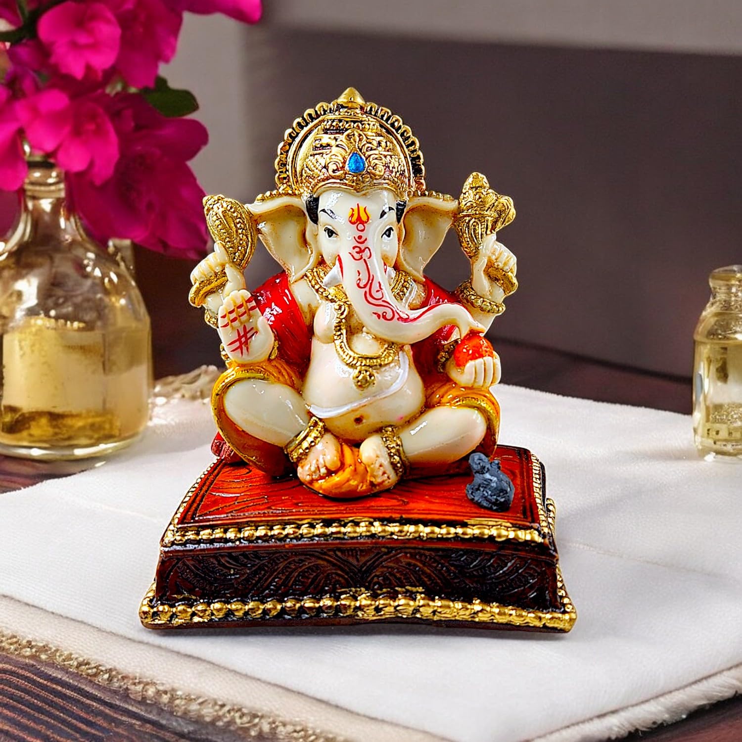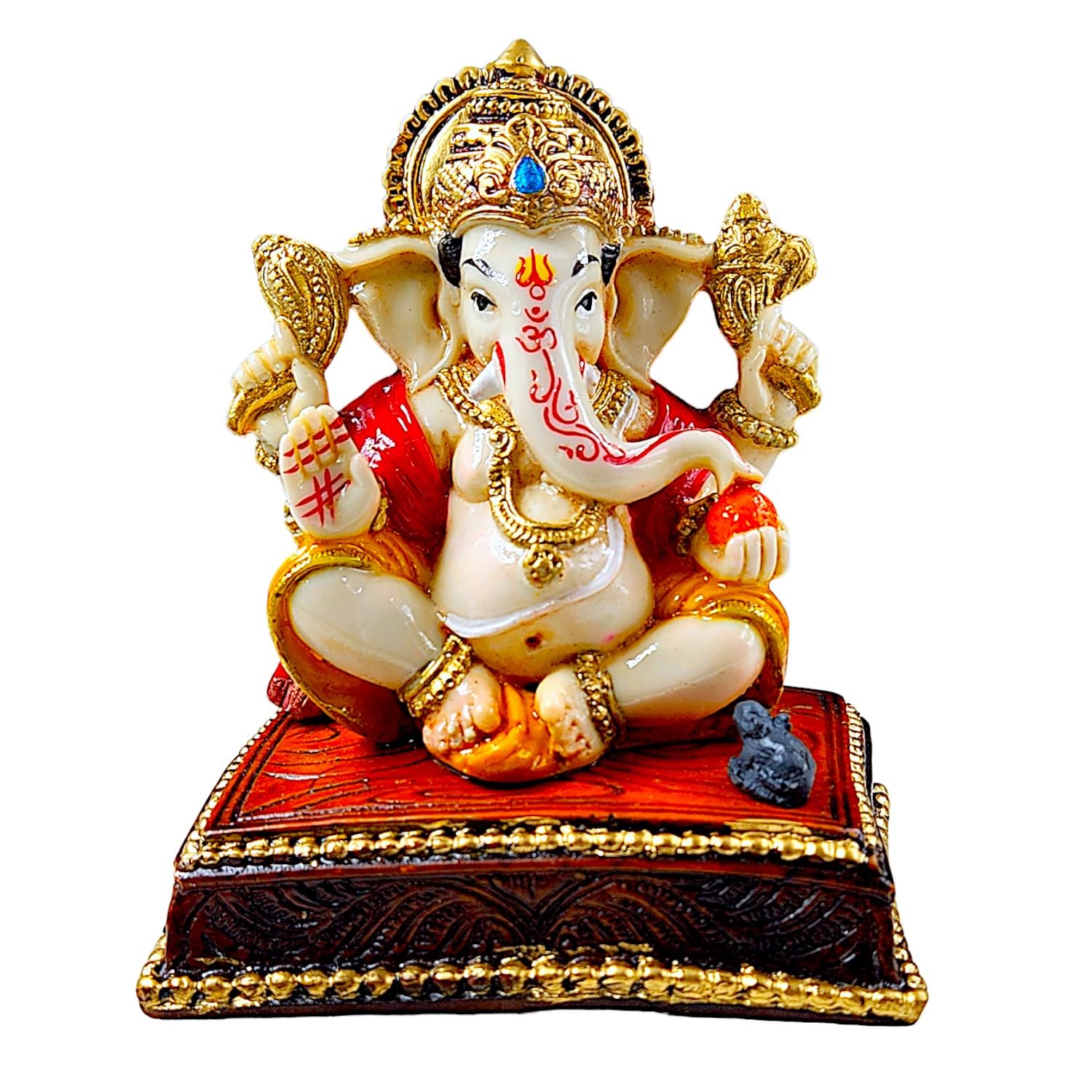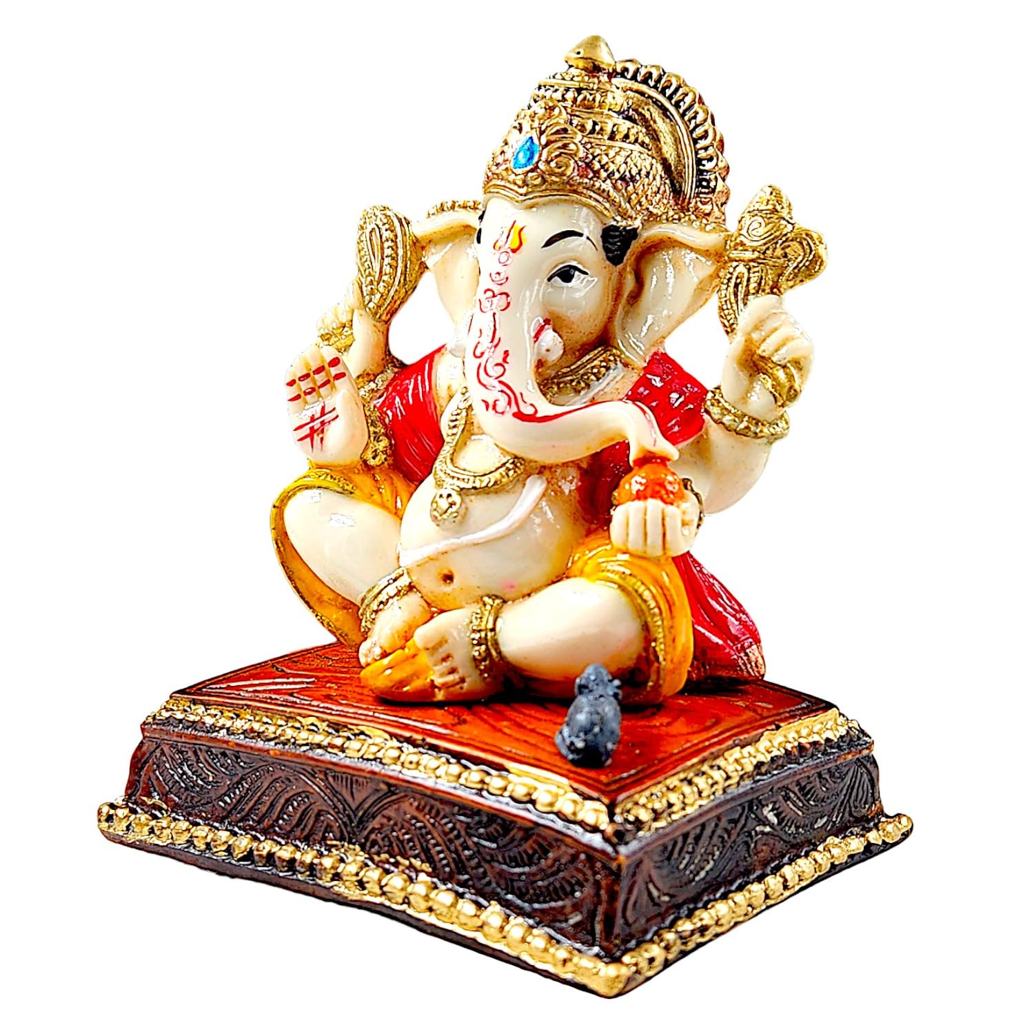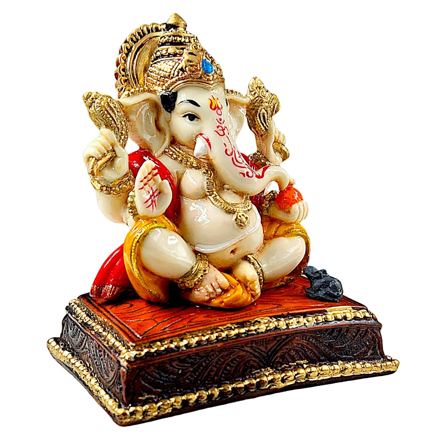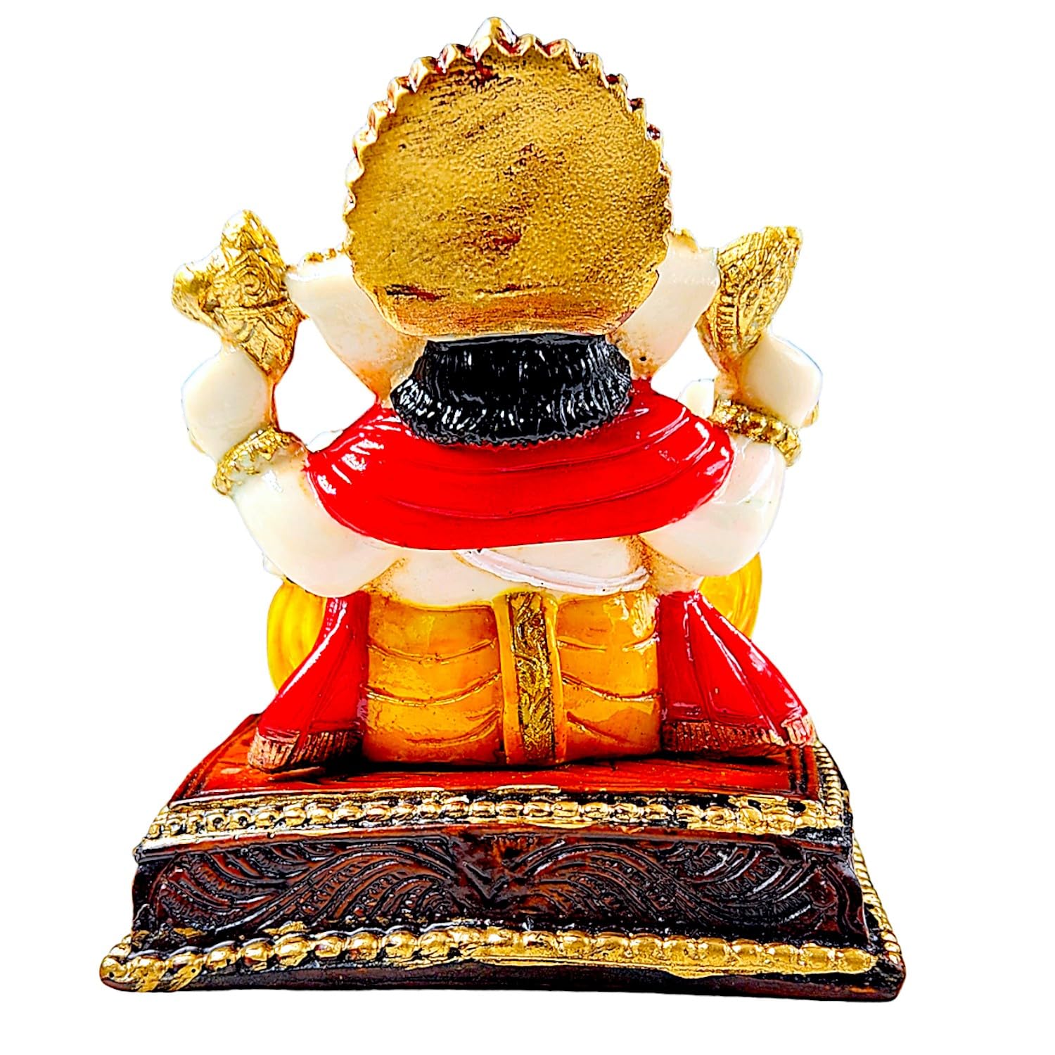Exquisite and graceful, this Ganesha idol is meticulously crafted from resin-made. A wonderful housewarming or festival gift, decorating your dining room, entryway or home temple. Our beautiful Ganesh idol adds spiritual grace to your home décor and makes an ideal Diwali or housewarming gift. Vighnaharta - Remover of Obstacles: Lord Ganesha is revered as the deity who clears paths and ensures smooth beginnings, bestowing success and prosperity in all endeavors. Graceful White and Gold Finish: Crafted from high- resin and meticulously hand- with a serene white and opulent gold finish, creating a sophisticated and divine aesthetic that complements any decor style. Emblem of Wisdom and Excellent Fortune: Ganesha' presence is believed to attract intellect, knowledge, and abundant excellent fortune, making it Detailed and Majestic Detailing: Every feature, from his serene expression and prominent trunk to the detailed jewelry and classic attire, is finely sculpted, showcasing exceptional craftsmanship. Fortunate Decor: Perfect for your home temple, living room, office desk, or entryway, this statue radiates positive energy and creates a serene, blessed environment. Thoughtful and Spiritual Gifting: An ideal and revered gift for housewarmings, festivals like Ganesh Chaturthi and Diwali, new business ventures, or for anyone seeking divine blessings and harmony. Perfect for devotees looking for orange colour ganesh murti, orange colour ganpati and ganesha with laptop, this Ganesh statue brings blessings and elegance to your space.