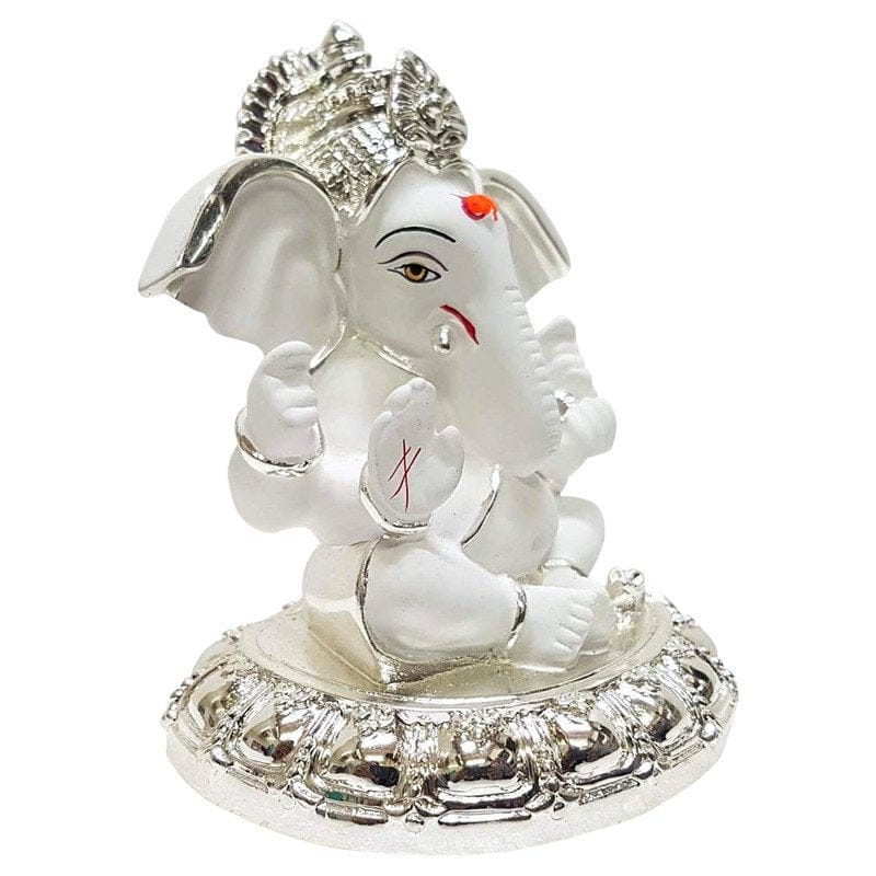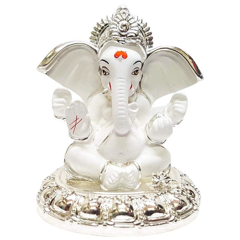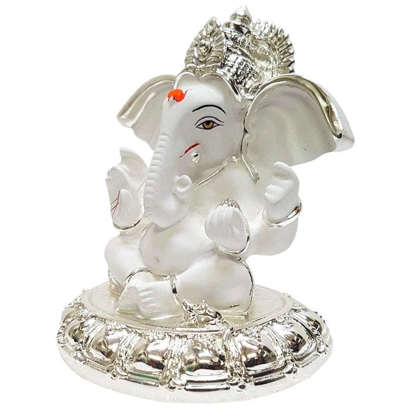 Timeless, this Ganesha idol is exquisitely crafted from ceramic. An ideal gift for housewarmings and festivals, suiting any living room, meditation area or office. Our beautiful Ganesh idol adds spiritual grace to your home décor and makes an ideal Diwali or housewarming gift. Lustrous Silver- Finish: This captivating Ganesha statue boasts a brilliant silver- finish, exuding an aura of elegance and purity, exquisitely complemented by subtle white on his body and classic red tilak, creating a serene and sophisticated aesthetic. Charming Small Size: As a Ganesha small Ganpati statue, it' perfectly sized for intimate spaces, shelves, car dashboards, or personal altars, bringing powerful blessings in a compact and adorable form. Classic Seated Pose with Blessings: Lord Ganesha is depicted in a classic seated posture, with one hand raised in a gesture of blessing (Abhaya Mudra) and the other holding a modak (sweet), symbolizing prosperity and the fulfillment of desires. Emblem of Purity and Prosperity: The silver finish is traditionally associated with purity, wealth, and divine energy, making this statue a wonderful emblem for attracting positive vibrations, excellent fortune, and spiritual serenity. Detailed Details: The figure showcases fine craftsmanship, visible in the detailed sculpting of his expressive face, the ornate silver crown, and the classic red tilak on his forehead, highlighting its artistic value. Invites Calm and Positive Energy: The serene silver hue combined with Ganesha' benevolent form is believed to attract calm, positive energy, and a sense of well- into your surroundings, fostering a serene atmosphere. Thoughtful and Fortunate Gift: A perfect and meaningful gift for housewarmings, weddings, festivals like Ganesh Chaturthi and Diwali, birthdays, corporate gifting, or for anyone who cherishes spiritual and graceful decor. Bring charm and elegance to your décor. Perfect for devotees looking for orange colour ganesh murti, orange colour ganpati and ganesha with laptop, this Ganesh statue brings blessings and elegance to your space.