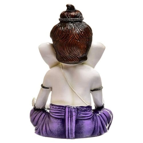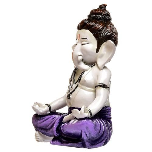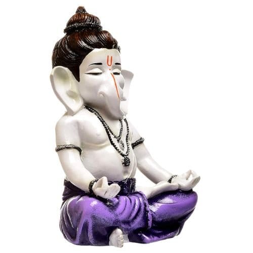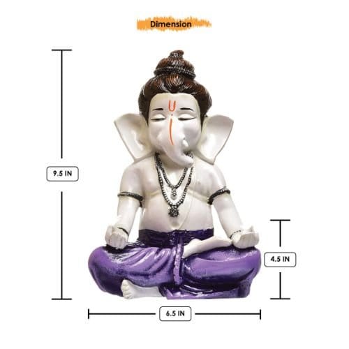 Classic and chic, this Ganesha idol is skillfully crafted from durable resin. Makes a charming present for loved ones, adding elegance to your hallway, bedroom or meditation corner. Our beautiful Ganesh idol adds spiritual grace to your home décor and makes an ideal Diwali or housewarming gift. Meditative Ganesha: This captivating statue portrays Lord Ganesha in a deep state of mindfulness, with eyes serenely closed, exuding an aura of peace and inner calm. Serene Purple and White Palette: Features a distinctive deep purple dhoti, exquisitely contrasting with Ganesha' off- body, creating a harmonious and aesthetically pleasing look. Eco- Polyresin Craft: Crafted from durable and eco- polyresin material, ensuring longevity and an environmentally conscious choice for your decor. As stated in the original prompt, it' a " India Crafted By Hand Polyresin Eco Friendly Lord Ganesha Ganpati Statue Figure." Emblem of Wisdom and Tranquility: The meditative posture symbolizes concentration, inner peace, and the attainment of wisdom, making it an ideal piece for spiritual reflection. Versatile Decor for Any Space: Perfect for your puja room, mindfulness corner, yoga studio, office desk, or living room, adding a touch of spirituality and serenity. Detailed Details: Notice the detailed topknot hairstyle, the classic tilak on his forehead, and the delicate black beaded necklace and armbands, showcasing fine craftsmanship. Thoughtful and Fortunate Gift: A meaningful gift for various occasions such as housewarmings, spiritual gatherings, birthdays, or for anyone seeking peace and positive vibes in their life. Promotes Positive Energy: Believed to radiate positive energy and help in overcoming obstacles, this statue serves as a constant reminder of divine blessings and inner calm. Natural Ambience: Often paired with natural elements like plants and flowers enhancing its serene appeal. Bring charm and elegance to your décor. Perfect for devotees looking for orange colour ganesh murti, orange colour ganpati and ganesha with laptop, this Ganesh statue brings blessings and elegance to your space.