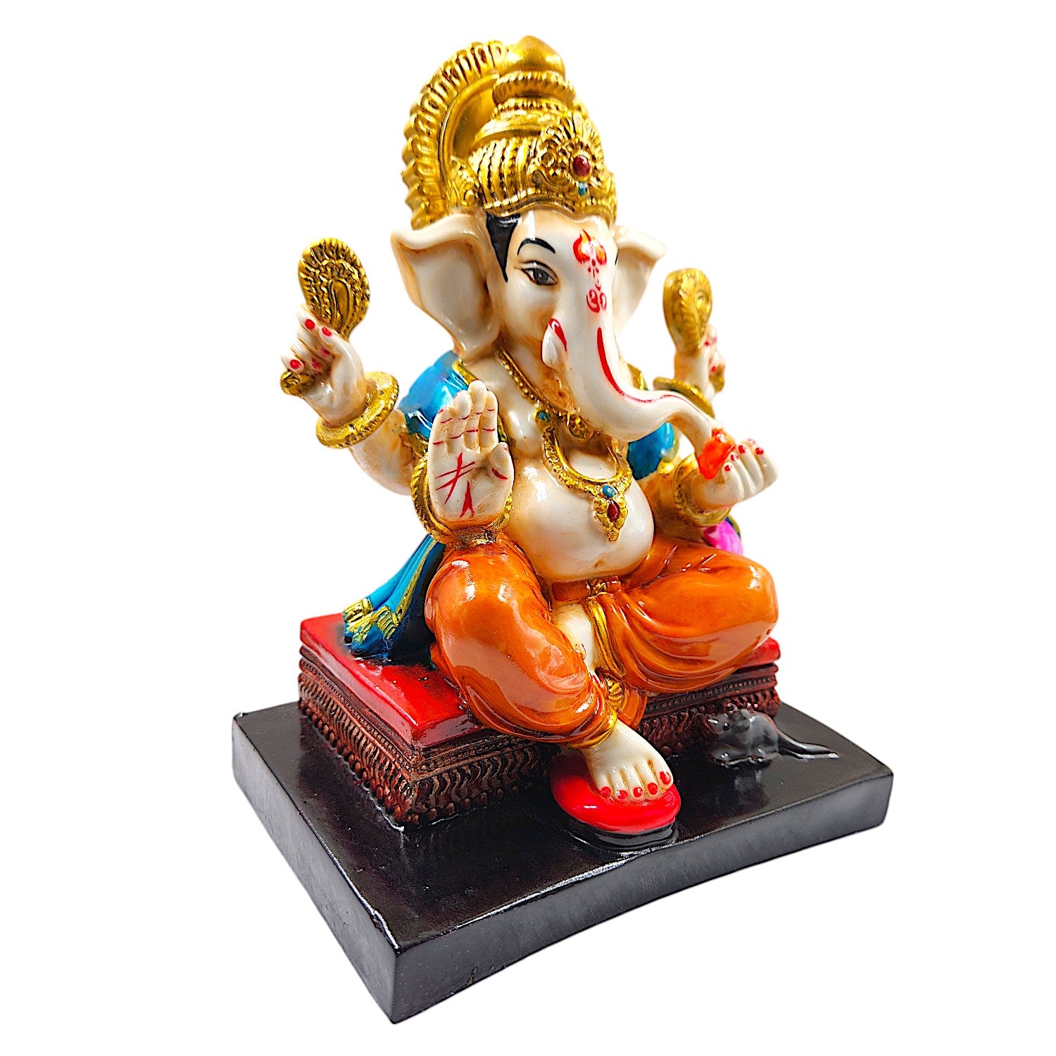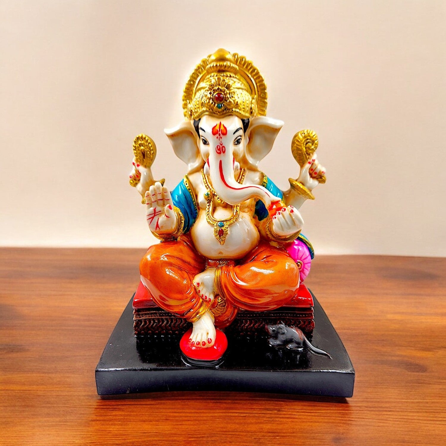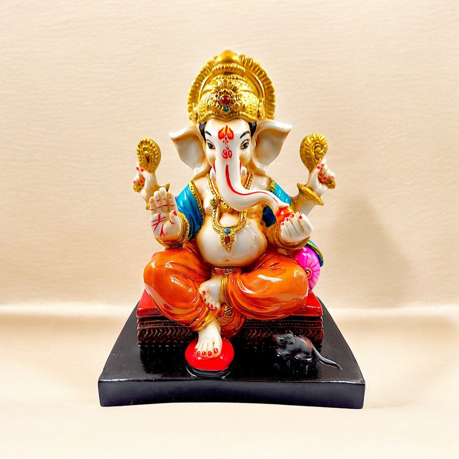 One-of-a-kind, this Ganesha idol is skillfully crafted from durable resin. A heartwarming gift for family and friends, brightening up any nook, workspace or spiritual corner. Our beautiful Ganesh idol adds spiritual grace to your home décor and makes an ideal Diwali or housewarming gift. Divine Lord Ganesha: A gracefully sculpted figurine of Lord Ganesha, revered as the remover of obstacles, the patron of arts and sciences, and the bestower of excellent fortune. Vibrant Hand- Detailing: Adorned with a lively palette of colors, including striking blue, pink, and orange robes, detailed gold accents on the mukut and ornaments, bringing the figurine to life. Fortunate Home and Office Home Decor: Perfect for your puja room, living room, office desk, or entryway, radiating positive energy and a sense of sacred festivity. Joyful Gifting Choice: A wonderful and spiritual gift for housewarmings, festivals (like Ganesh Chaturthi, Diwali), weddings, new ventures, or for anyone you wish to bless with excellent fortune. Durable Resin-Crafted Material: Expertly crafted from resilient and long- resin-crafted, ensuring the figurine' detailed details and vibrant colors are preserved for years to come. Emblem of Prosperity and Wisdom: Placing this figurine in your space is believed to attract wealth, success, and intellectual growth. Stable and Refined Base: Comes with a sturdy, often contrasting, base (like black or red), providing stability and enhancing its display. Festive and Welcoming Aura: The bright colours instantly create a celebratory and inviting atmosphere, perfect for Indian homes. Artistic Craftsmanship: Each colour application is a testament to the artisan' skill, making every figurine a one-of-a-kind piece of art. Includes Mushak (Mouse): (If applicable, as seen in image_9ae69b. Some variations include Mushak, Ganesha' loyal Vahana, symbolizing humility and diligence. Brightens Any Corner: Its cheerful presence can instantly uplift the mood and aesthetic of any room, even in shaded areas. Designed to complement modern and traditional interiors. Perfect for devotees looking for orange colour ganesh murti, orange colour ganpati and ganesha with laptop, this Ganesh statue brings blessings and elegance to your space.