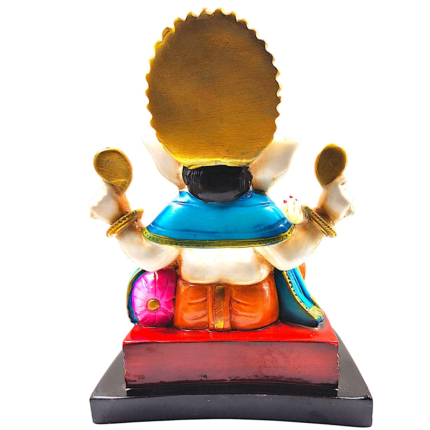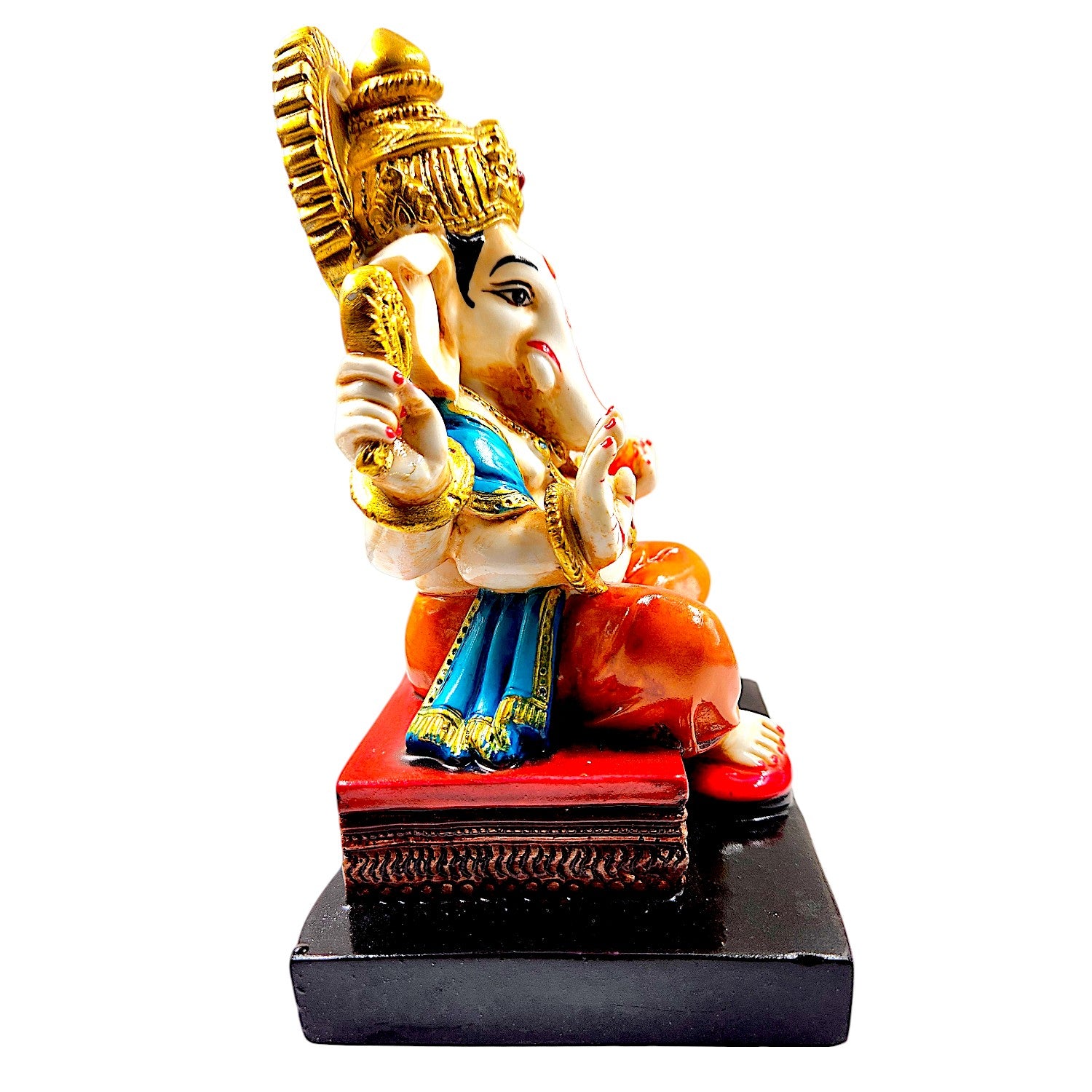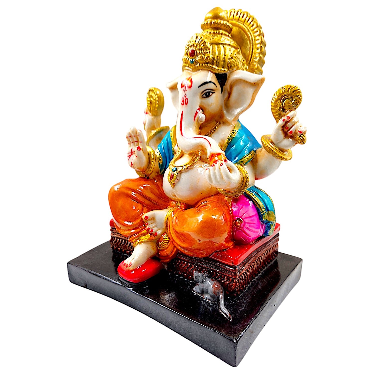 One-of-a-kind, this Ganesha idol is skillfully crafted from durable resin. A heartwarming gift for family and friends, brightening up any nook, workspace or spiritual corner. Our beautiful Ganesh idol adds spiritual grace to your home décor and makes an ideal Diwali or housewarming gift. Divine Lord Ganesha: A gracefully sculpted figurine of Lord Ganesha, revered as the remover of obstacles, the patron of arts and sciences, and the bestower of excellent fortune. Vibrant Hand- Detailing: Adorned with a lively palette of colors, including striking blue, pink, and orange robes, detailed gold accents on the mukut and ornaments, bringing the figurine to life. Fortunate Home and Office Home Decor: Perfect for your puja room, living room, office desk, or entryway, radiating positive energy and a sense of sacred festivity. Joyful Gifting Choice: A wonderful and spiritual gift for housewarmings, festivals (like Ganesh Chaturthi, Diwali), weddings, new ventures, or for anyone you wish to bless with excellent fortune. Durable Resin-Crafted Material: Expertly crafted from resilient and long- resin-crafted, ensuring the figurine' detailed details and vibrant colors are preserved for years to come. Emblem of Prosperity and Wisdom: Placing this figurine in your space is believed to attract wealth, success, and intellectual growth. Stable and Refined Base: Comes with a sturdy, often contrasting, base (like black or red), providing stability and enhancing its display. Festive and Welcoming Aura: The bright colours instantly create a celebratory and inviting atmosphere, perfect for Indian homes. Artistic Craftsmanship: Each colour application is a testament to the artisan' skill, making every figurine a one-of-a-kind piece of art. Includes Mushak (Mouse): (If applicable, as seen in image_9ae69b. Some variations include Mushak, Ganesha' loyal Vahana, symbolizing humility and diligence. Brightens Any Corner: Its cheerful presence can instantly uplift the mood and aesthetic of any room, even in shaded areas. Designed to complement modern and traditional interiors. Perfect for devotees looking for orange colour ganesh murti, orange colour ganpati and ganesha with laptop, this Ganesh statue brings blessings and elegance to your space.
