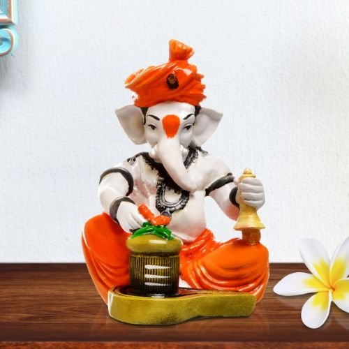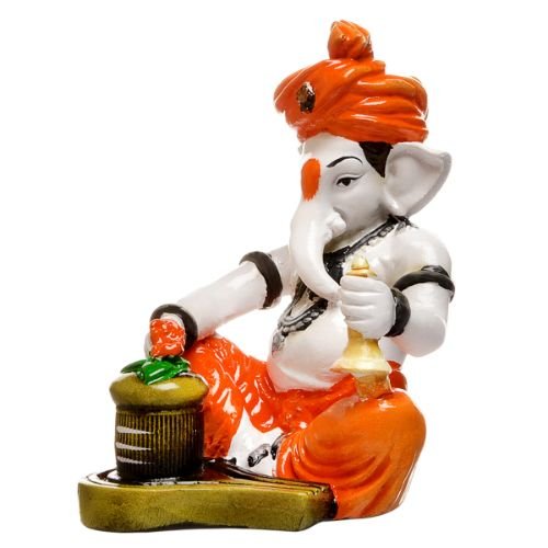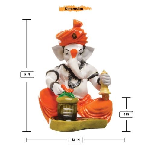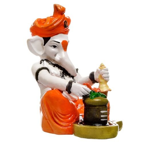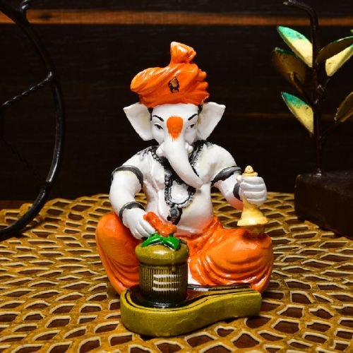 Unique and opulent, this Ganesha idol is beautifully made from premium materials. An excellent choice for spiritual and decorative gifting, gracefully decorating your table, shelf or altar. Our beautiful Ganesh idol adds spiritual grace to your home décor and makes an ideal Diwali or housewarming gift. Divine Synergy of Ganesha and Shivling: Features Lord Ganesha alongside a sacred Shivling, representing the powerful union of wisdom, prosperity, and the ultimate divine energy of Lord Shiva. Vibrant and Classic Hues: Adorned with a lively orange dhoti and turban, gracefully contrasting with the white body, creating a classic yet eye- spiritual accent. Symbolic Bell and Trishul: Ganesha holds a classic bell, symbolizing auspiciousness and devotion, while the Shivling is adorned with a miniature Trishul, representing divine power. Detailed Craftsmanship: Every detail, from Ganesha' expressive face to the subtle textures on the Shivling and the golden accents, is meticulously sculpted, showcasing fine artistry. Perfect for Sacred Spaces: Profoundly Fortunate Gift: An exceptional and heartfelt present for housewarmings, Mahashivratri, Ganesh Chaturthi, or for anyone seeking comprehensive divine grace and spiritual well- Infuses Your Space with Purity: This one-of-a-kind figurine serves as a constant source of inspiration and purity, radiating positive vibrations and a deep sense of spiritual completeness throughout your home. Designed to complement modern and traditional interiors. Perfect for devotees looking for orange colour ganesh murti, orange colour ganpati and ganesha with laptop, this Ganesh statue brings blessings and elegance to your space.