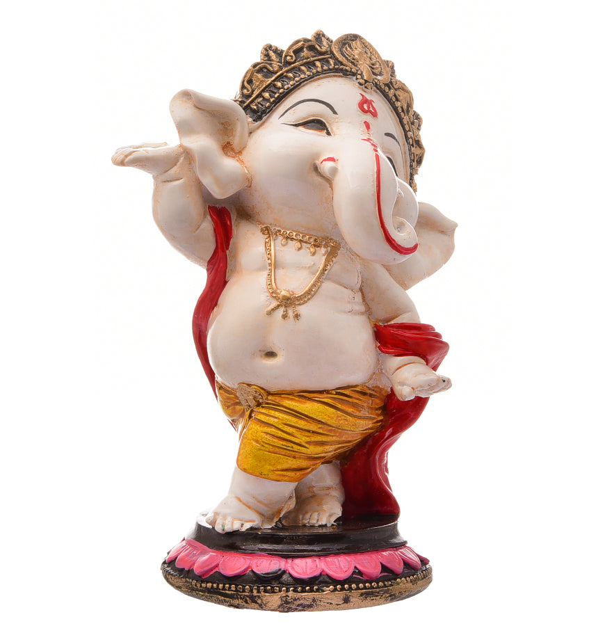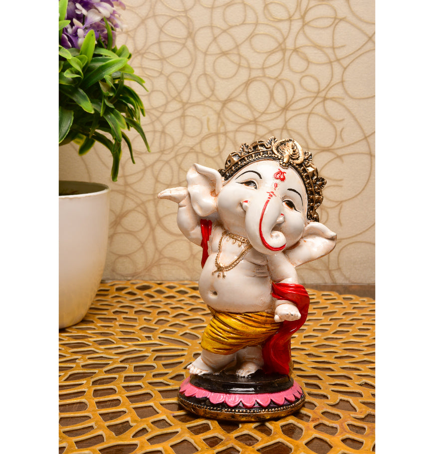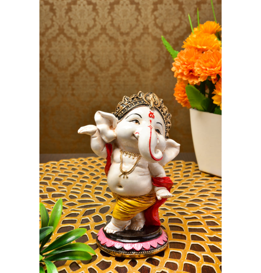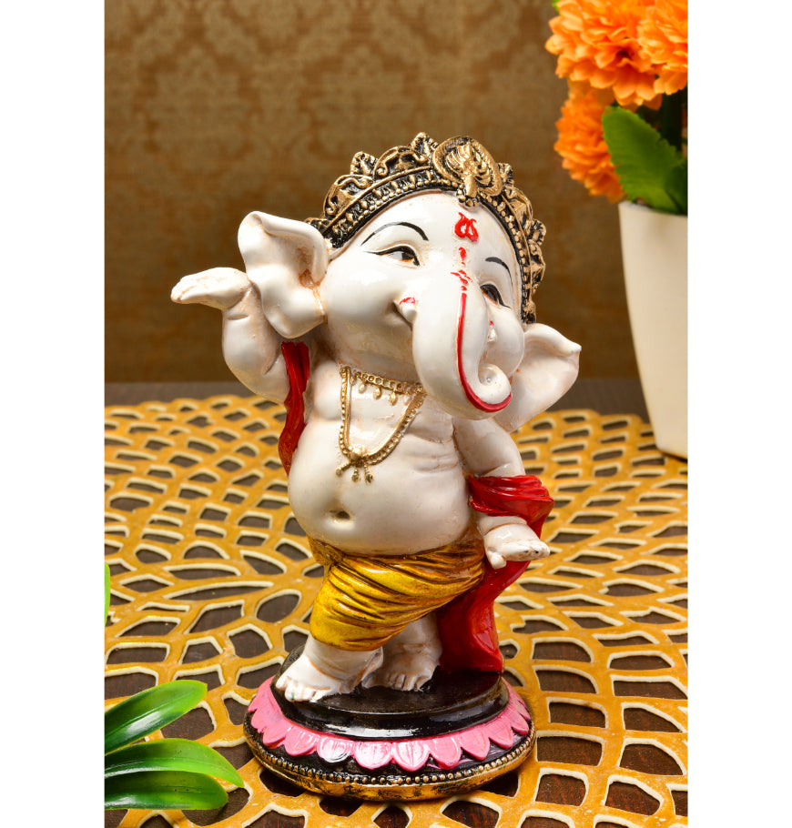 Distinctive and current, this Ganesha idol is expertly crafted from resin-crafted. A meaningful gift for diwali or special occasions, enhancing your office desk, bookshelf or meditation area. Our beautiful Ganesh idol adds spiritual grace to your home décor and makes an ideal Diwali or housewarming gift. Vibrant and Playful Design: This charming "adorable ganpati small" figurine features a pristine white body with vibrant pink ears, trunk tip, and a prominent red tilak. His yellow dhoti with red accents and golden jewelry add a lively and festive touch, making it a delightful piece for any setting in Mumbai. Energetic Dancing Pose: Lord Ganesha is captured in a dynamic dancing posture, with one leg raised and his arms in expressive poses, radiating joy and vitality. This energetic depiction signifies celebration, enthusiasm, and the joyful removal of obstacles, making it a one-of-a-kind and captivating figurine. Detailed Golden Crown and Jewelry: A gracefully sculpted golden crown adorns his head, and delicate golden chains and bangles decorate his body, adding an refined and divine touch to the figurine. Prominent Red Tilak and Expressive Face: A striking red tilak on his forehead and his wide, expressive eyes and playful smile enhance the figurine' endearing and benevolent presence. Emblem of Joy, Vitality and Positive Energy: This dancing Ganesha embodies pure happiness, boundless energy, and the power to overcome challenges with a light heart. It is believed to infuse the space with positive vibrations and optimism. Invites Auspiciousness and Harmony: The delightful presence of this Ganesha is believed to attract immense positive energy, foster a harmonious atmosphere, and bring a sense of peace and well- to your surroundings. Thoughtful and One-Of-A-Kind Gift: A perfect and meaningful gift for housewarmings, birthdays, festivals like Ganesh Chaturthi and Diwali, or for anyone who cherishes spiritual, artistic, and one-of-a-kind decor, a truly cherished present in Mumbai. Designed to complement modern and traditional interiors. Perfect for devotees looking for orange colour ganesh murti, orange colour ganpati and ganesha with laptop, this Ganesh statue brings blessings and elegance to your space.