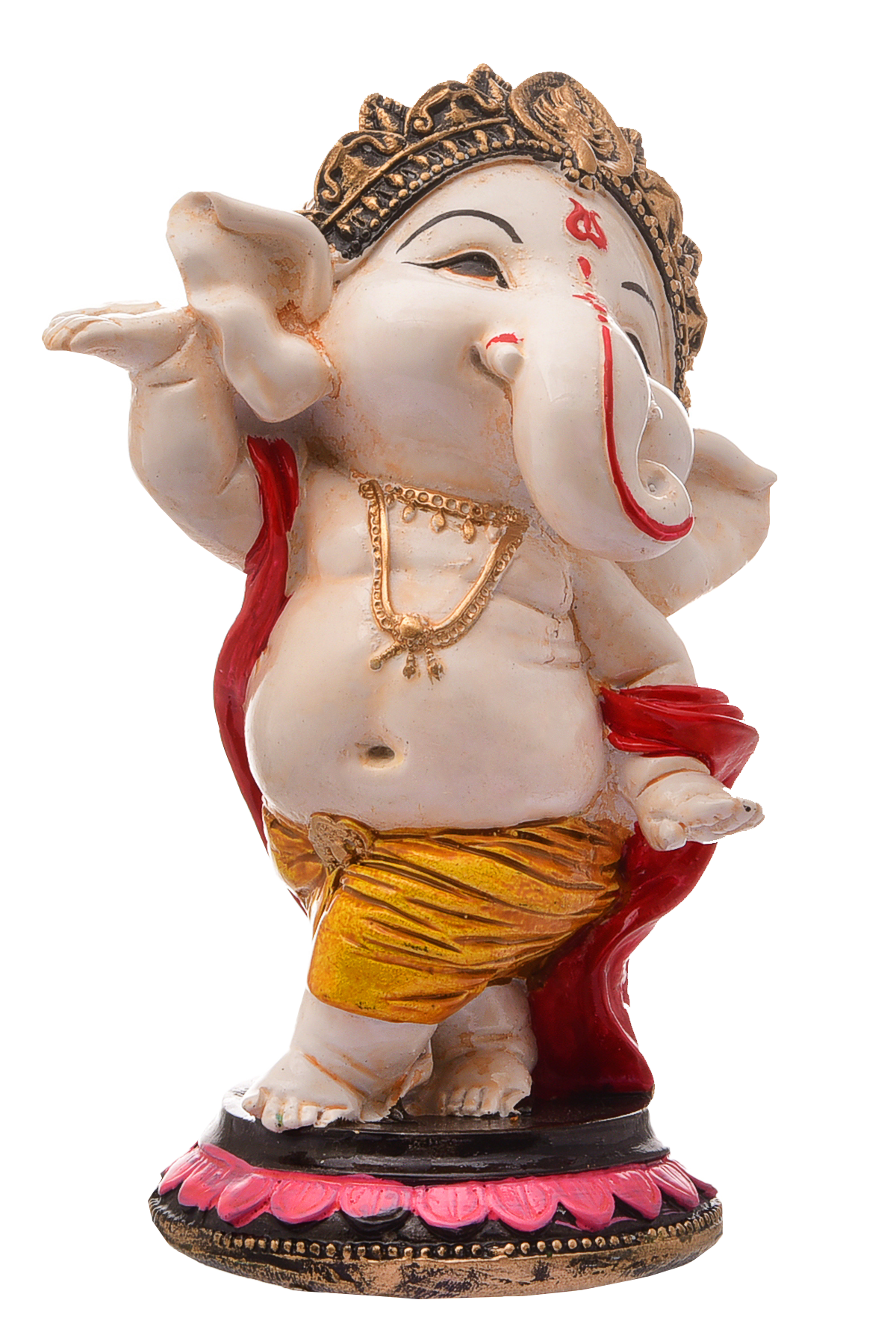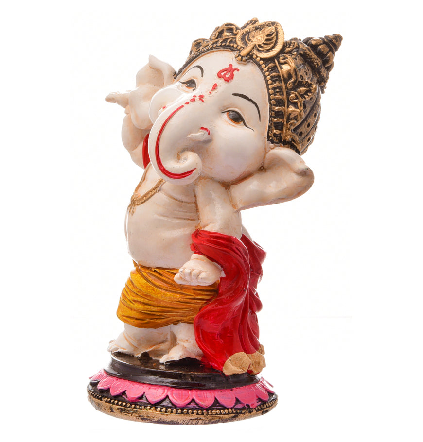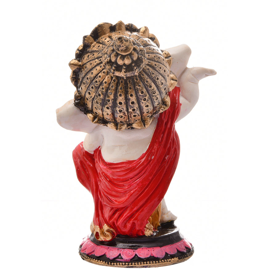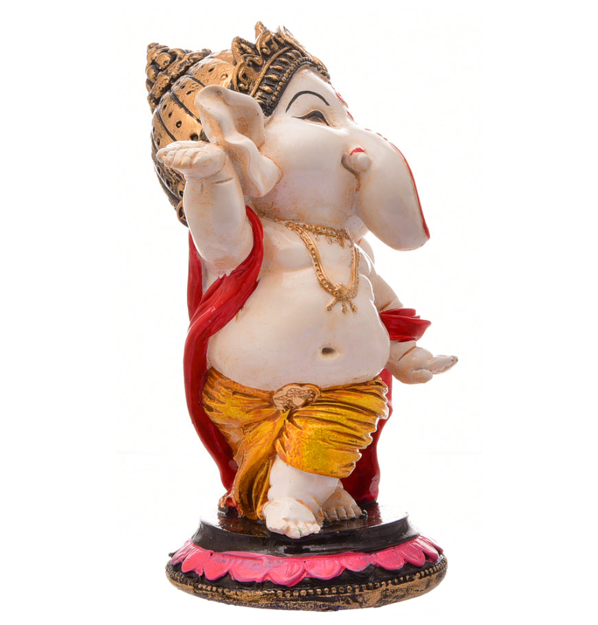 Distinctive and current, this Ganesha idol is expertly crafted from resin-crafted. A meaningful gift for diwali or special occasions, enhancing your office desk, bookshelf or meditation area. Our beautiful Ganesh idol adds spiritual grace to your home décor and makes an ideal Diwali or housewarming gift. Vibrant and Playful Design: This charming "adorable ganpati small" figurine features a pristine white body with vibrant pink ears, trunk tip, and a prominent red tilak. His yellow dhoti with red accents and golden jewelry add a lively and festive touch, making it a delightful piece for any setting in Mumbai. Energetic Dancing Pose: Lord Ganesha is captured in a dynamic dancing posture, with one leg raised and his arms in expressive poses, radiating joy and vitality. This energetic depiction signifies celebration, enthusiasm, and the joyful removal of obstacles, making it a one-of-a-kind and captivating figurine. Detailed Golden Crown and Jewelry: A gracefully sculpted golden crown adorns his head, and delicate golden chains and bangles decorate his body, adding an refined and divine touch to the figurine. Prominent Red Tilak and Expressive Face: A striking red tilak on his forehead and his wide, expressive eyes and playful smile enhance the figurine' endearing and benevolent presence. Emblem of Joy, Vitality and Positive Energy: This dancing Ganesha embodies pure happiness, boundless energy, and the power to overcome challenges with a light heart. It is believed to infuse the space with positive vibrations and optimism. Invites Auspiciousness and Harmony: The delightful presence of this Ganesha is believed to attract immense positive energy, foster a harmonious atmosphere, and bring a sense of peace and well- to your surroundings. Thoughtful and One-Of-A-Kind Gift: A perfect and meaningful gift for housewarmings, birthdays, festivals like Ganesh Chaturthi and Diwali, or for anyone who cherishes spiritual, artistic, and one-of-a-kind decor, a truly cherished present in Mumbai. Designed to complement modern and traditional interiors. Perfect for devotees looking for orange colour ganesh murti, orange colour ganpati and ganesha with laptop, this Ganesh statue brings blessings and elegance to your space.