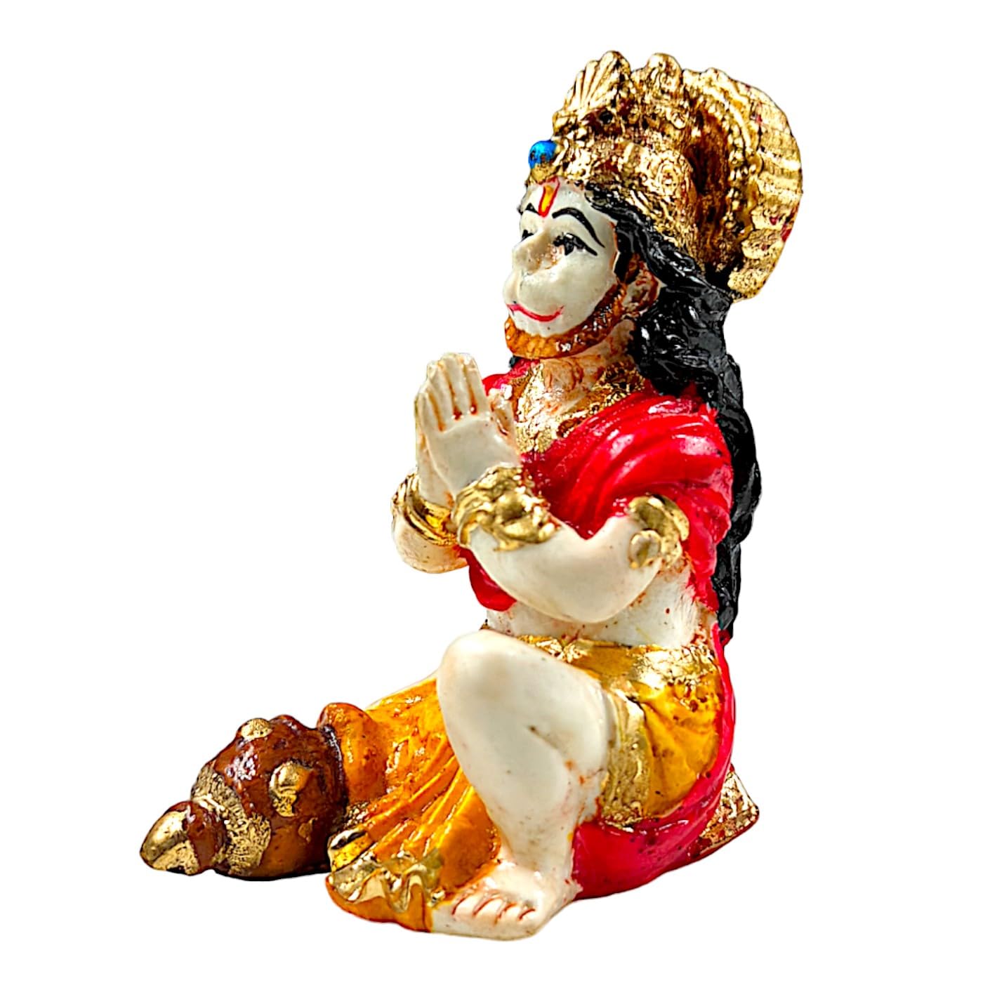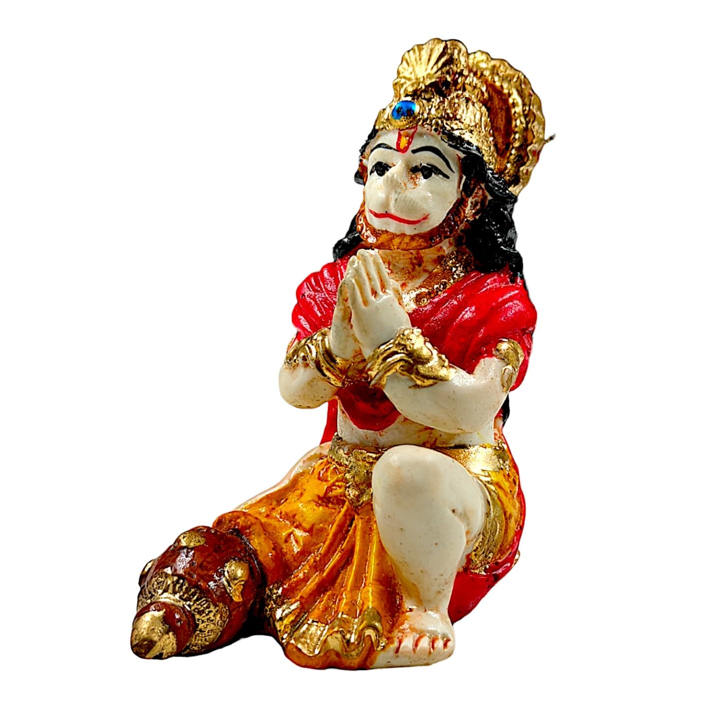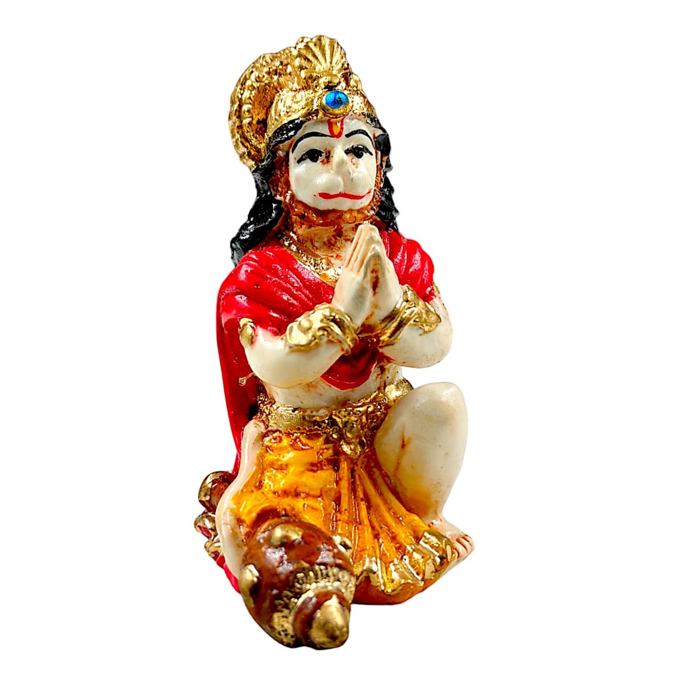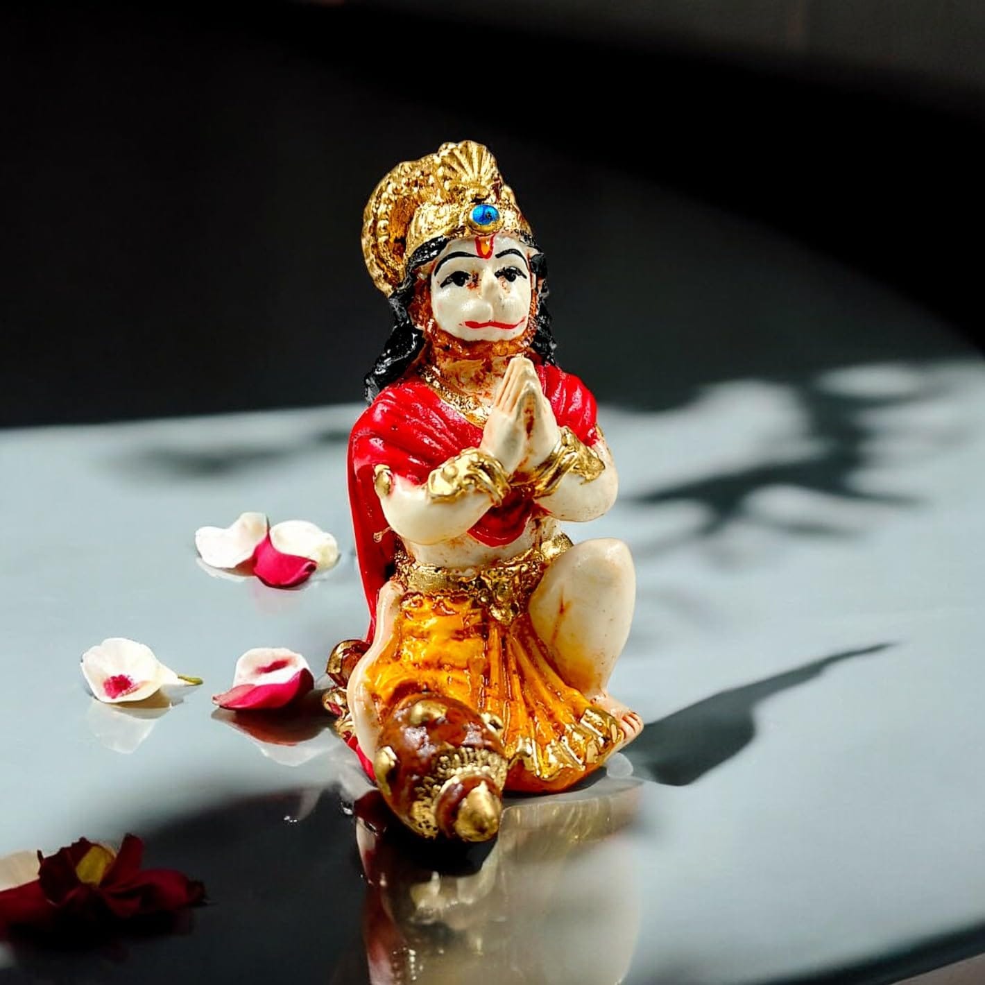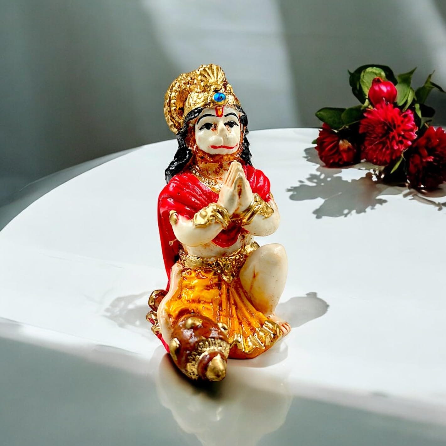 Elegant and fashionable, this artistic figurine is skillfully crafted from durable resin. Makes a charming present for loved ones, adding elegance to your hallway, bedroom or meditation corner. Celebrate devotion with this Hanuman idol – a striking home décor piece and a meaningful gift for festivals like Diwali and Navaratri. Emblem of Strength and Devotion: Lord Hanuman represents immense strength, unwavering courage, and ultimate devotion (Bhakti). His kneeling posture signifies humility and deep reverence, inspiring these qualities in your life. Vibrantly Hand- Resin-Crafted: Meticulously sculpted from high- durable resin-crafted and adorned with rich, hand- colours, highlighting every detailed detail of his attire, ornaments, and powerful form. Detailed and Expressive Details: From the serene expression on his face to the finely rendered ornaments and the dynamic posture, every aspect showcases exceptional artistry and devotion. Home and Pooja Decor: The presence of Lord Hanuman is believed to ward off negativity and bring peace, prosperity, and success. Meaningful Spiritual Gifting: A deeply cherished and fortunate gift for housewarmings, festivals like Hanuman Jayanti and Diwali, new ventures, or for anyone seeking blessings of strength, protection, and divine grace. Makes an eye-catching addition to your office or home. An excellent choice for hanuman home decor, hanuman gift ideas and panchmukhi hanuman for entrance, this Hanuman idol blends sacred symbolism with striking design—