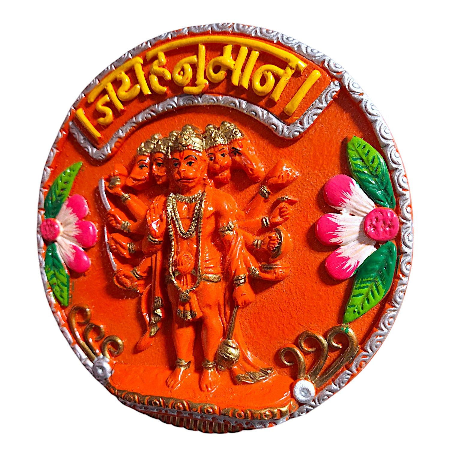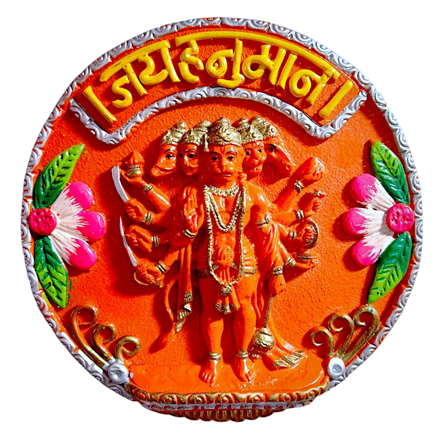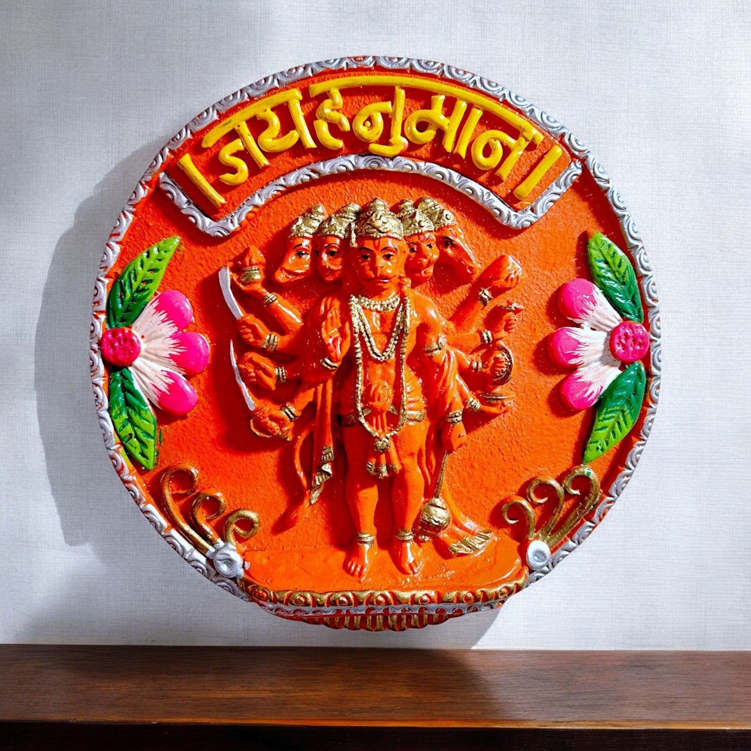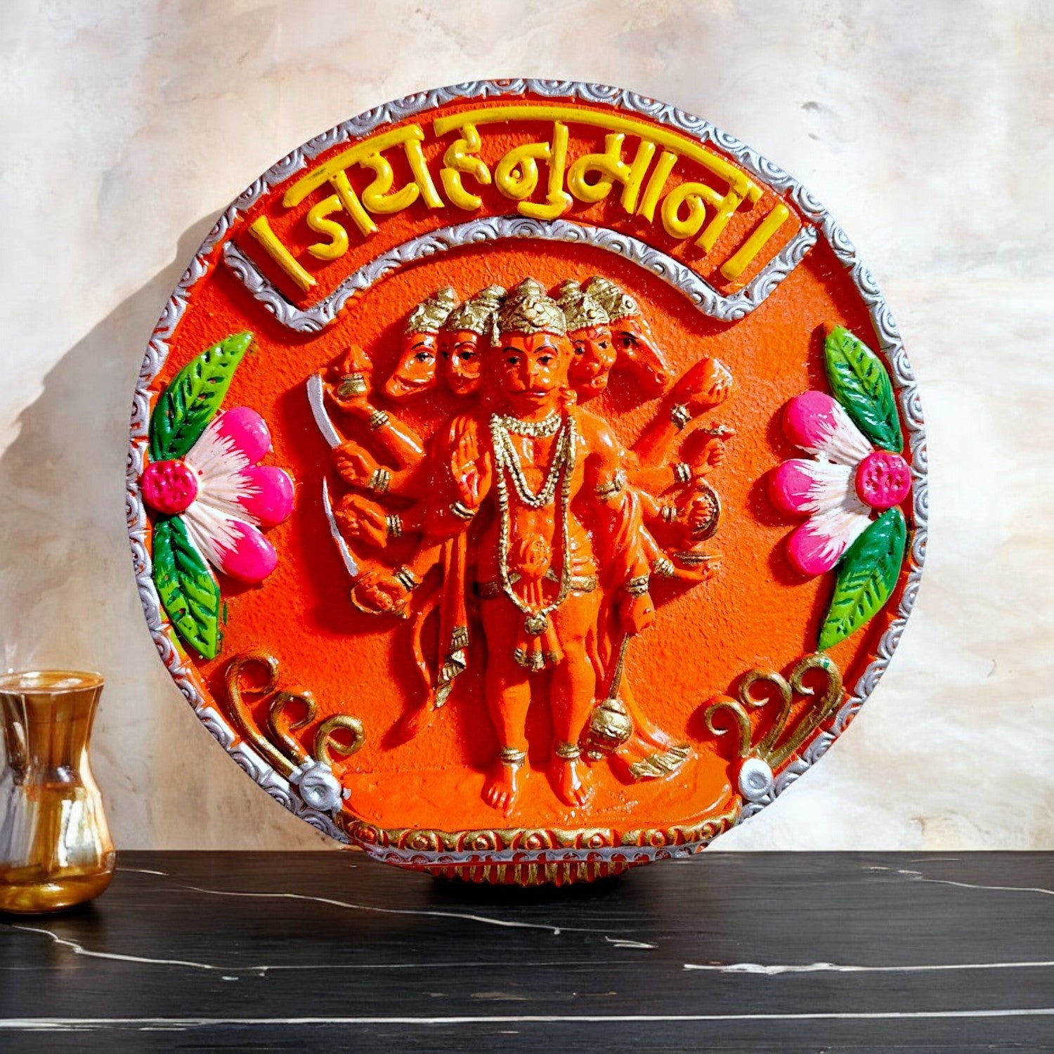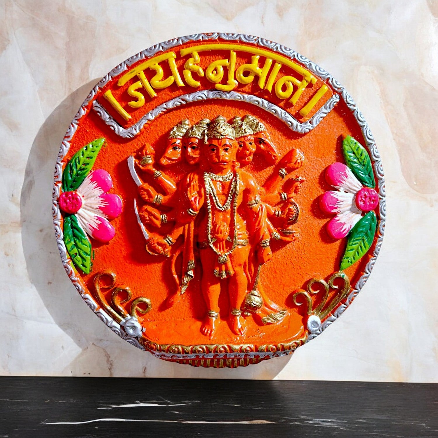 Sophisticated, this wall décor piece is expertly crafted from resin-crafted. A thoughtful gift for any occasion, accentuating your living room, office or prayer space. Celebrate devotion with this Hanuman idol – a striking home décor piece and a meaningful gift for festivals like Diwali and Navaratri. Divine Panchmukhi Hanuman Design: Features Lord Hanuman in his powerful five- form (Panchmukhi) a emblem of protection, strength, and devotion. Vibrant Hand- Finish: Eye- orange base with detailed floral and deity details, highlighted with silver accents and the sacred text "Jai Hanuman". High-Quality Resin-Crafted Craftsmanship: Made with high- resin-crafted for durability, easy maintenance, and a rich, detailed finish. Wall- Religious Decoration: Designed as a round wall plaque perfect for pooja rooms, home entrances, office walls, or temples. Enhances Spiritual Vibes: Invokes positive energy and divine blessings, making your space spiritually aligned and visually captivating. Ideal Spiritual Gift: A meaningful gift choice for festivals, housewarmings, or religious celebrations suitable for both personal and corporate gifting. Makes an eye-catching addition to your office or home. An excellent choice for hanuman home decor, hanuman gift ideas and panchmukhi hanuman for entrance, this Hanuman idol blends sacred symbolism with striking design—