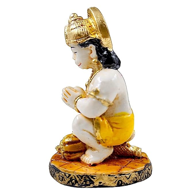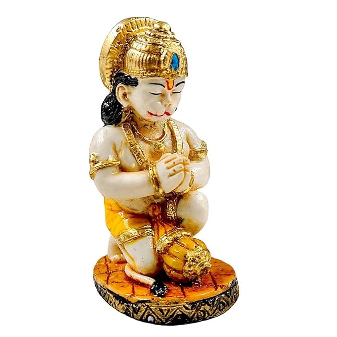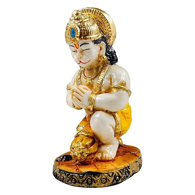 Classic and lavish, this decorative accent is meticulously crafted from resin-made. A wonderful housewarming or festival gift, decorating your dining room, entryway or home temple. Celebrate devotion with this Hanuman idol – a striking home décor piece and a meaningful gift for festivals like Diwali and Navaratri. Adorable Kneeling Hanuman Design: Features Bajrangbali in a sweet child- form, hands folded in prayer, radiating innocence and devotion. Graceful Hand- Finish: Accented in golden and ivory tones for a regal and spiritual appeal. Luxury Resin Craftsmanship: Durable, lightweight, and easy to clean made to last as a timeless piece. Perfect for Any Sacred Space: Gift of Faith and Blessings: A thoughtful spiritual gift for birthdays, festivals, housewarmings, or little showers. Emblem of Strength and Humility: Little Hanuman is revered for his loyalty, courage, and divine energy perfect for spiritual upliftment. Compact Yet Divine Presence: Small enough for any space, but radiates a big impact in energy and aesthetics. Bring charm and elegance to your décor. An excellent choice for hanuman home decor, hanuman gift ideas and panchmukhi hanuman for entrance, this Hanuman idol blends sacred symbolism with striking design—