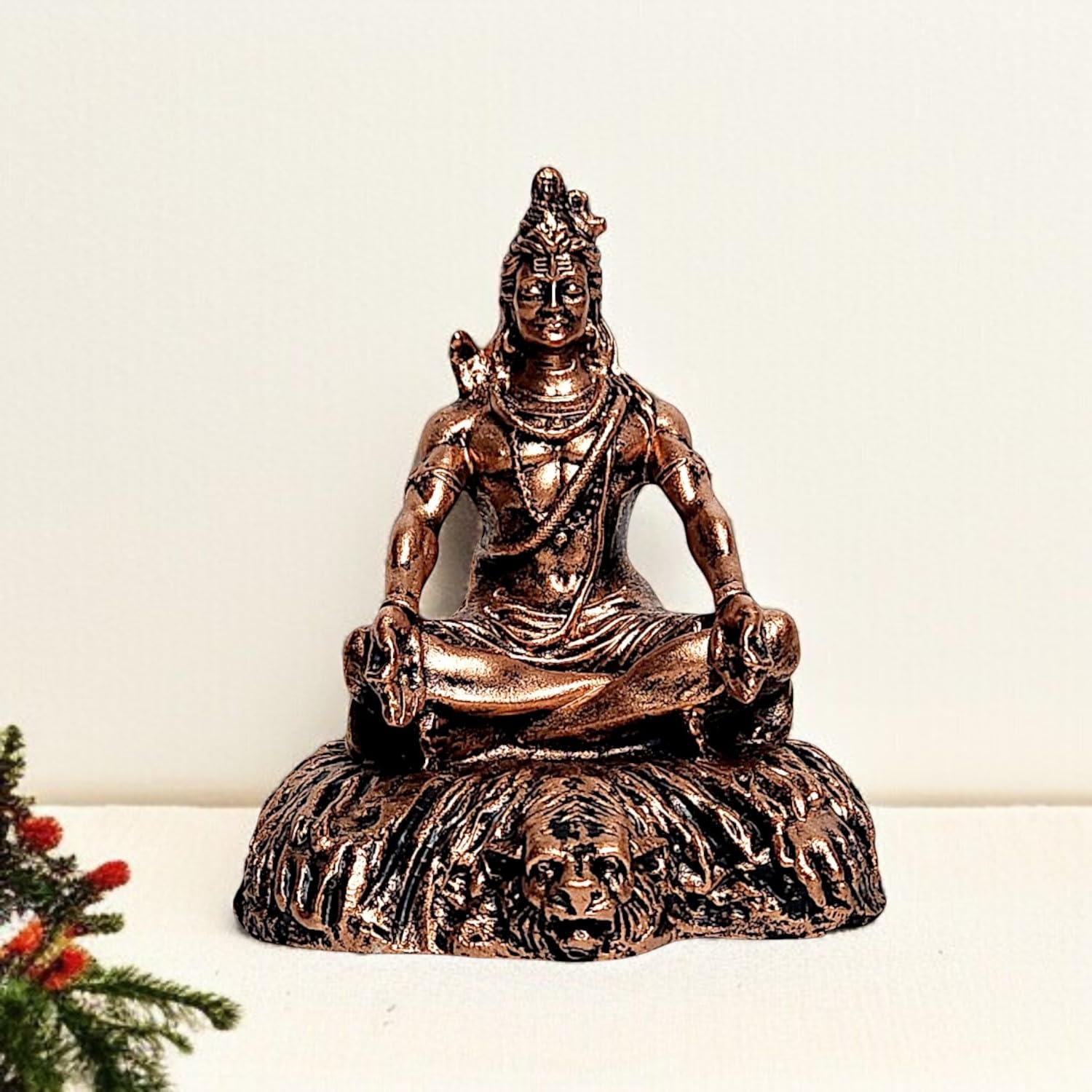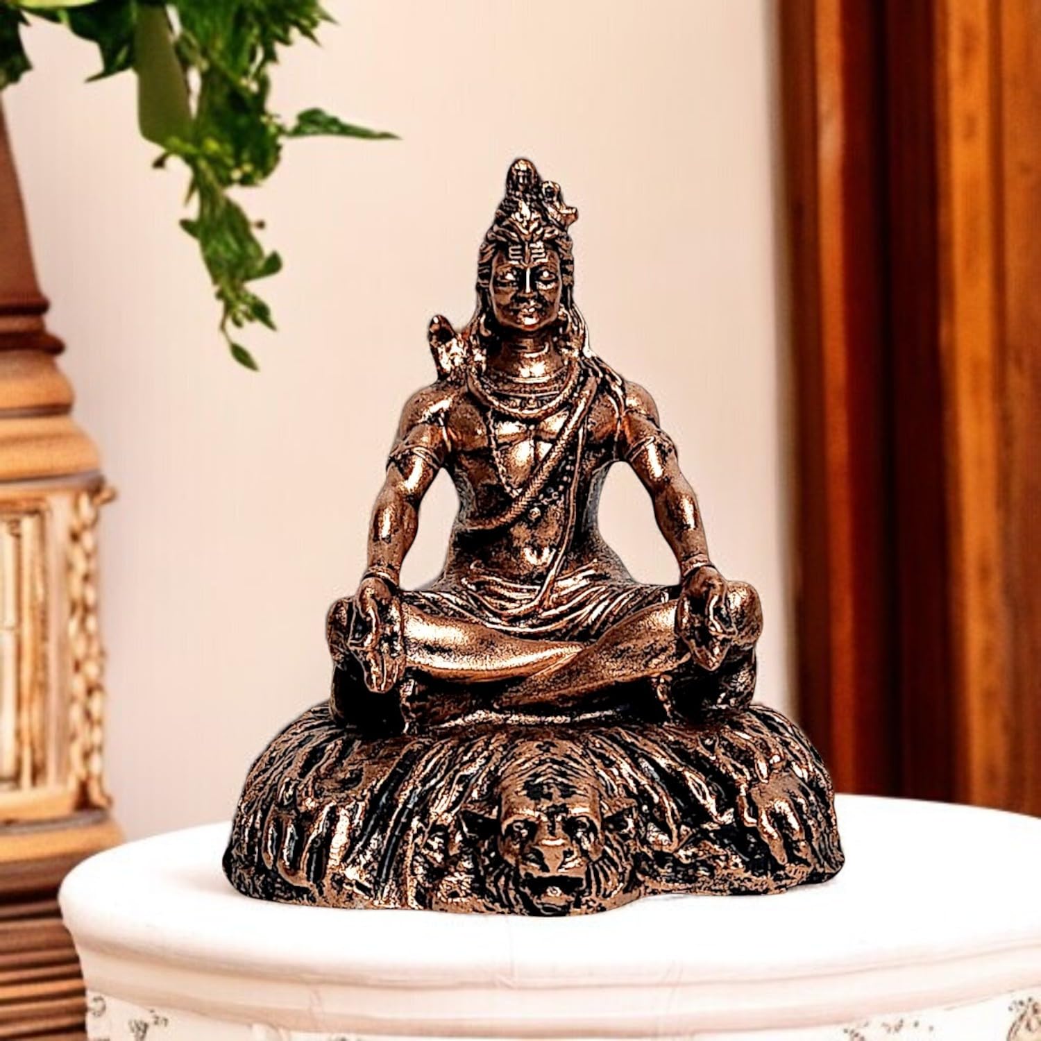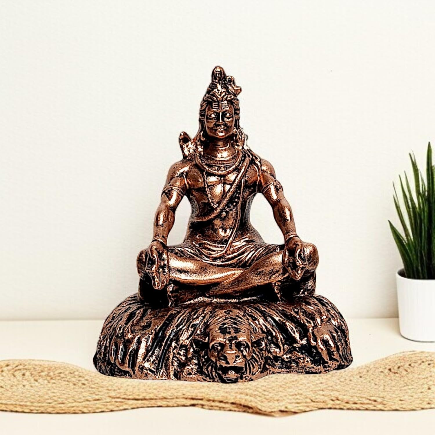 Expressive and modern, this artistic figurine is skillfully crafted from durable resin. A heartwarming gift for family and friends, brightening up any nook, workspace or spiritual corner. Transform your home décor with this stylish piece that also makes a perfect Diwali or housewarming gift. Meditative Lord Shiva Pose: Depicts Mahadev in deep meditation atop a sculpted base featuring a skull design, symbolizing detachment, transformation, and eternal wisdom. Refined Bronze Finish: Crafted from high-quality resin-crafted and finished in antique bronze tones for a classic yet luxurious aesthetic that elevates any decor. Sacred Decor Accent: Powerful Spiritual Symbolism: Adorned with Shivas classic elements matted locks, Rudraksha beads, snake, and tiger skin this figurine exudes power, calm, and protection. Perfect for Gifting: A thoughtful choice for Maha Shivratri, housewarmings, weddings, or as a spiritual gift for loved ones on meaningful occasions. Compact Yet Majestic: Sturdy and well- design that fits gracefully on altars, shelves, or table tops without overwhelming your space. An elegant addition to your home or workspace. A versatile décor piece for those searching for decor kart, homedecor.cart and home decor.kart, perfect for elevating your home style or gifting.