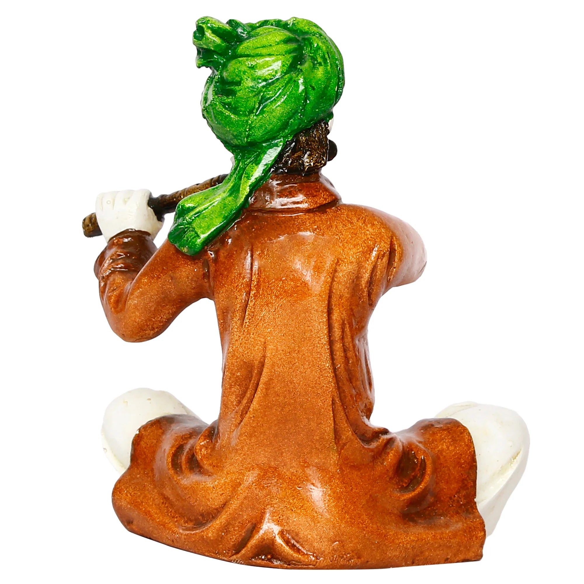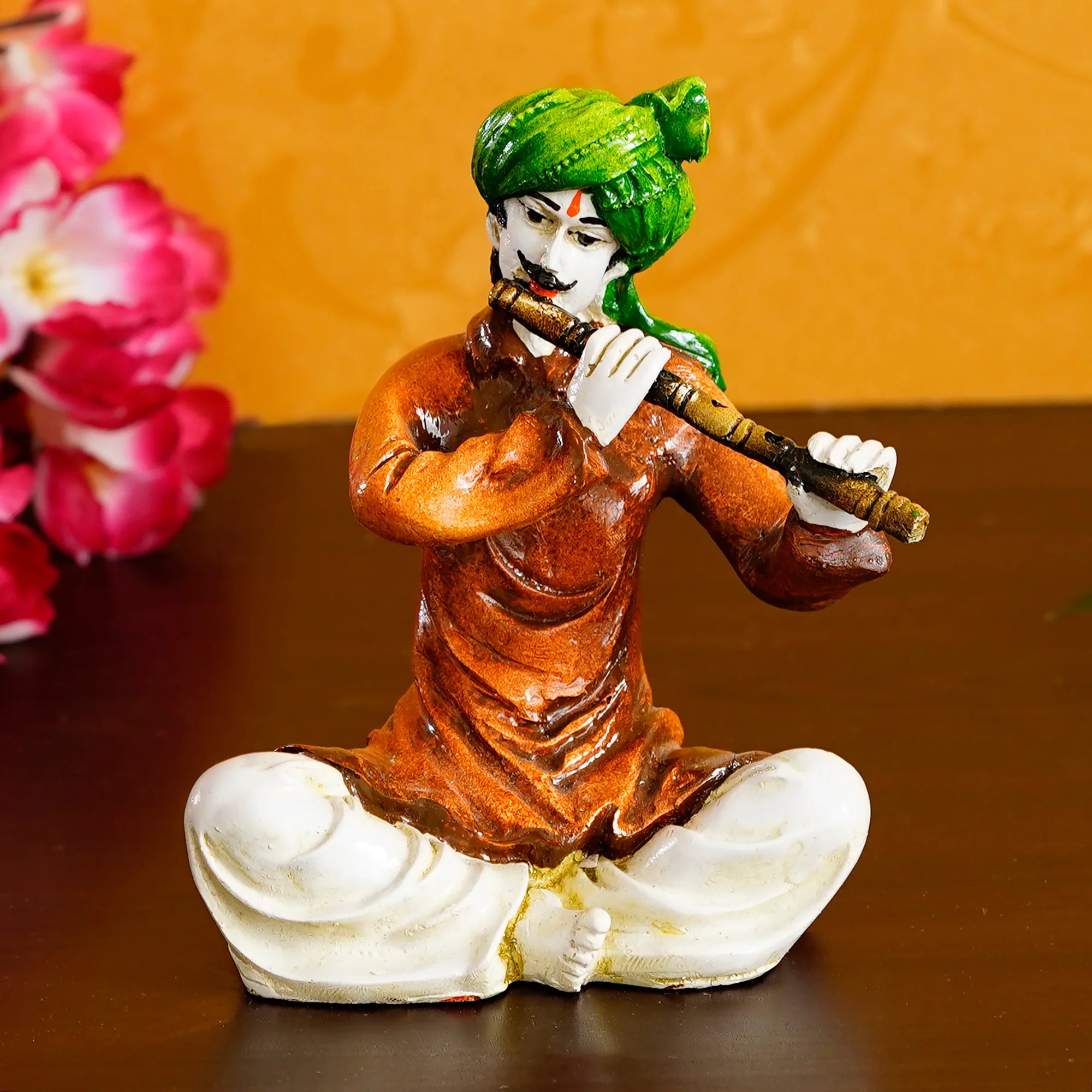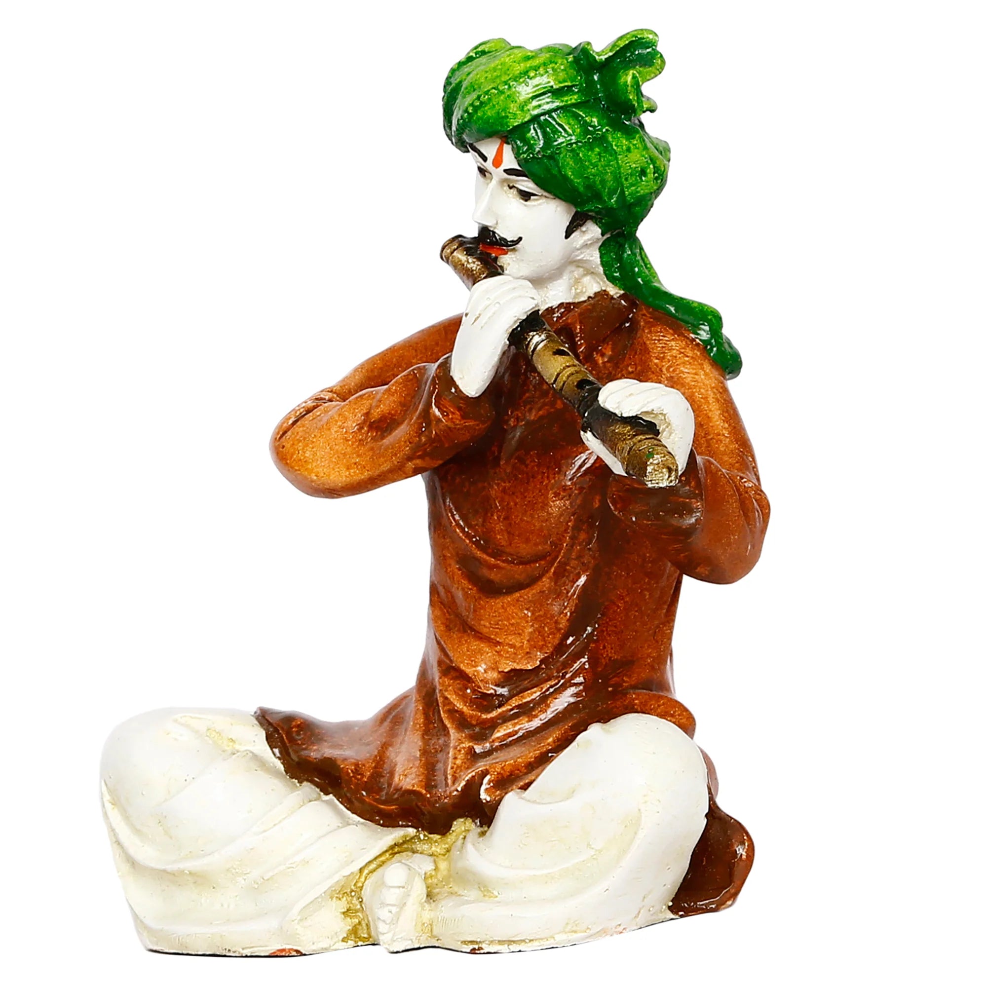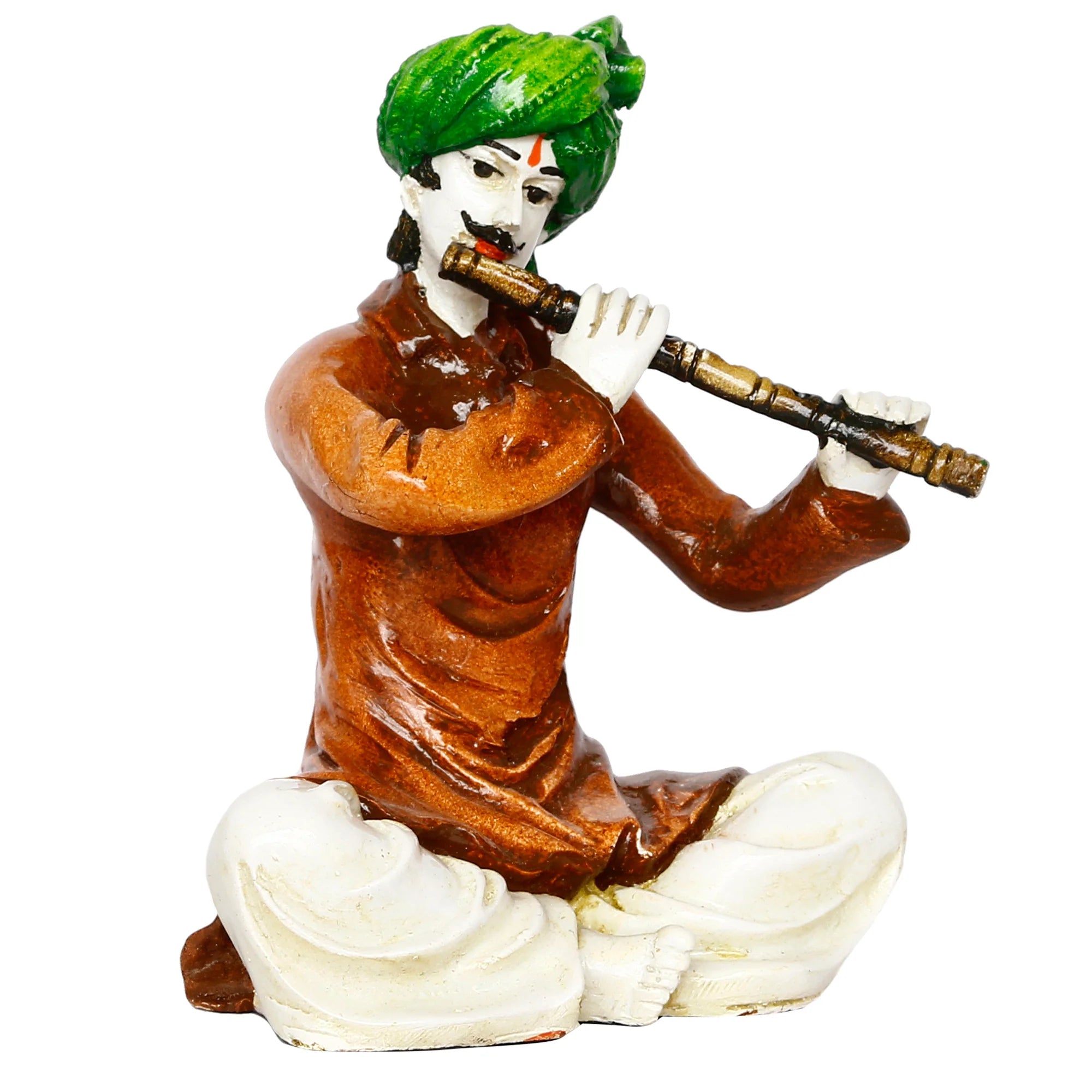 Sophisticated and current, this Rajasthani figurine is meticulously crafted from resin-made. A wonderful housewarming or festival gift, decorating your dining room, entryway or home temple. Depicts a Rajasthani Man Playing Flute: This charming resin-crafted figurine showcases a seated man in classic Rajasthani attire playing a flute. Vibrantly Hand- The figurine is meticulously hand- with bright and authentic colors, bringing the cultural scene to life in your home. Authentic Rajasthani Dress: The man is dressed in characteristic Rajasthani clothing and a turban, adding to the cultural authenticity of the piece. for Culture and Music Lovers: Thoughtful and Cultural Gift: A distinctive and heartwarming gift for those who appreciate Indian folk art and music. Durable Resin-Crafted Craftsmanship: Made from high- resin-crafted, ensuring lasting beauty and detailed detailing in the figure and the instrument. Represents the Joy of Folk Music: This figurine embodies the serene and expressive nature often found in classic musical performances. Makes an eye-catching addition to your office or home. Appealing to searches for rajasthani figurines, rajasthani gifts for girls and rajasthani statue showpiece, this Rajasthani figurine makes a charming showpiece or gift that celebrates cultural artistry.