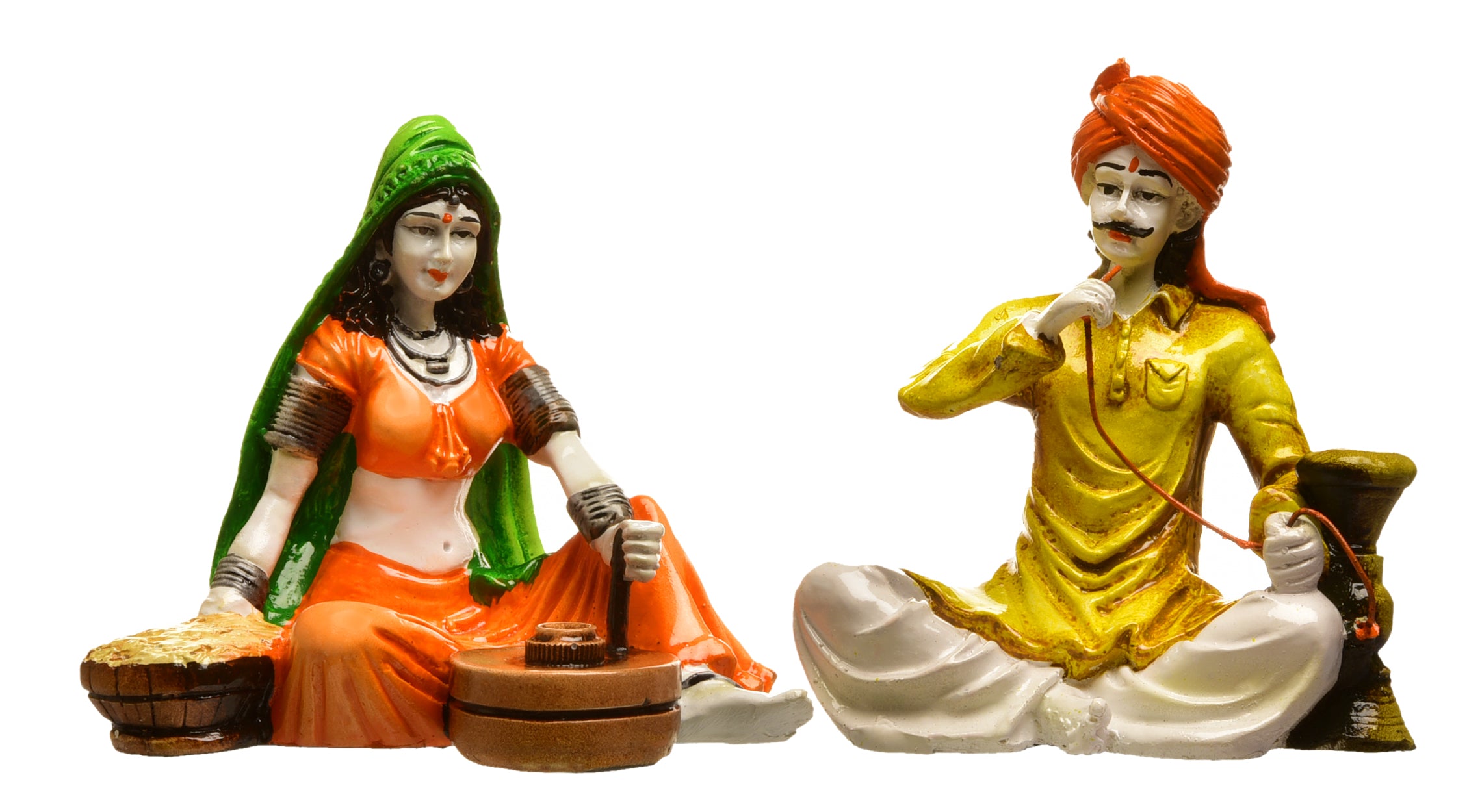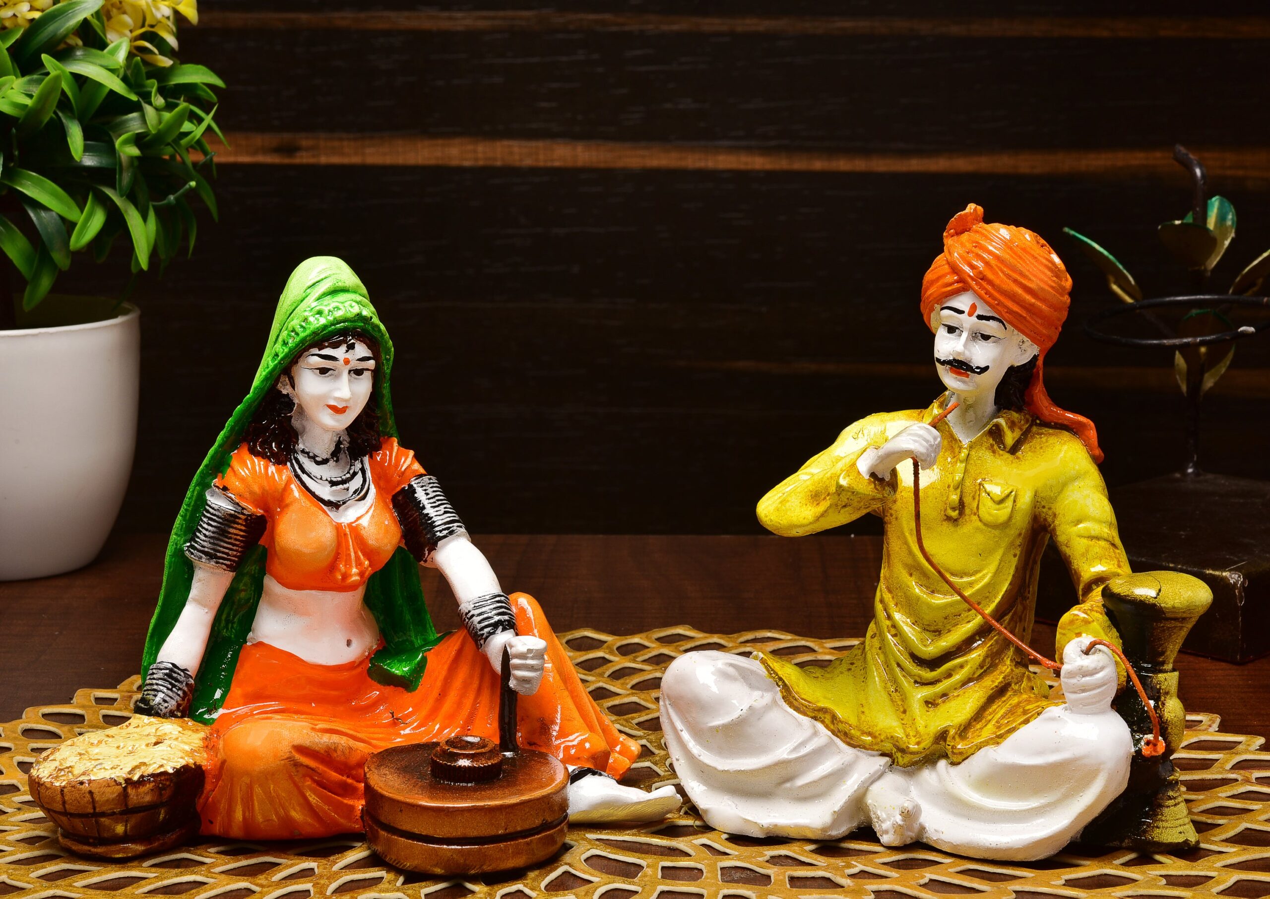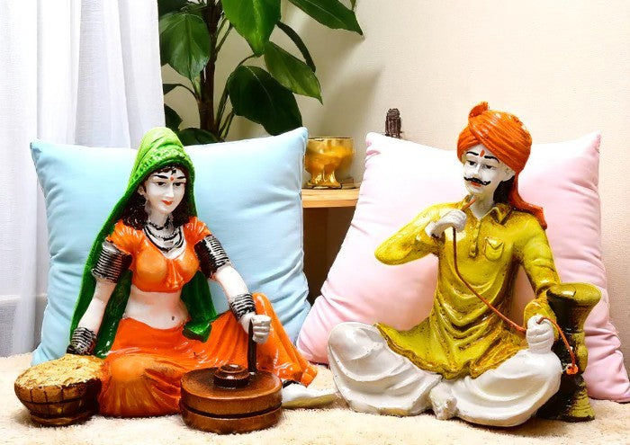 Luxurious and sophisticated, this Rajasthani figurine is skillfully crafted from durable resin. A heartwarming gift for family and friends, brightening up any nook, workspace or spiritual corner. Depicts Classic Rajasthani Activities: This charming resin-crafted set features a seated woman churning (likely butter or yogurt) and a seated man spinning thread, showcasing everyday village life. Vibrantly Hand- Each figurine is meticulously hand- with bright and lively colours, bringing the cultural scene to life in your home. Authentic Rajasthani Attire: The couple is dressed in characteristic Rajasthani clothing and headwear, adding to the cultural authenticity of the piece. Perfect for Cultural Home Home Decor: Thoughtful and One-Of-A-Kind Gift: A distinctive and heartwarming gift for those who appreciate Indian folk art and culture. Durable Resin-Crafted Craftsmanship: Made from high- resin-crafted, ensuring lasting beauty and detailed detailing in the figures and their tasks. Represents Daily Life in Rural India: This set offers a glimpse into the classic activities found in Rajasthani village life. Makes an eye-catching addition to your office or home. Appealing to searches for rajasthani figurines, rajasthani gifts for girls and rajasthani statue showpiece, this Rajasthani figurine makes a charming showpiece or gift that celebrates cultural artistry.